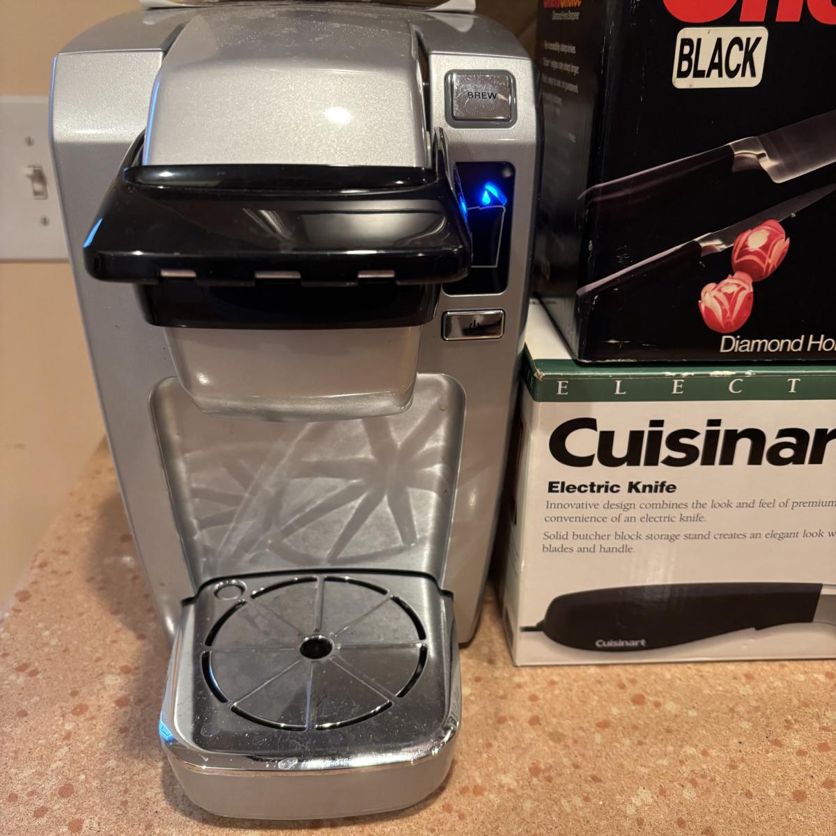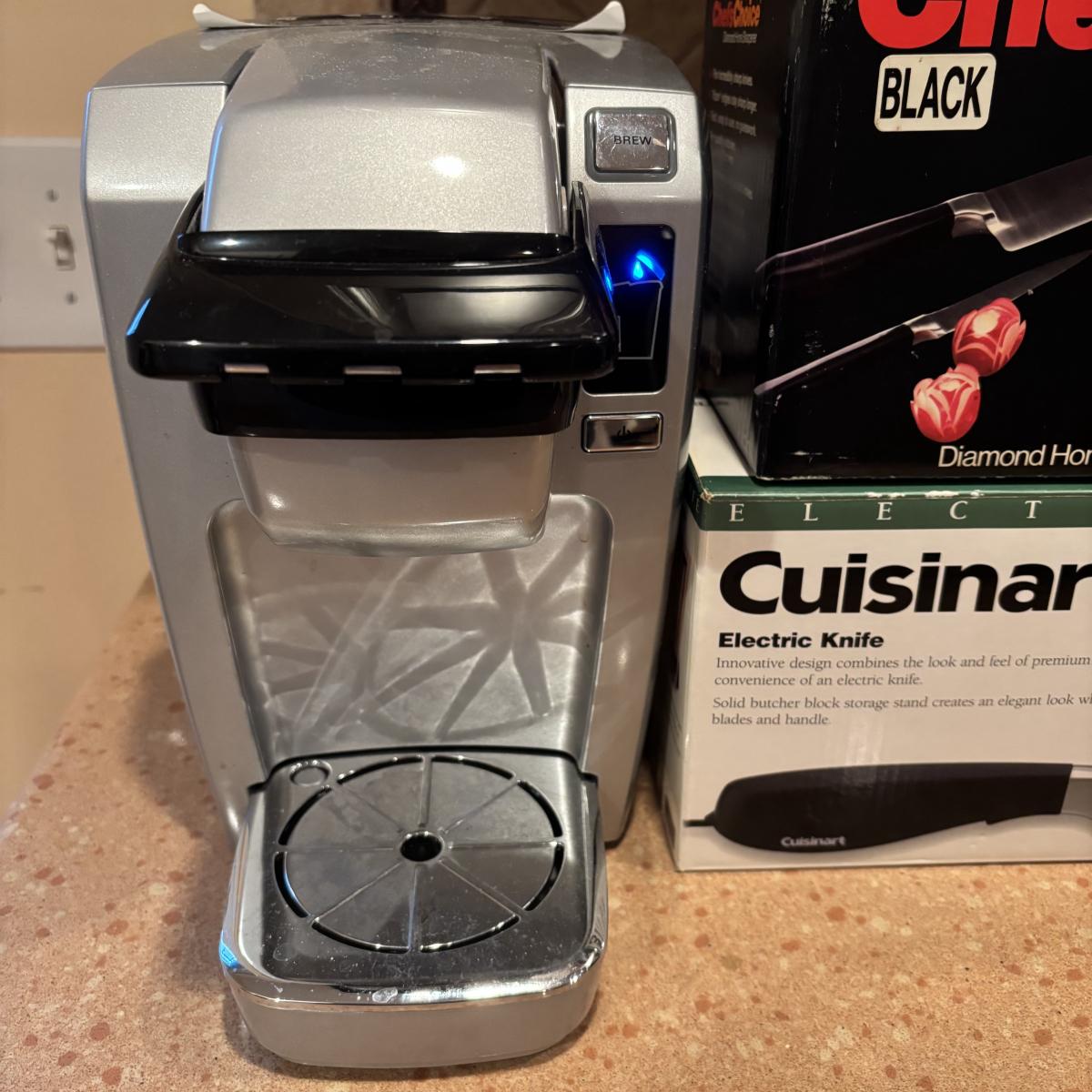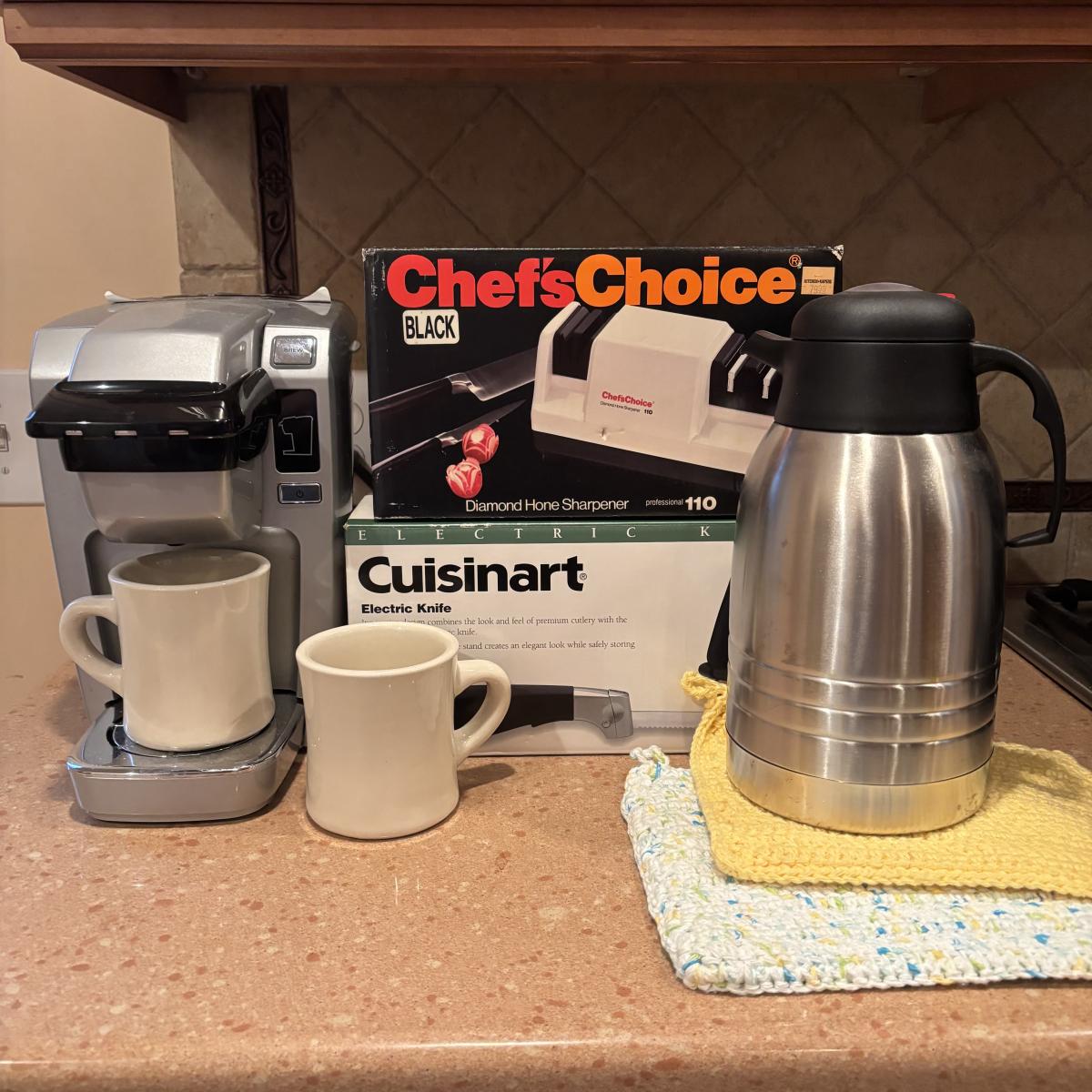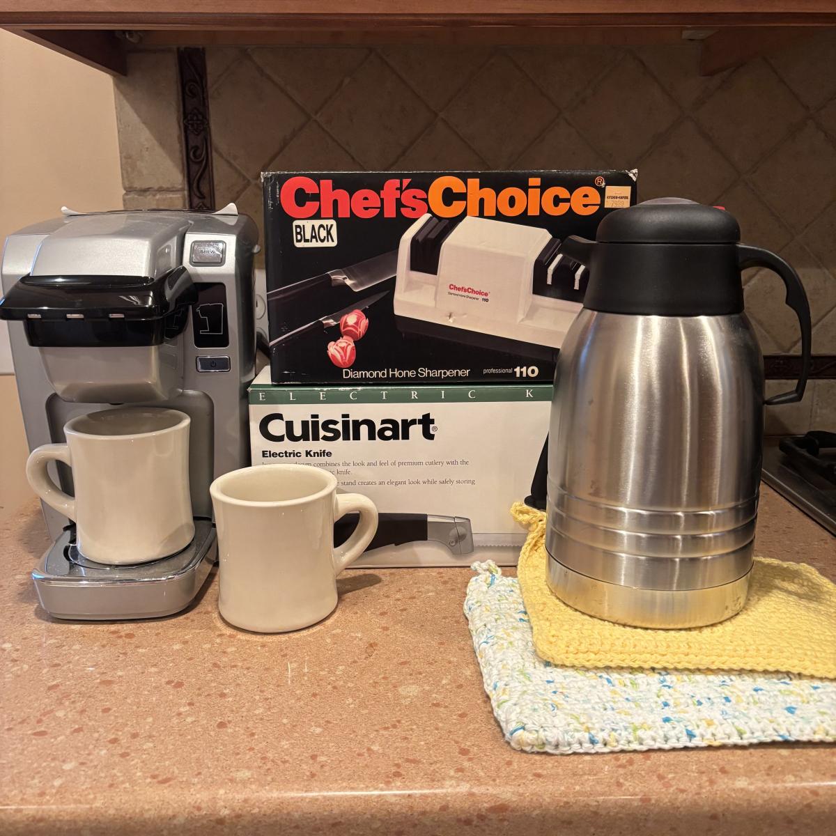 LOT 203: Kitchen Essentials: Keurig Model K10, Hot/Cold Carafe, Cuisinart Electric Knife, Chefs Choice Knife Sharpener & More