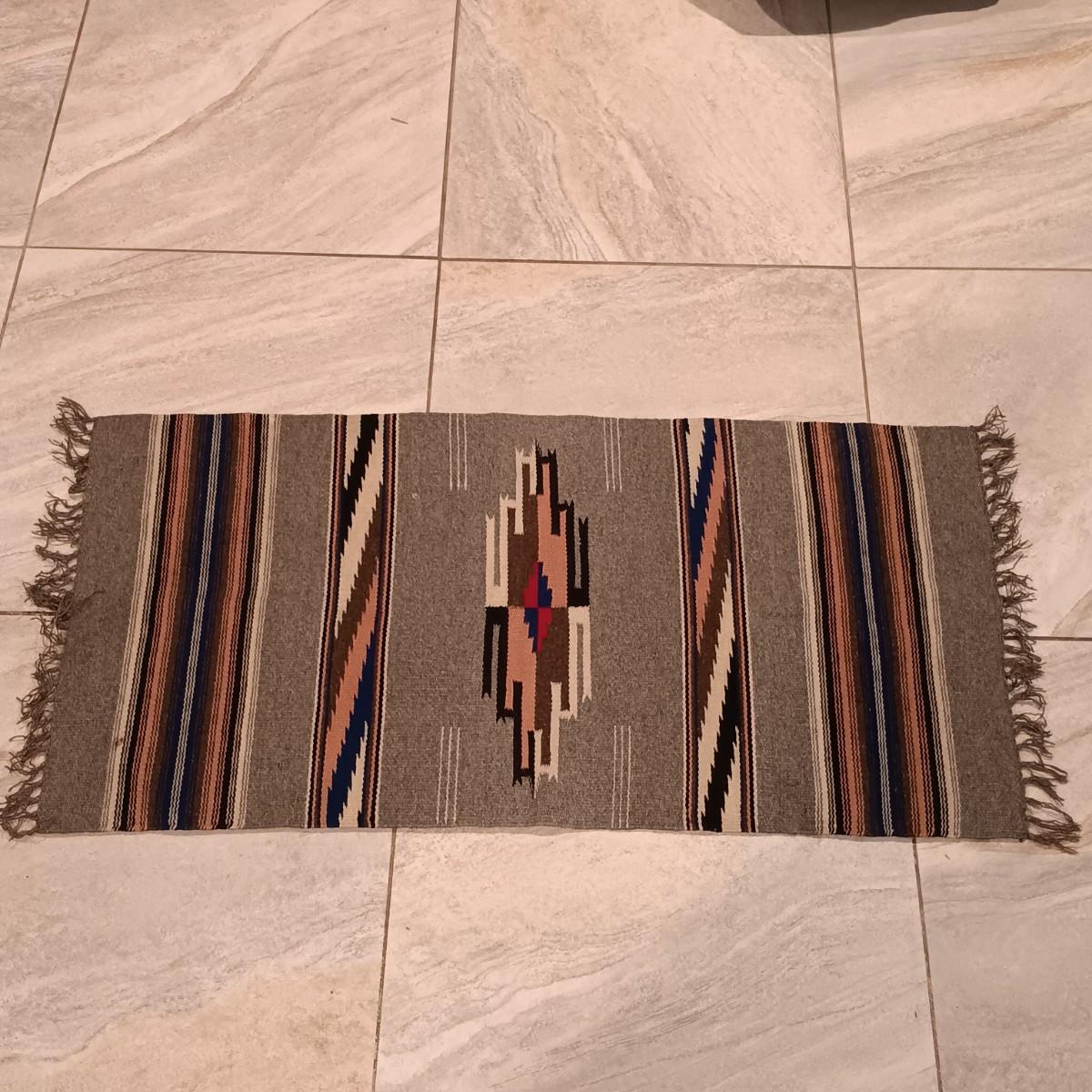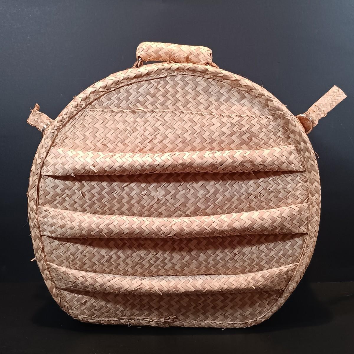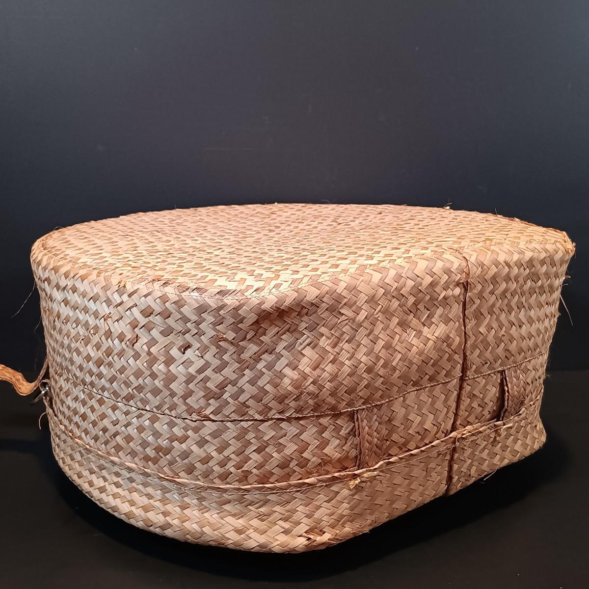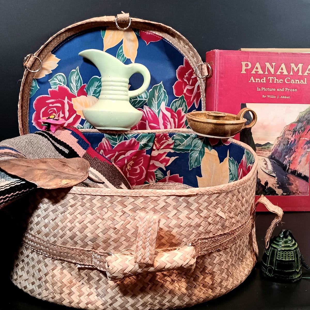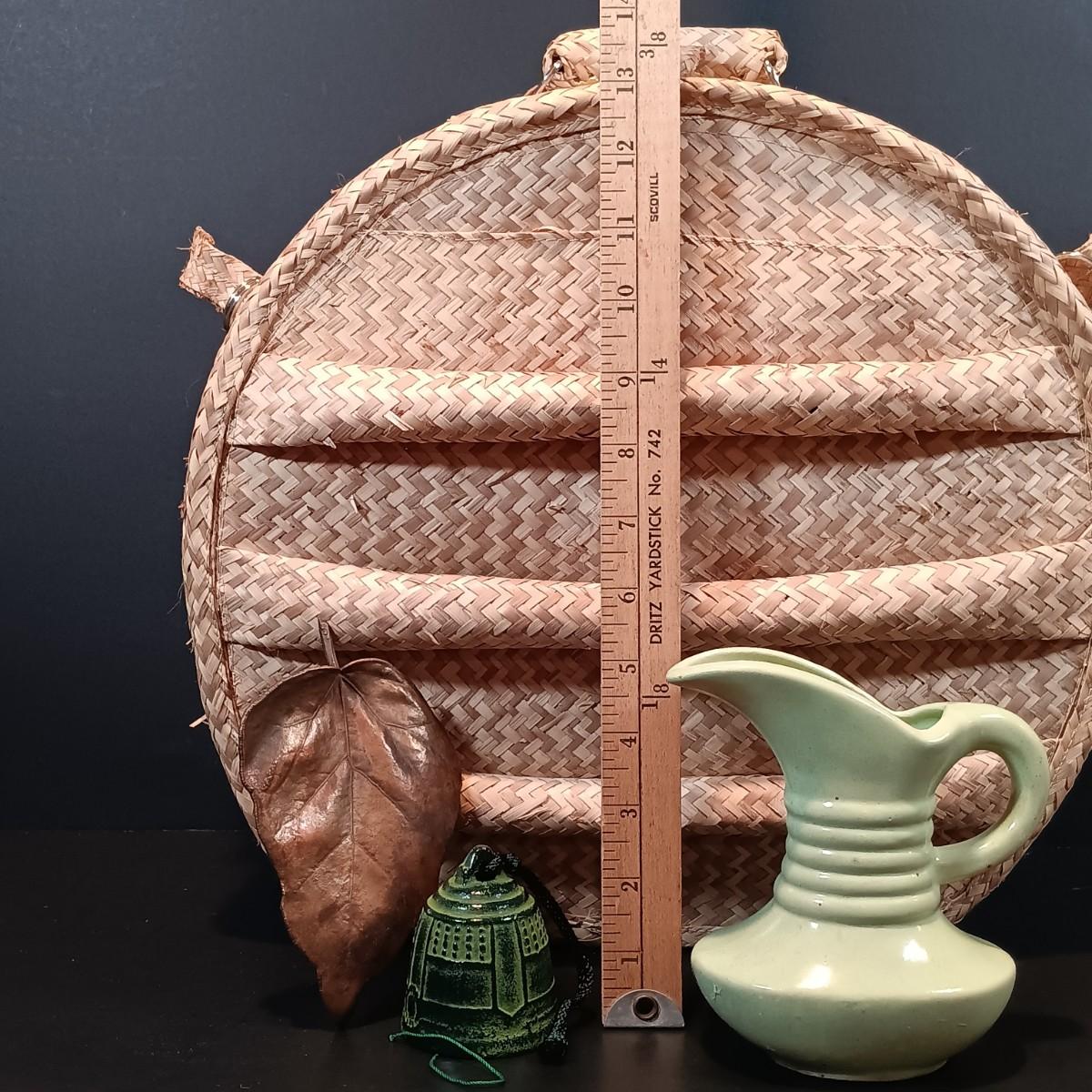 LOT 215: Vintage Straw Travel Case, Cast Iron Wind Chime, Handwoven Rug, Bronze Leaf & More