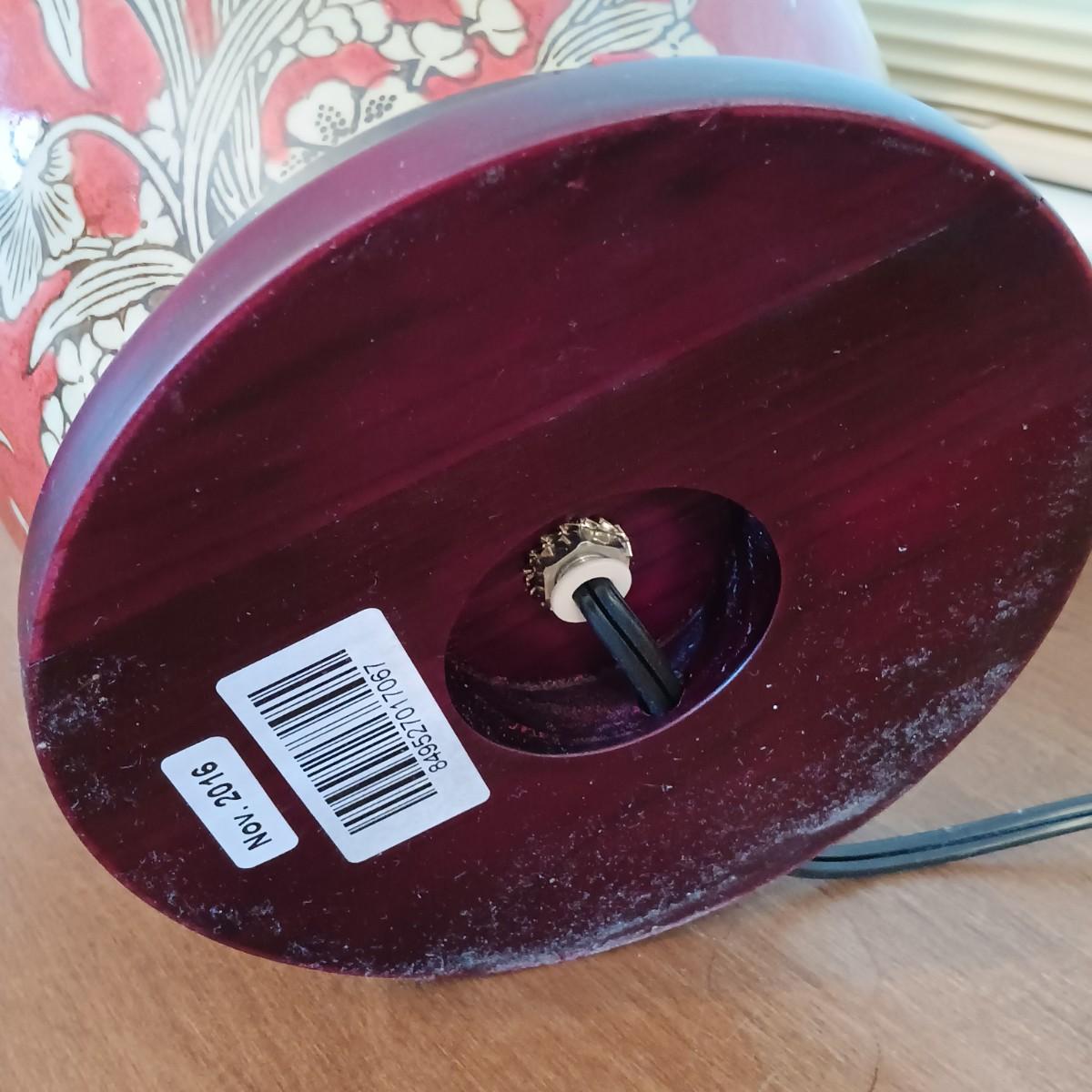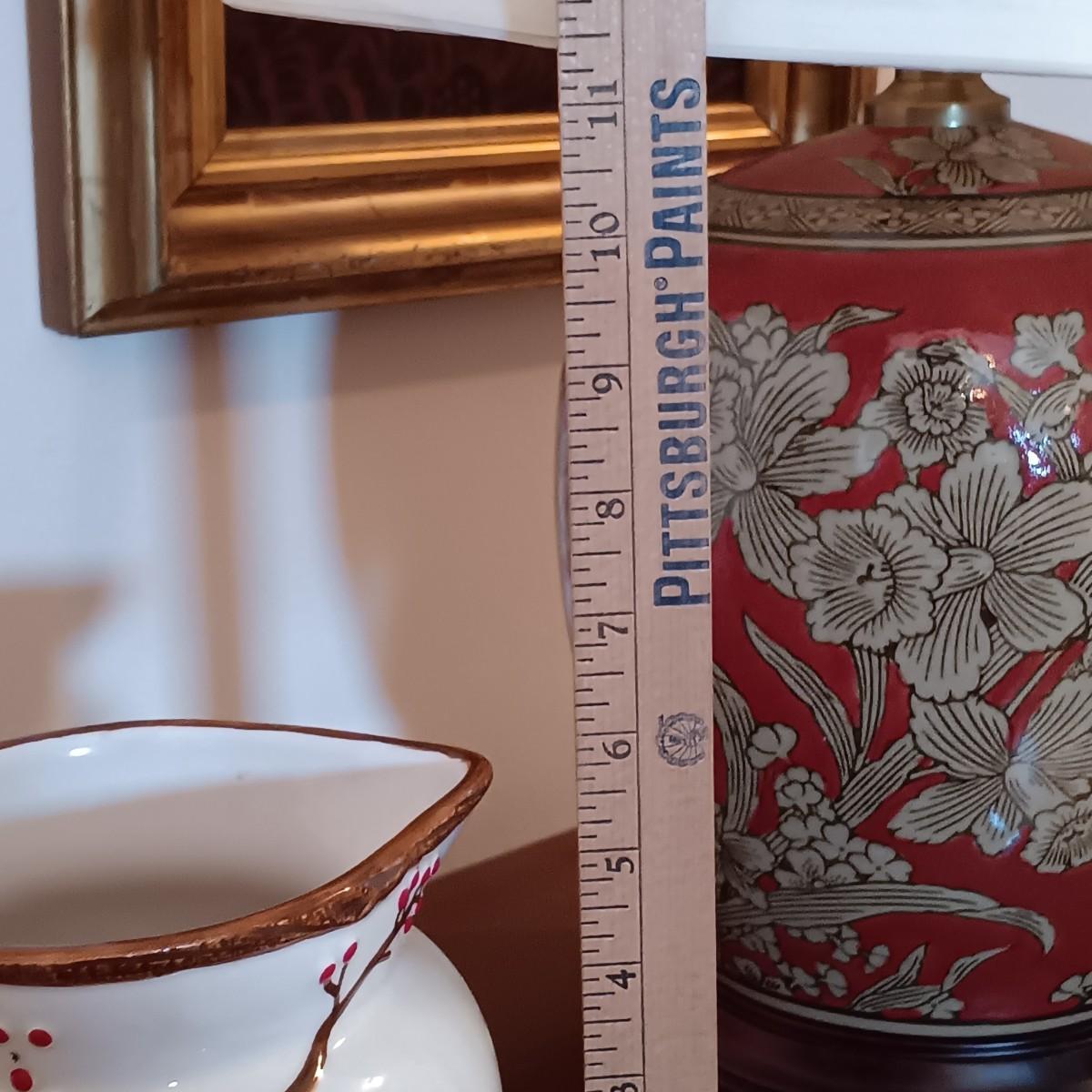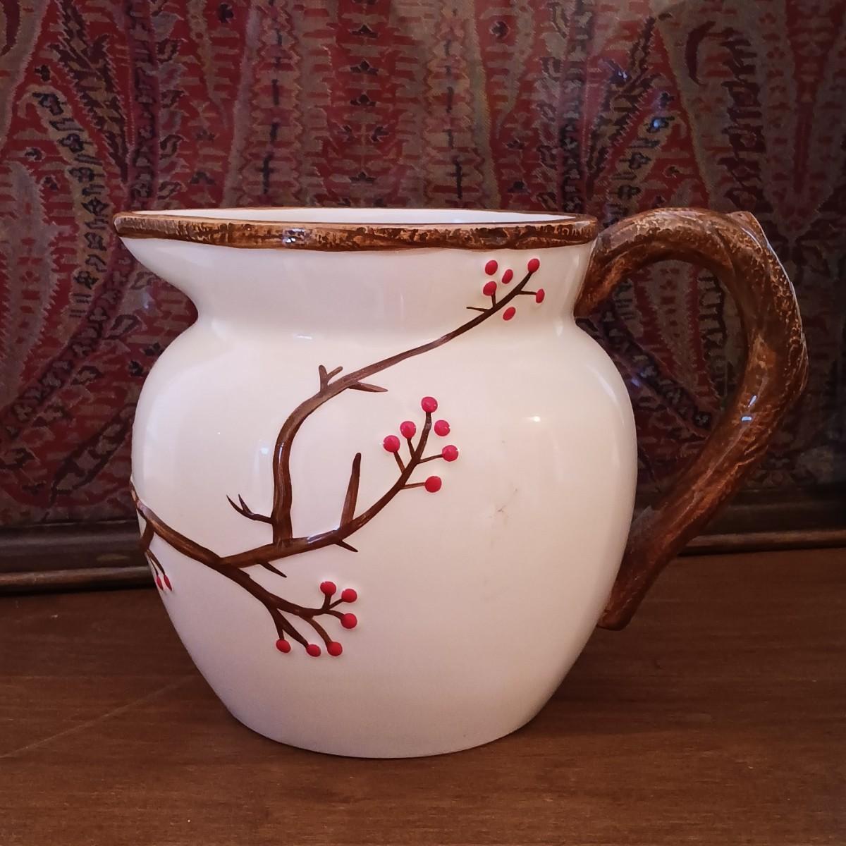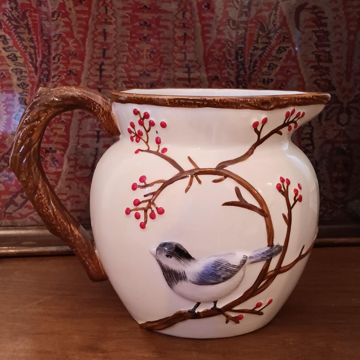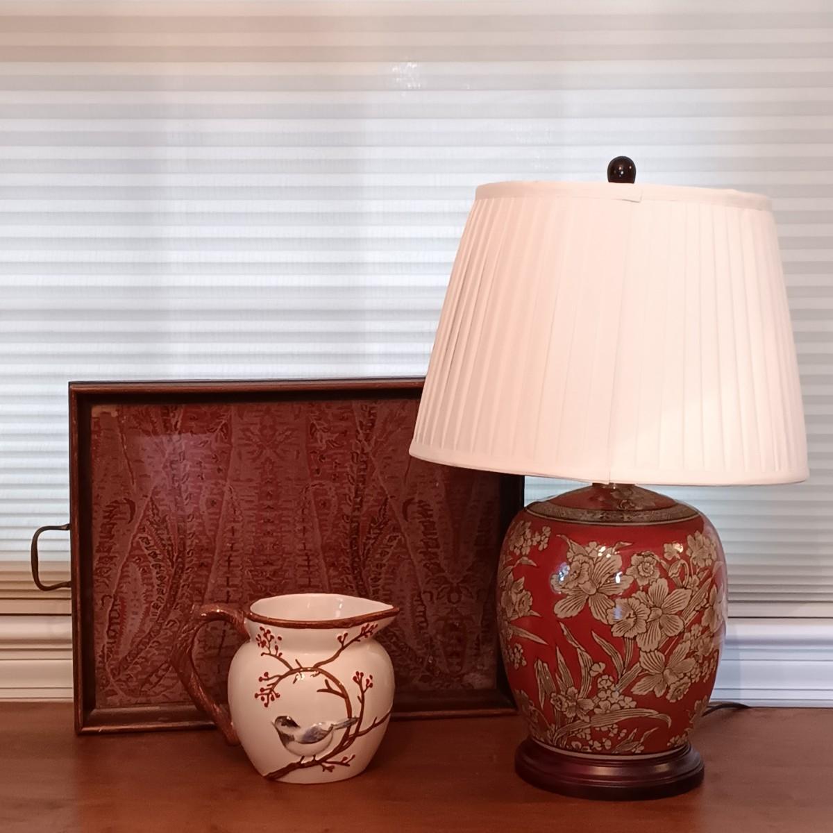 LOT 216: Harry and David Woodland Bird Pitcher, Red Floral Pottery Lamp & Antique Tray with Textile Insert