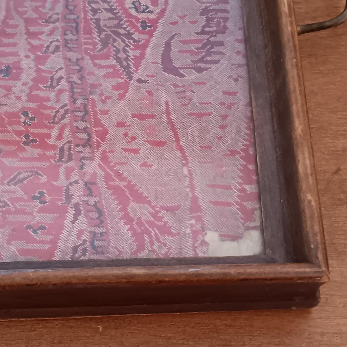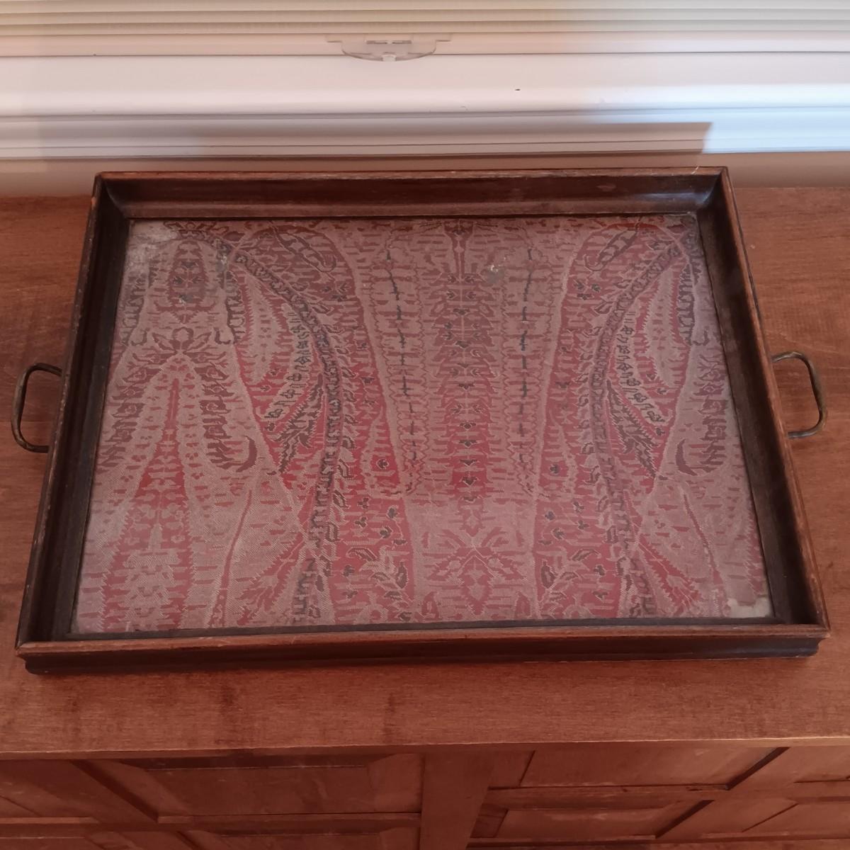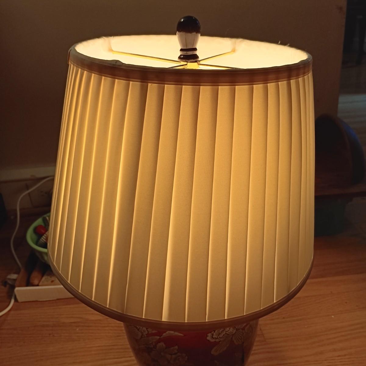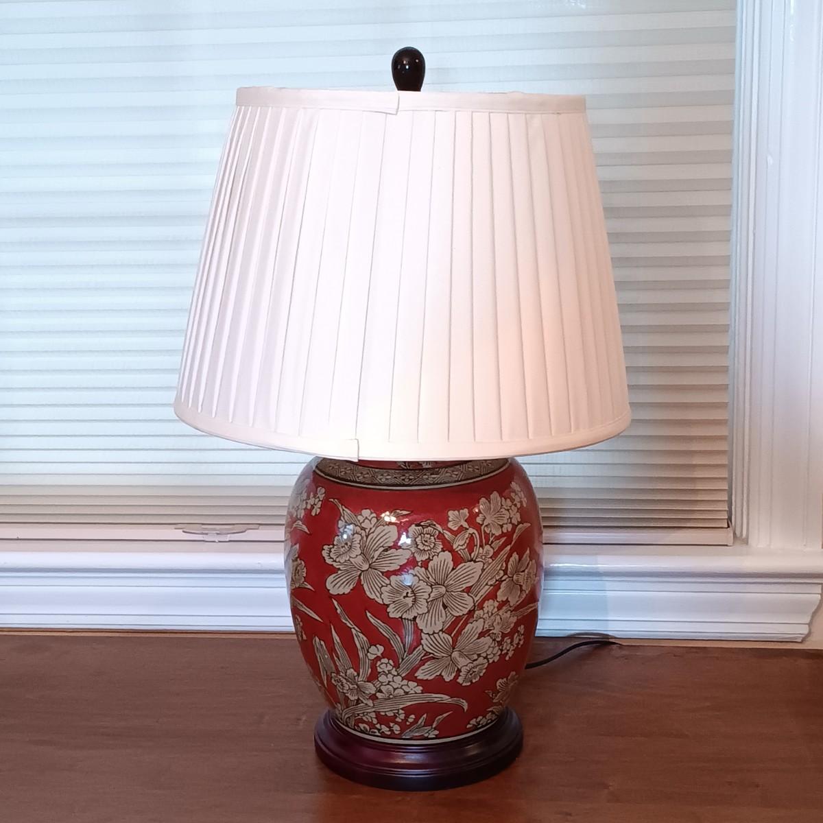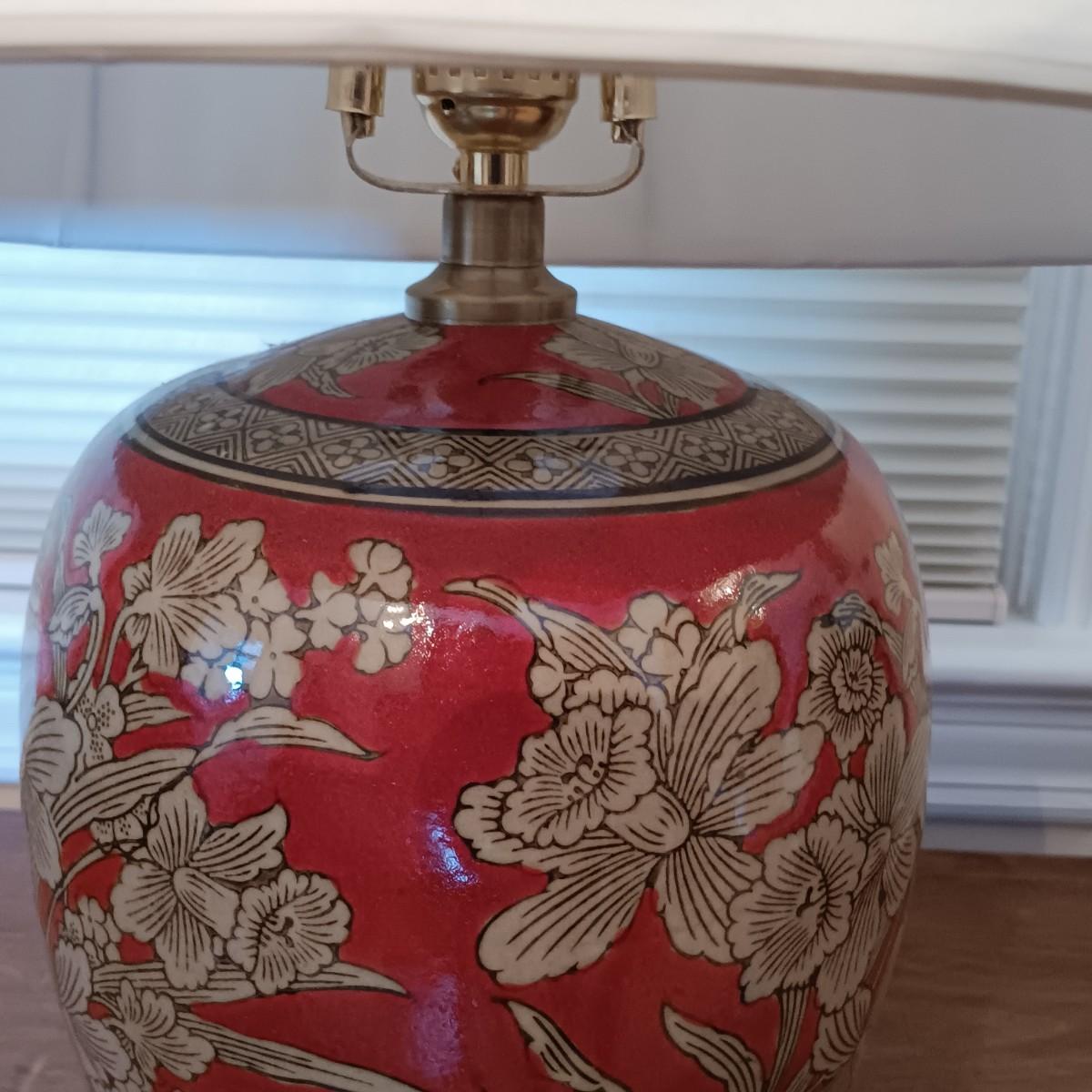 LOT 216: Harry and David Woodland Bird Pitcher, Red Floral Pottery Lamp & Antique Tray with Textile Insert