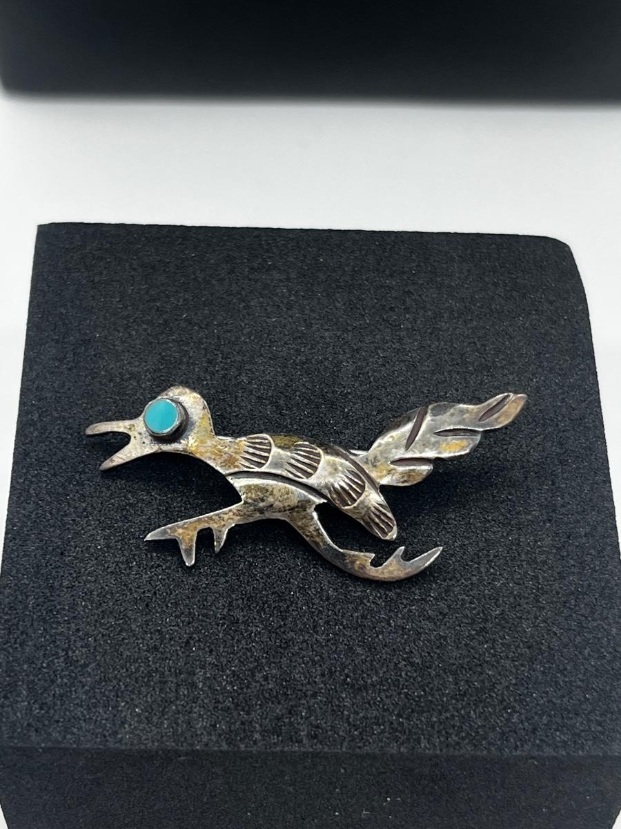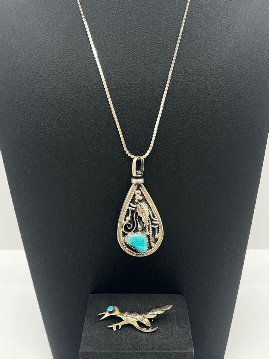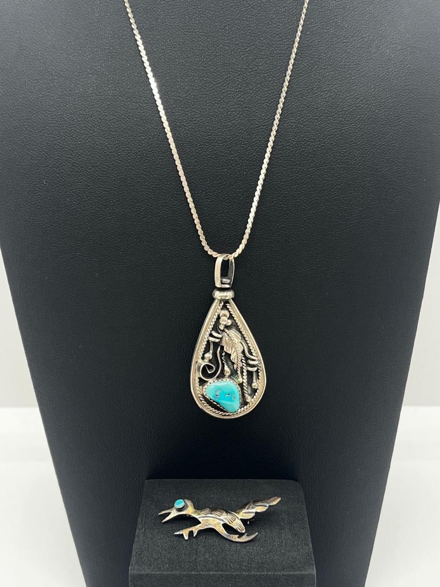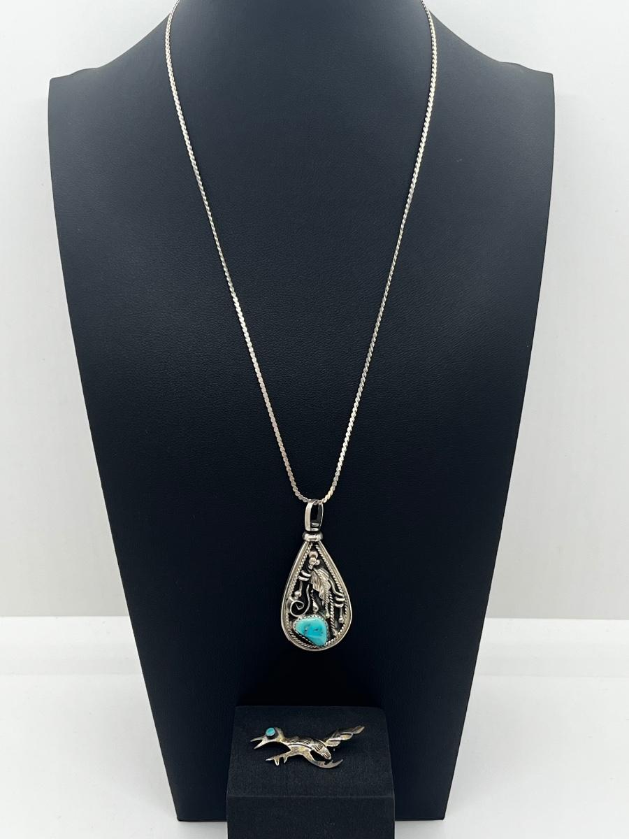 LOT 12: Sterling Silver Native American Two Sided Turquoise Inlay Pendant on 17.5" Chain and Road Runner Pin - 16.2 GTW