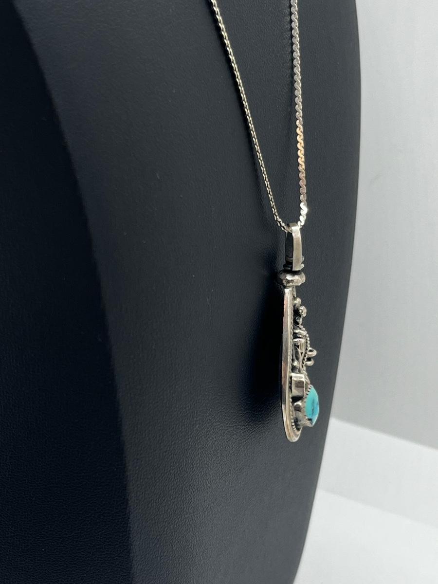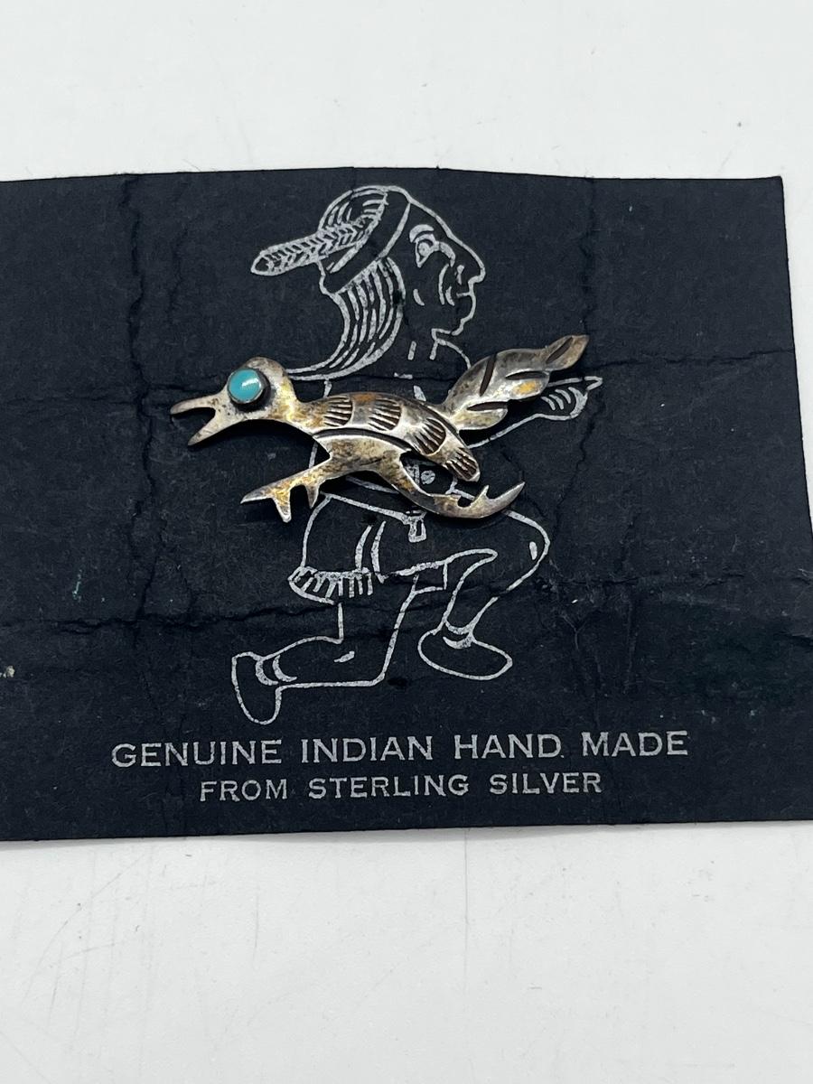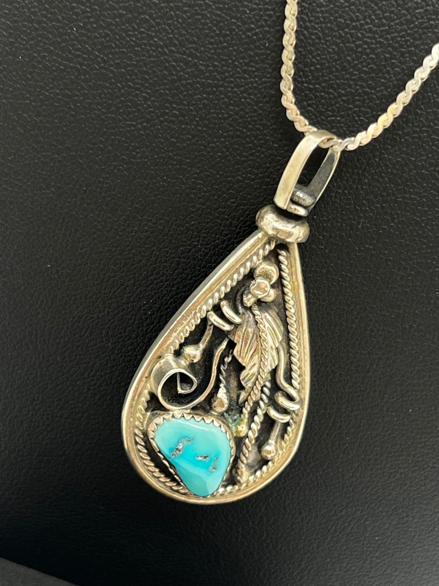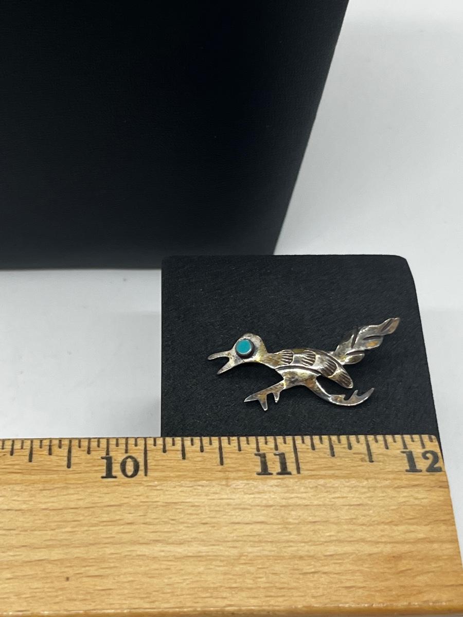 LOT 12: Sterling Silver Native American Two Sided Turquoise Inlay Pendant on 17.5" Chain and Road Runner Pin - 16.2 GTW