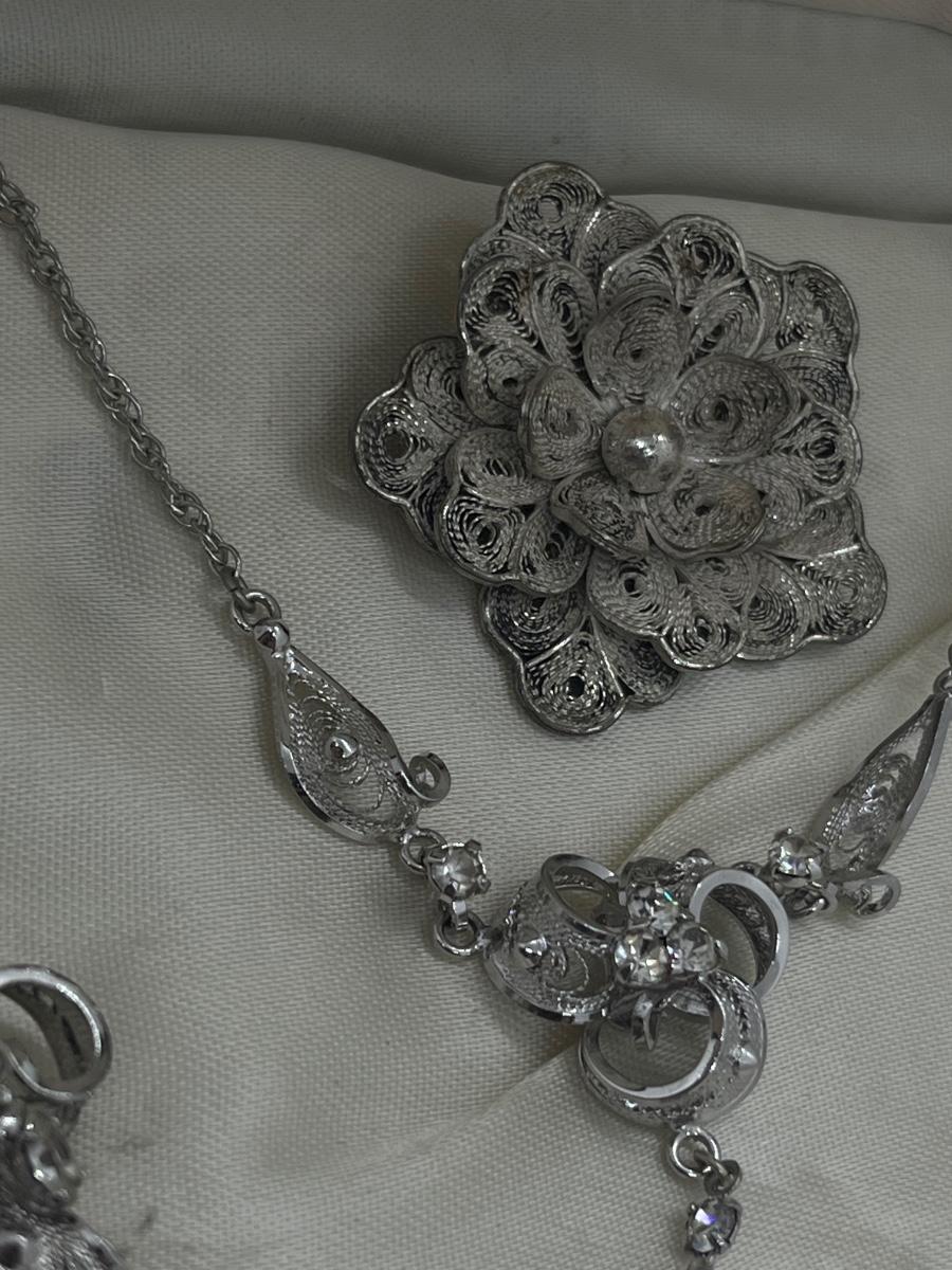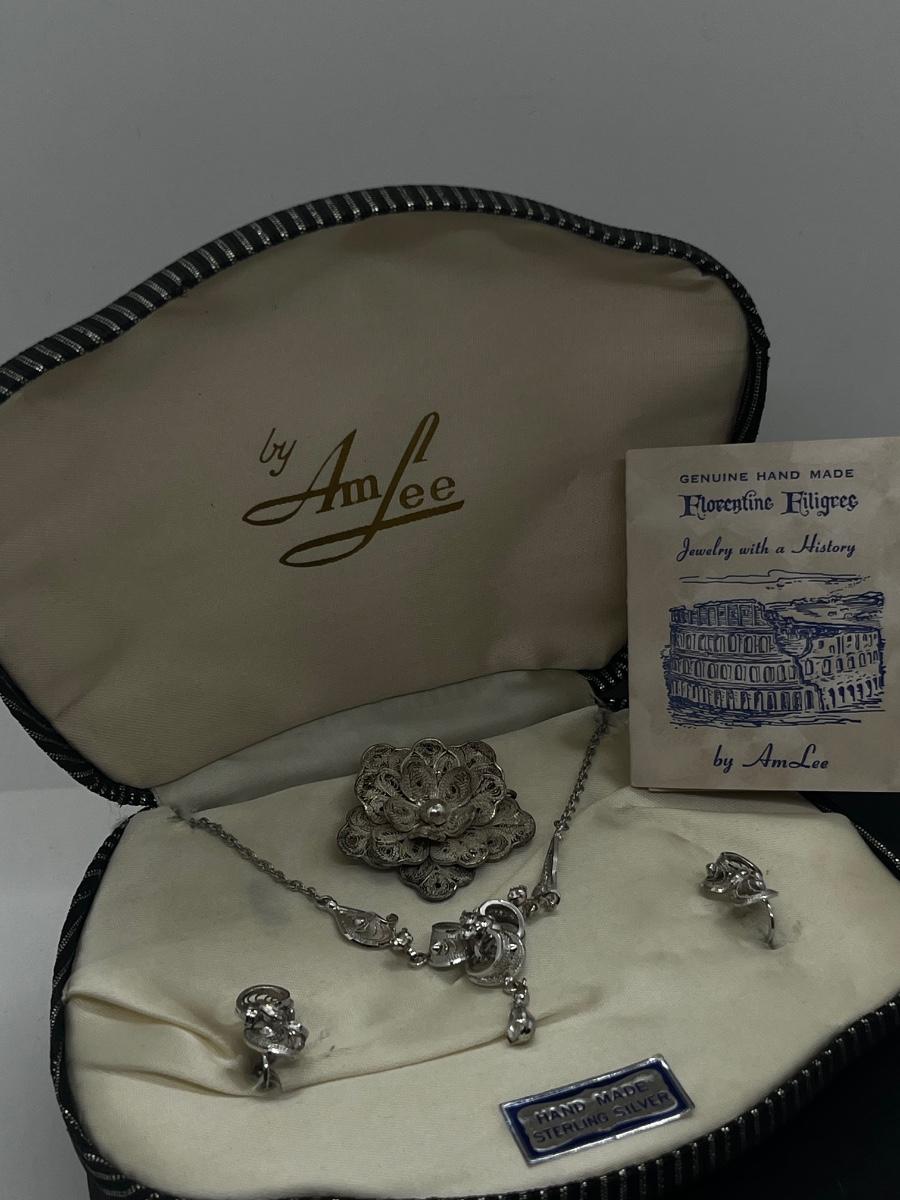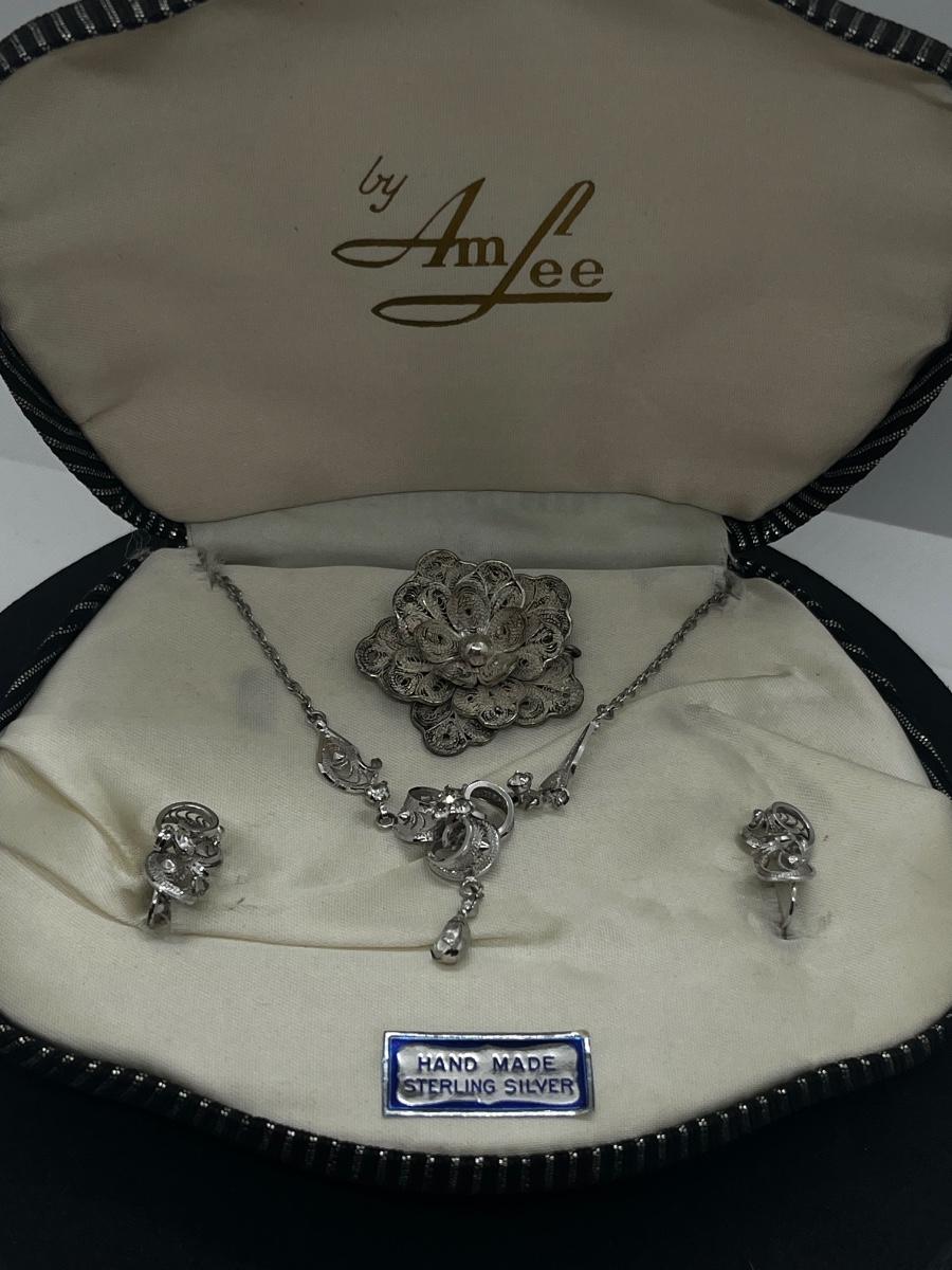 LOT 23: Handmade Sterling Florentine Filigree Necklace, Screw Back Earrings and Flower Pin by Amy Lee