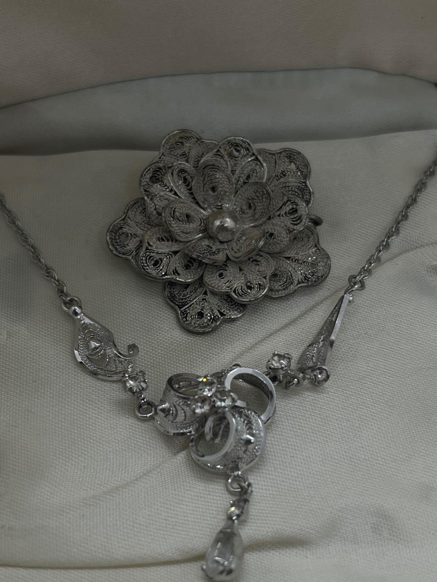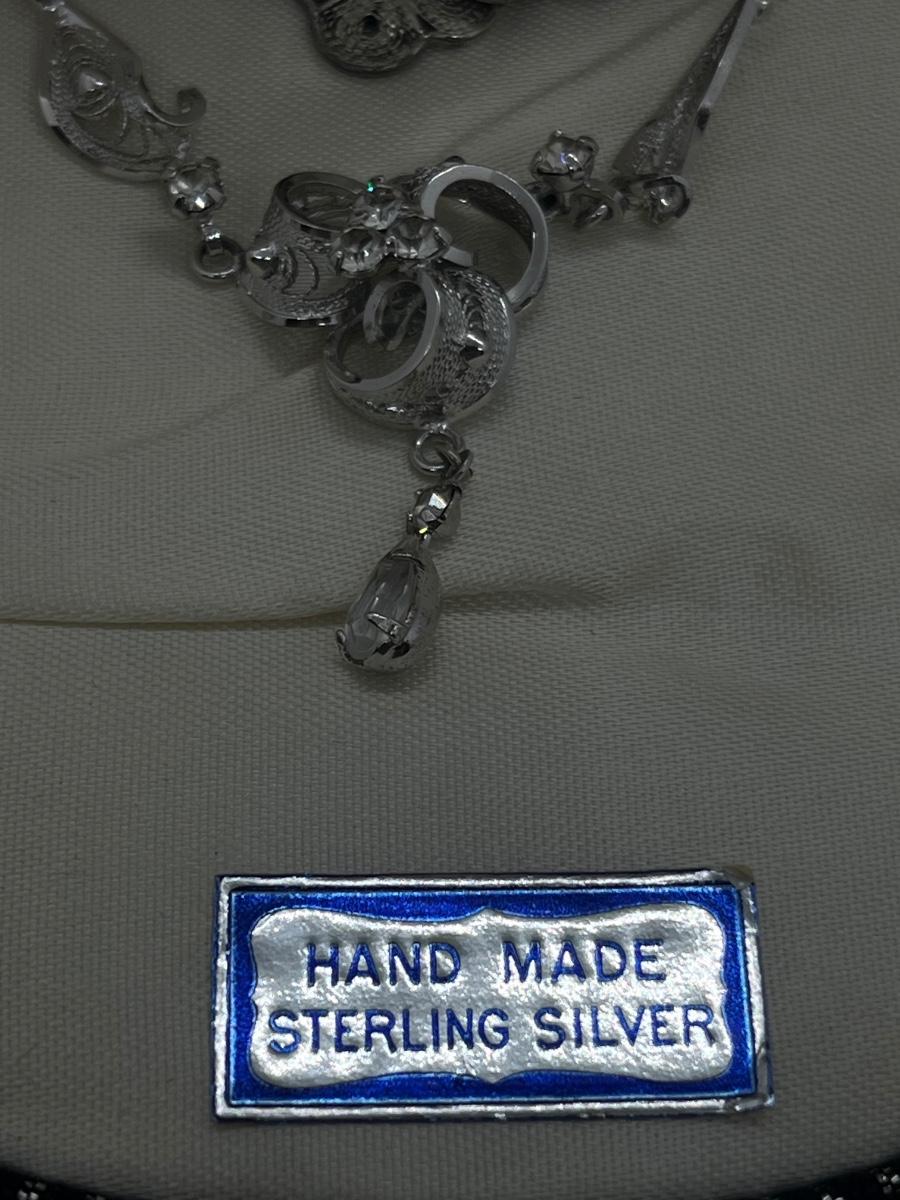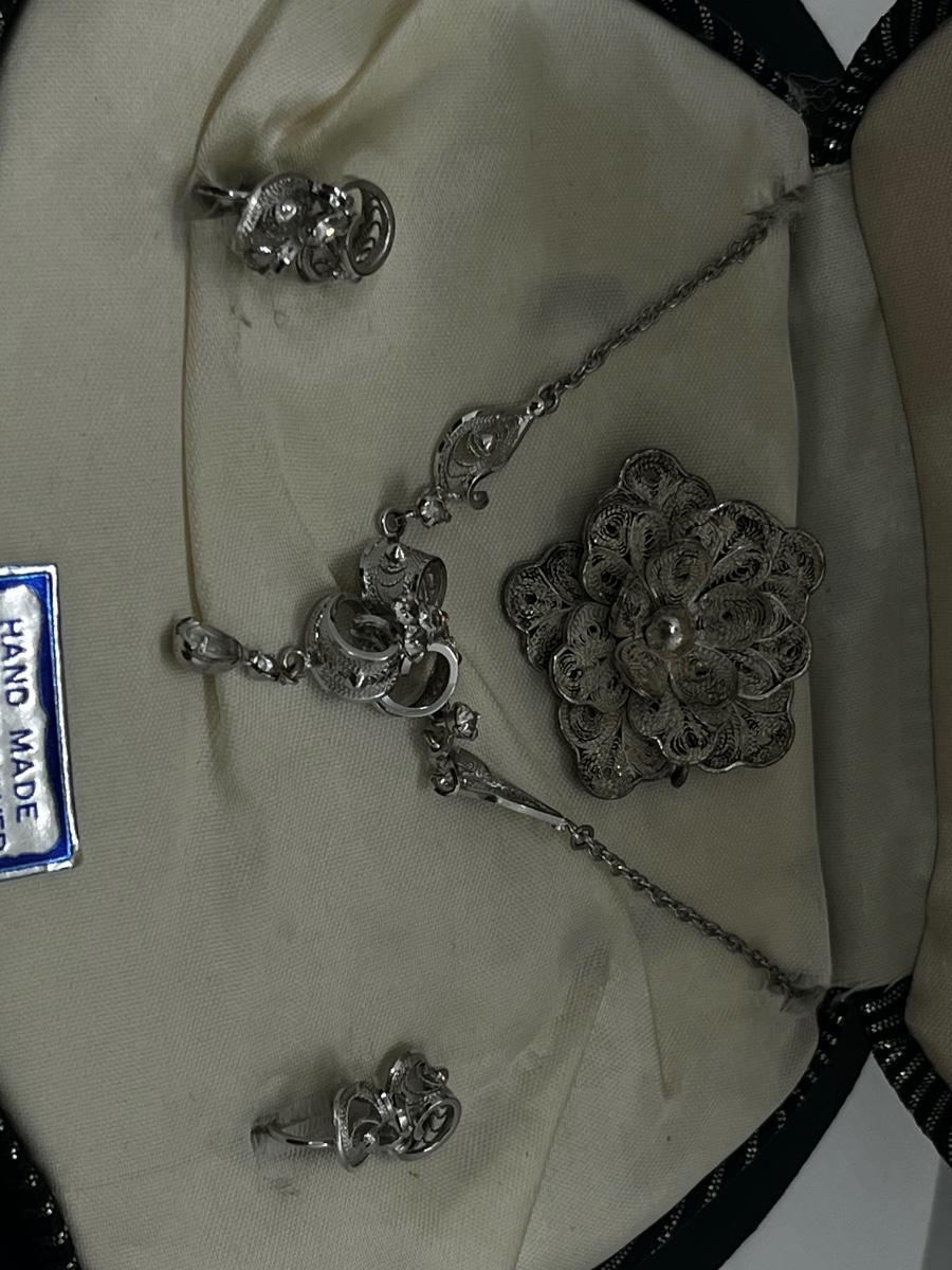 LOT 23: Handmade Sterling Florentine Filigree Necklace, Screw Back Earrings and Flower Pin by Amy Lee