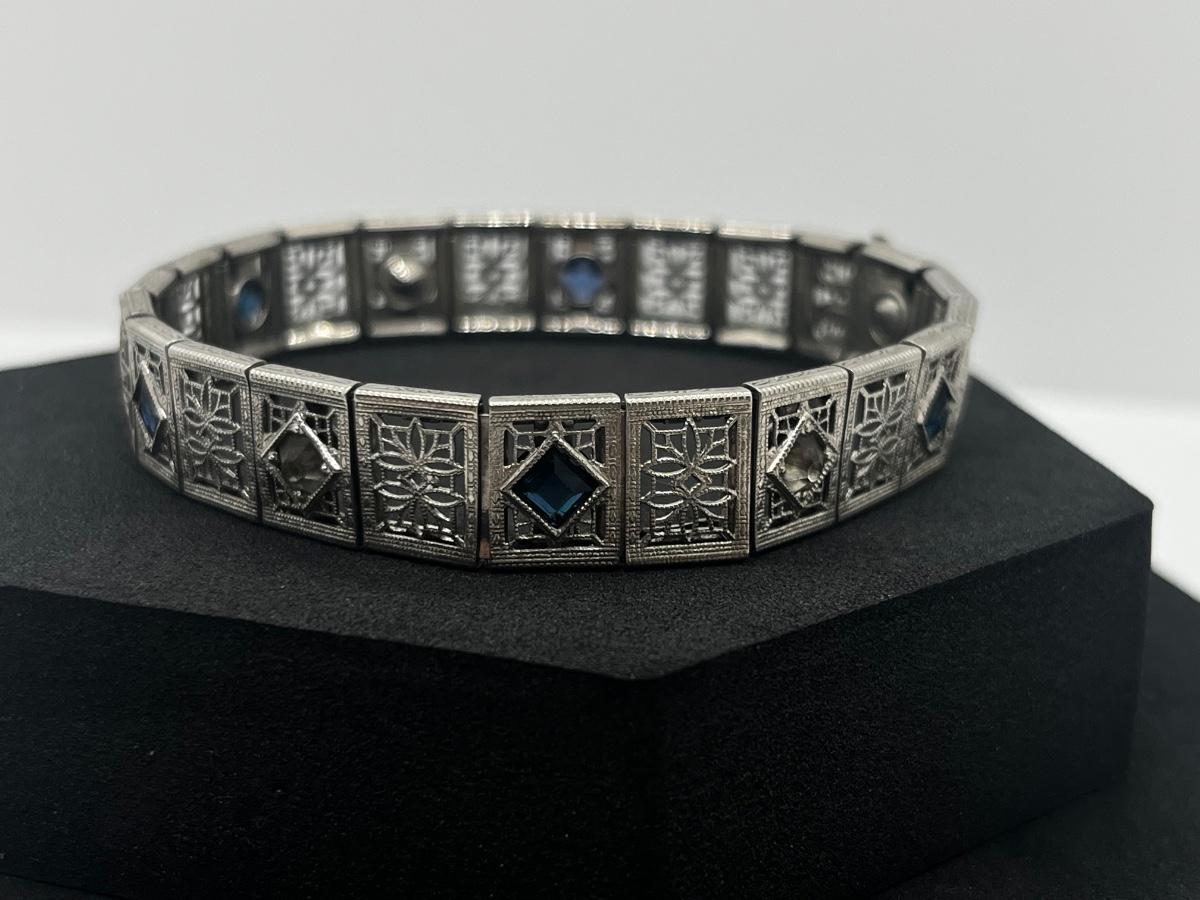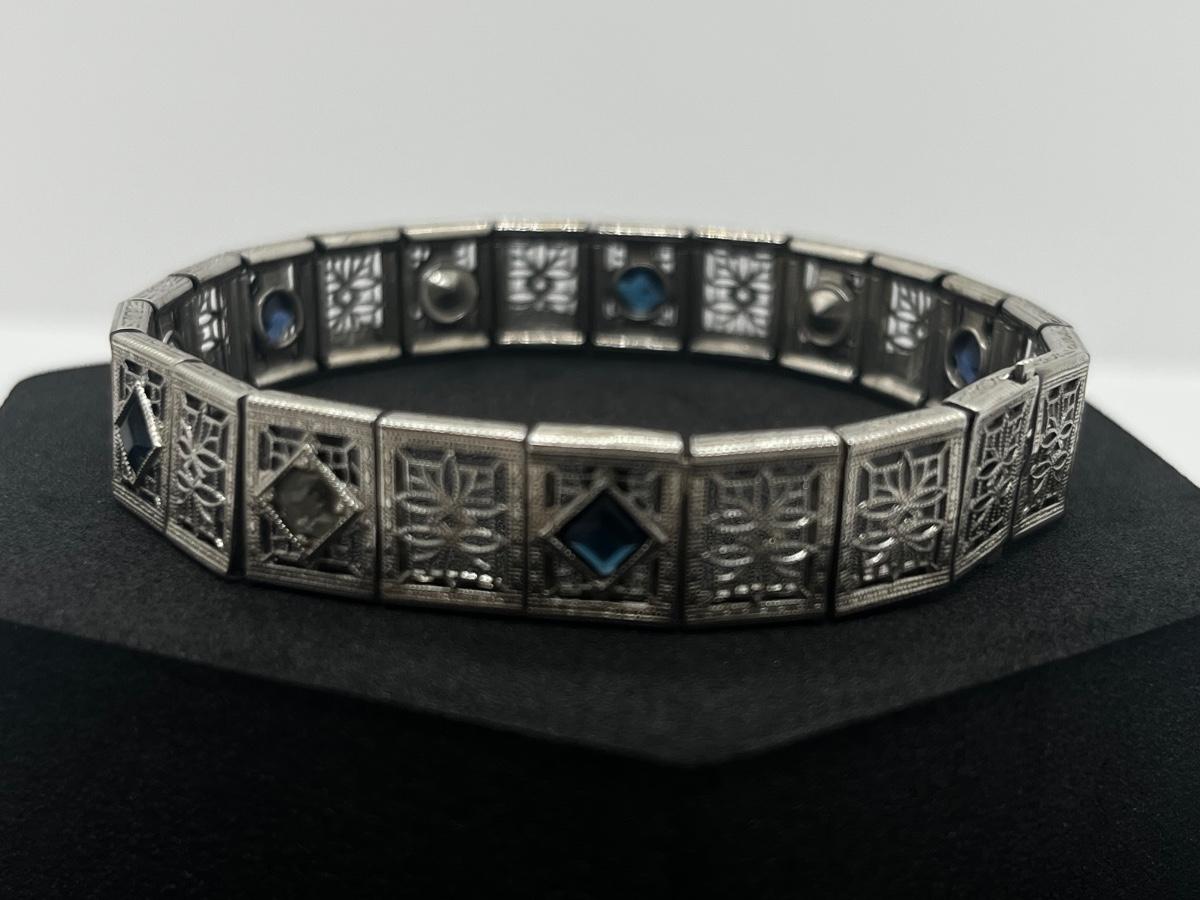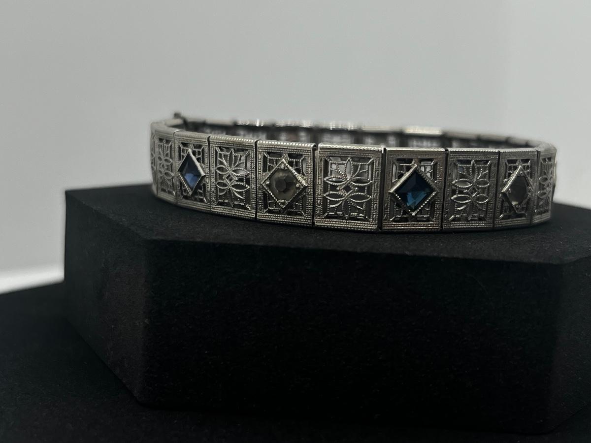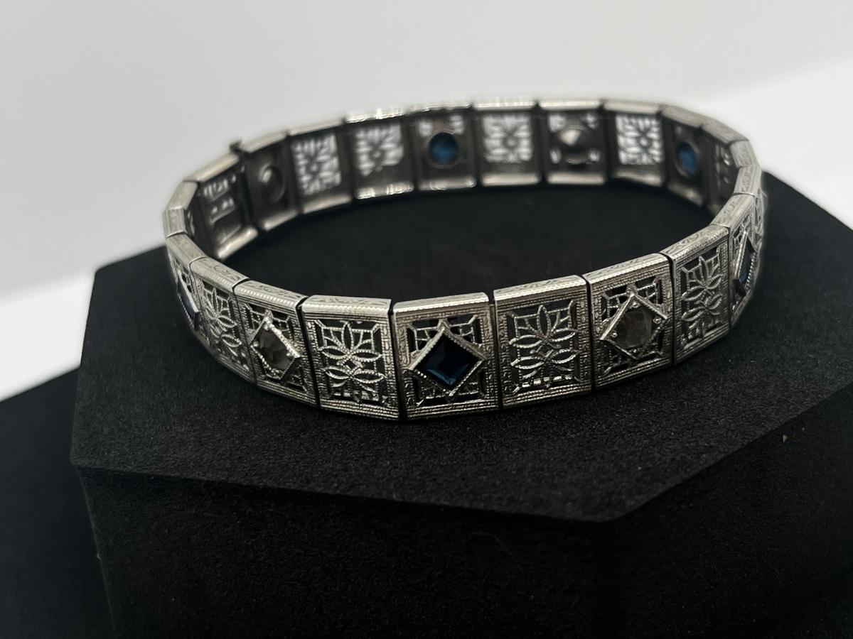 LOT 26: Sterling Art Deco Filigree Bracelet with Blue Glass Stones