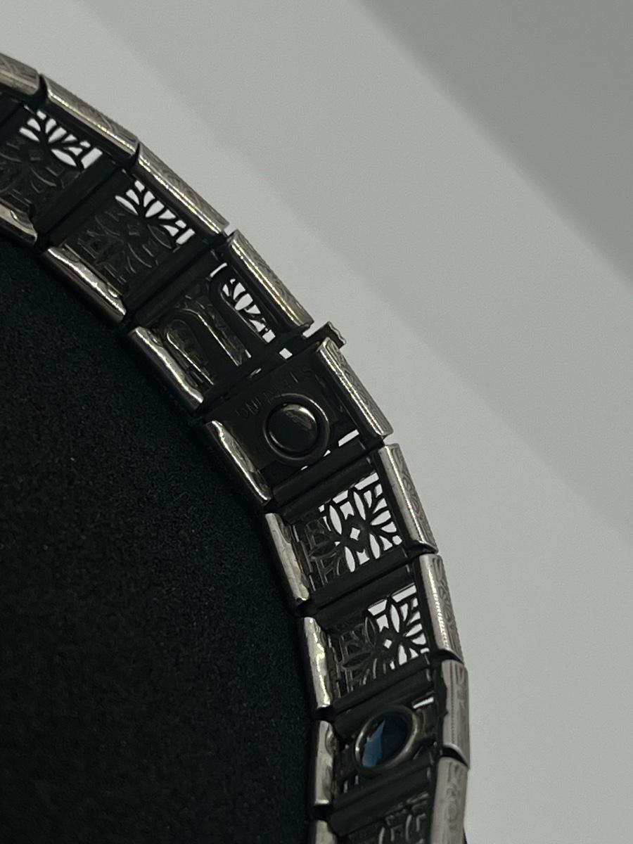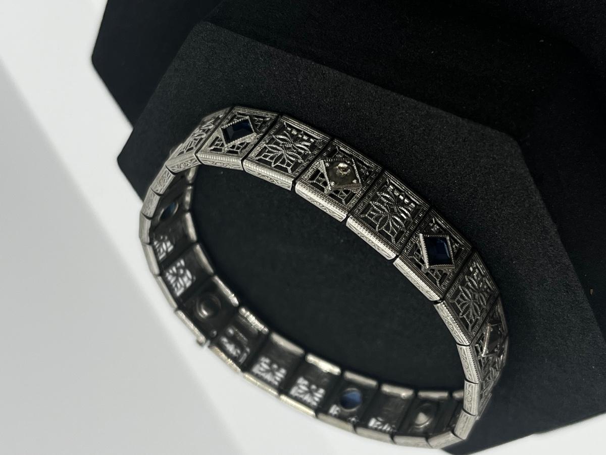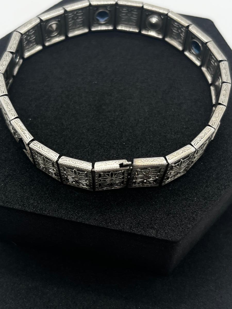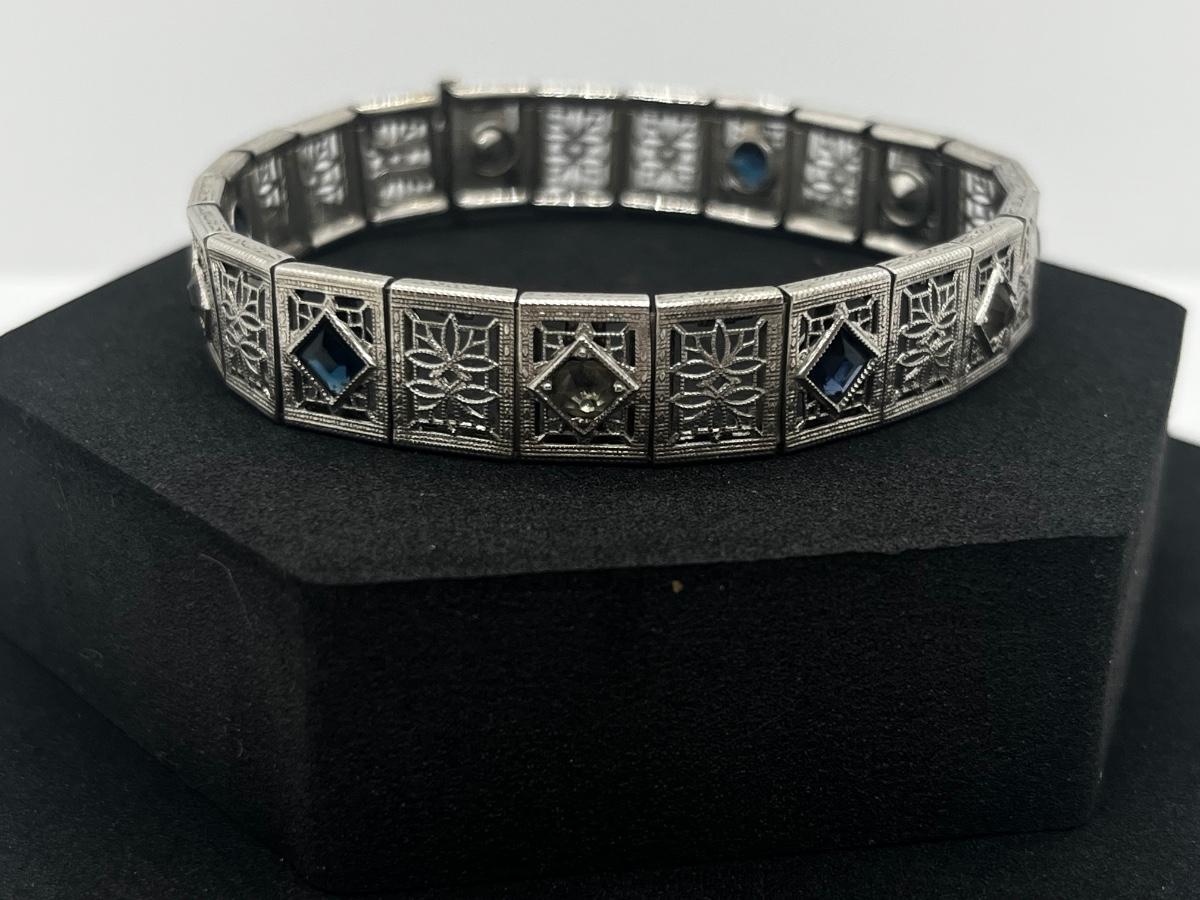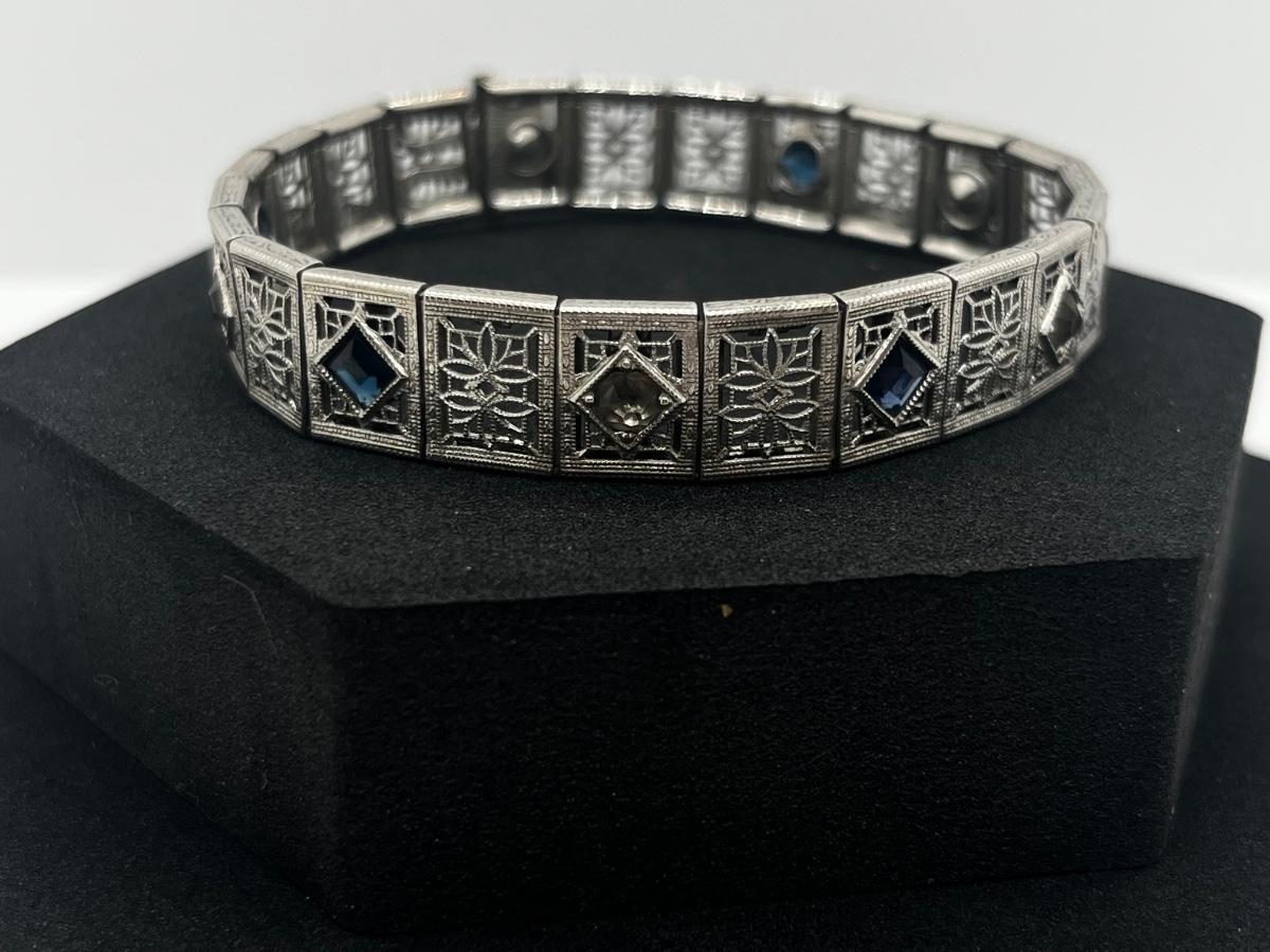 LOT 26: Sterling Art Deco Filigree Bracelet with Blue Glass Stones