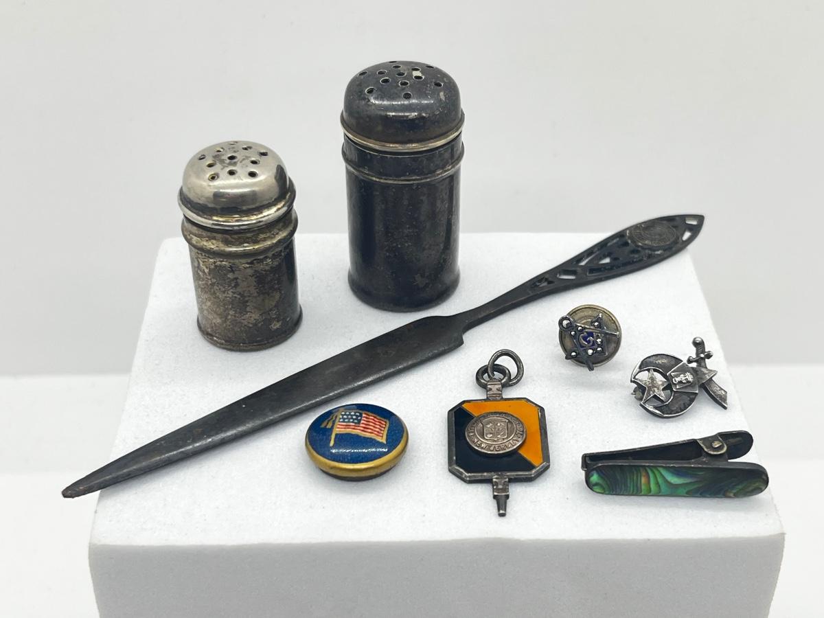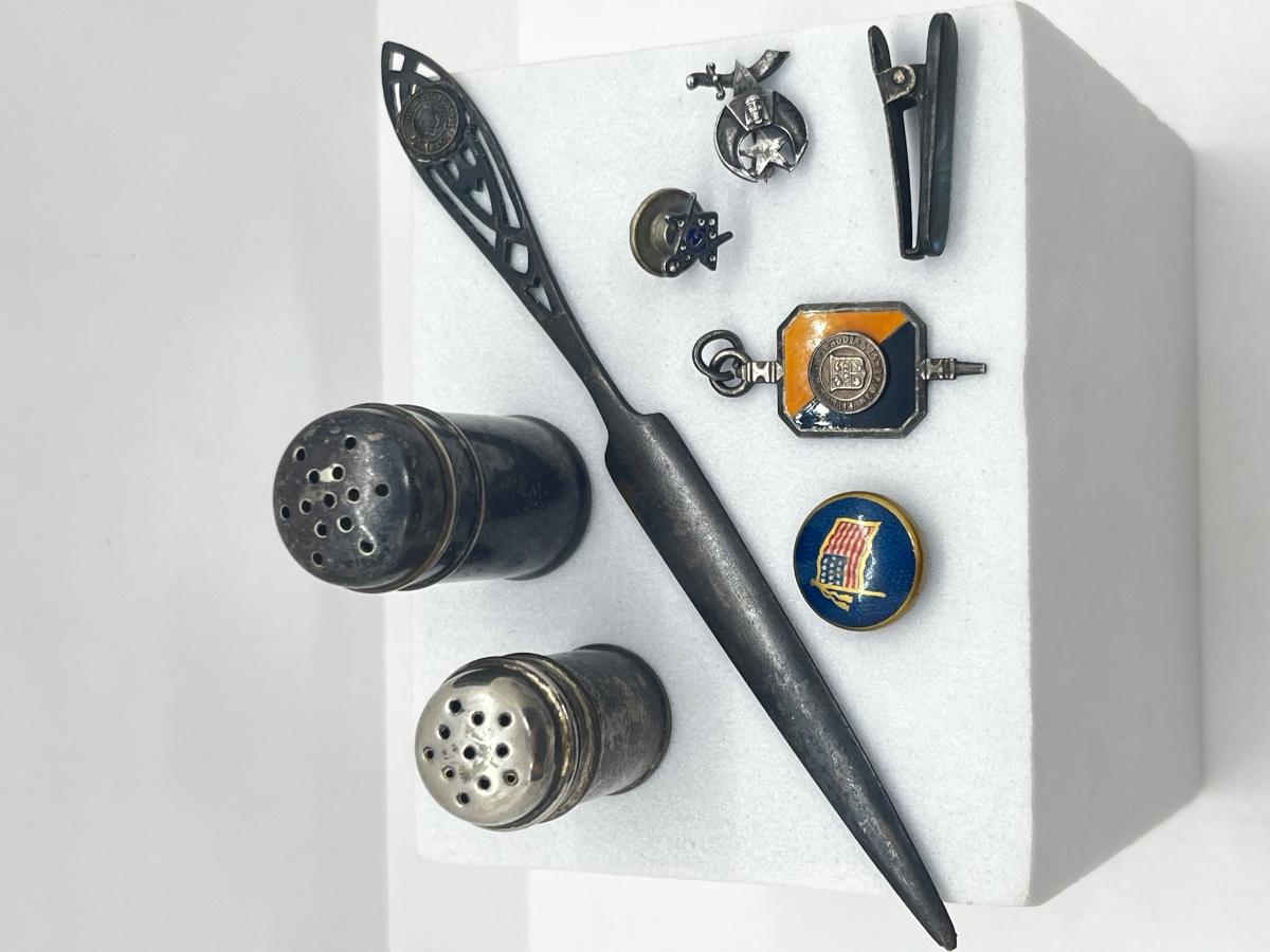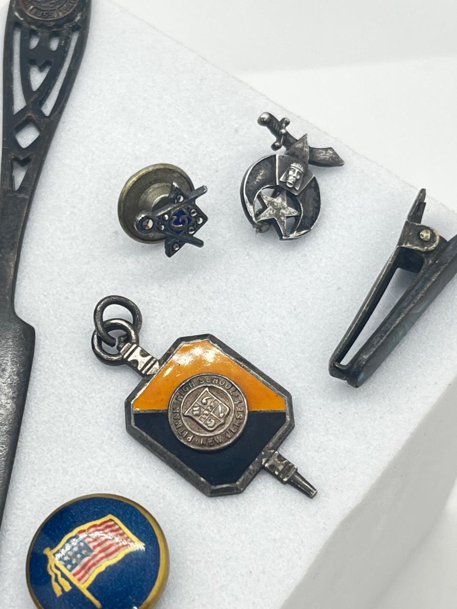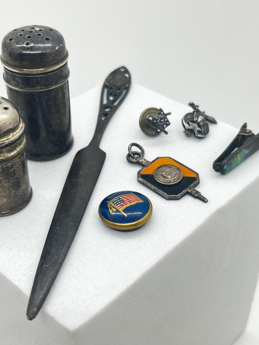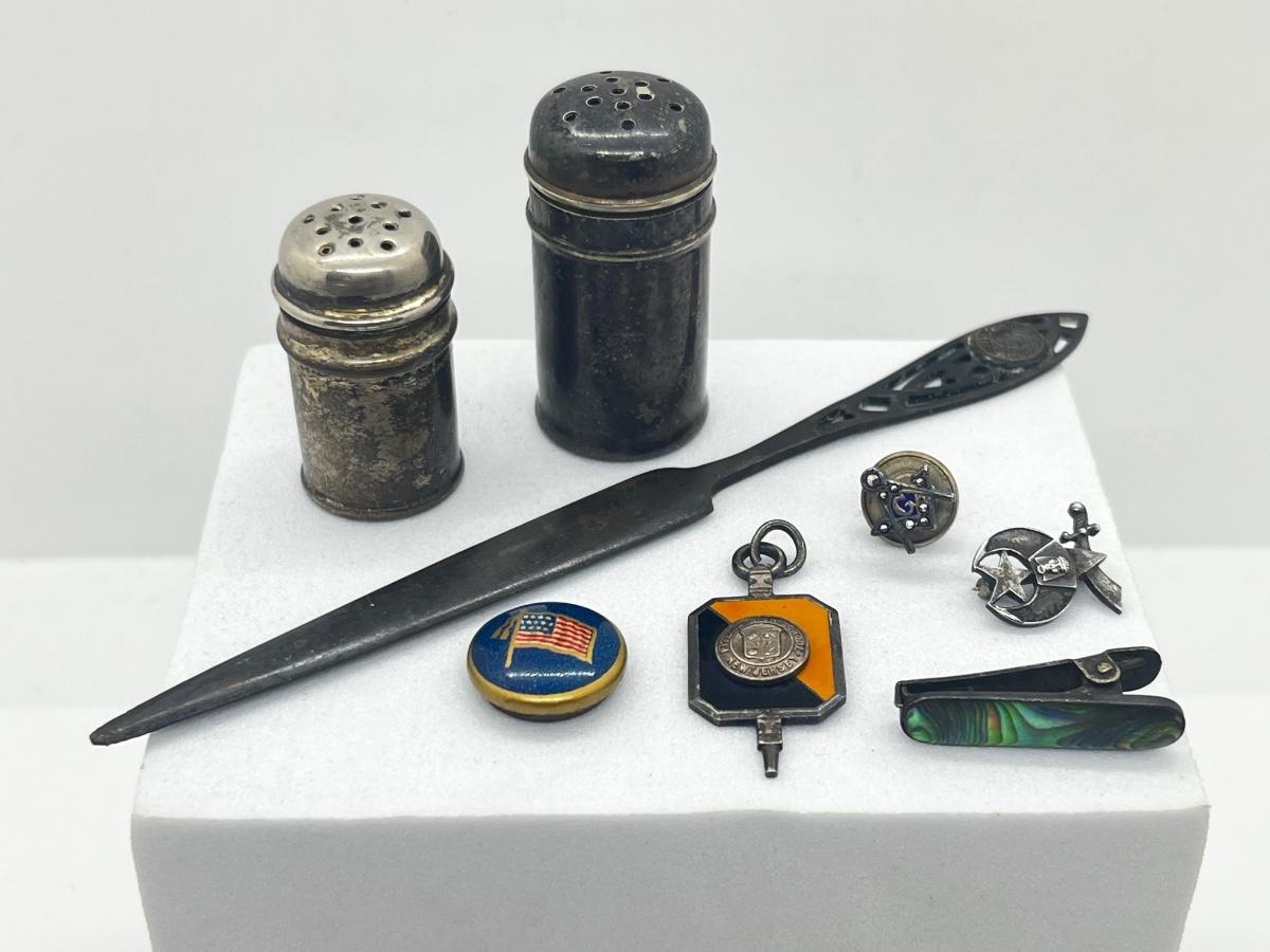 LOT 27: Vintage Sterling Shriner Pin, Sterling Pitman High School Pendant, Marcasite Masonic Pin, Antique Bronze Letter Opener and More!