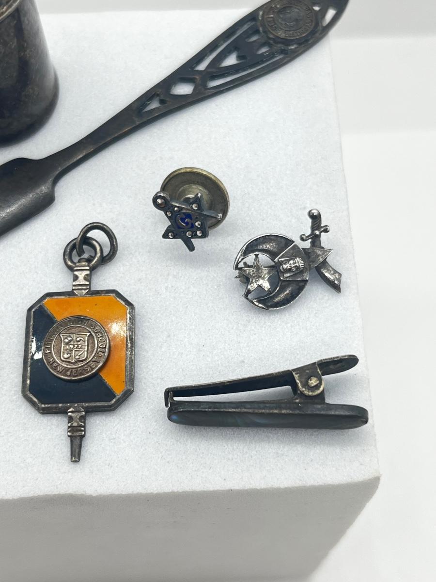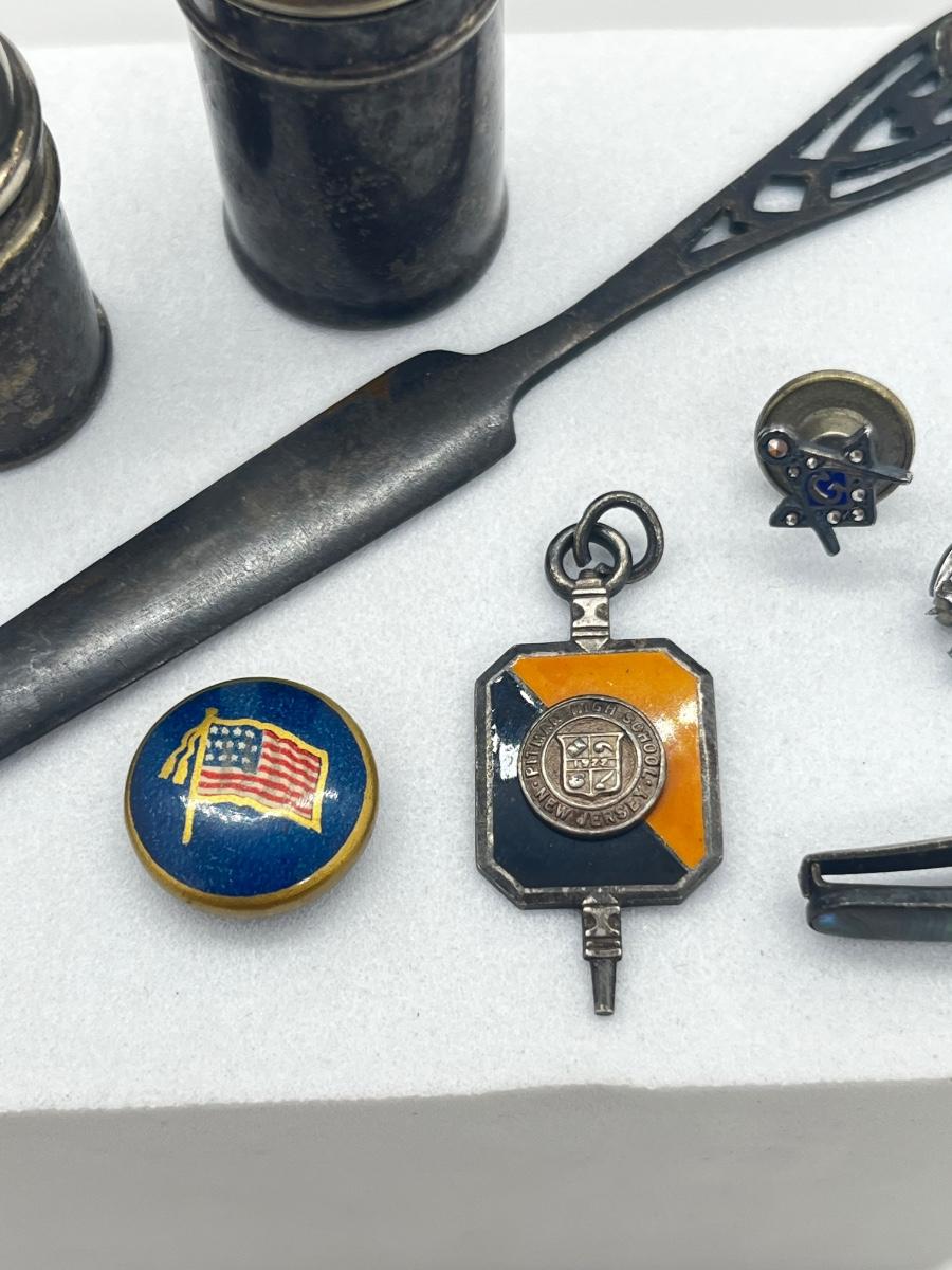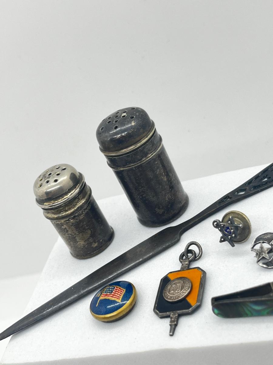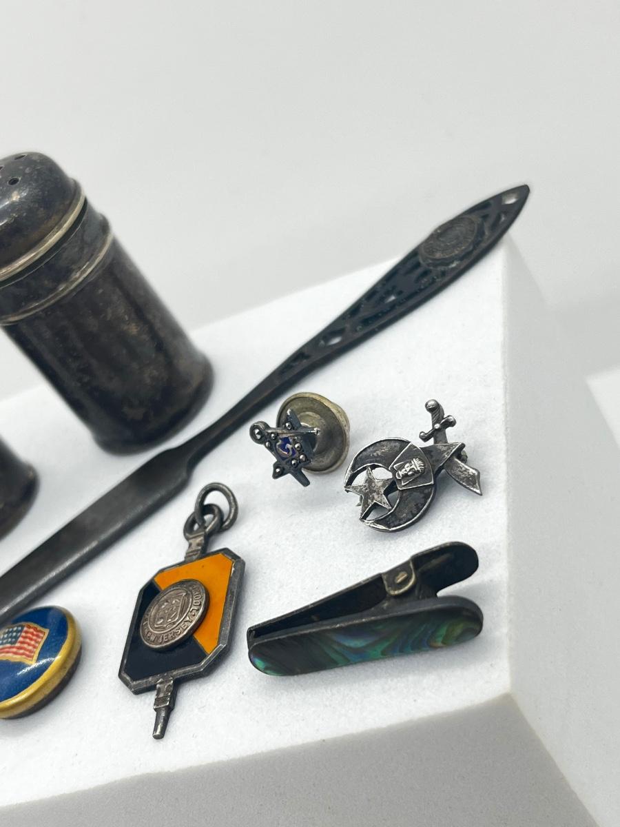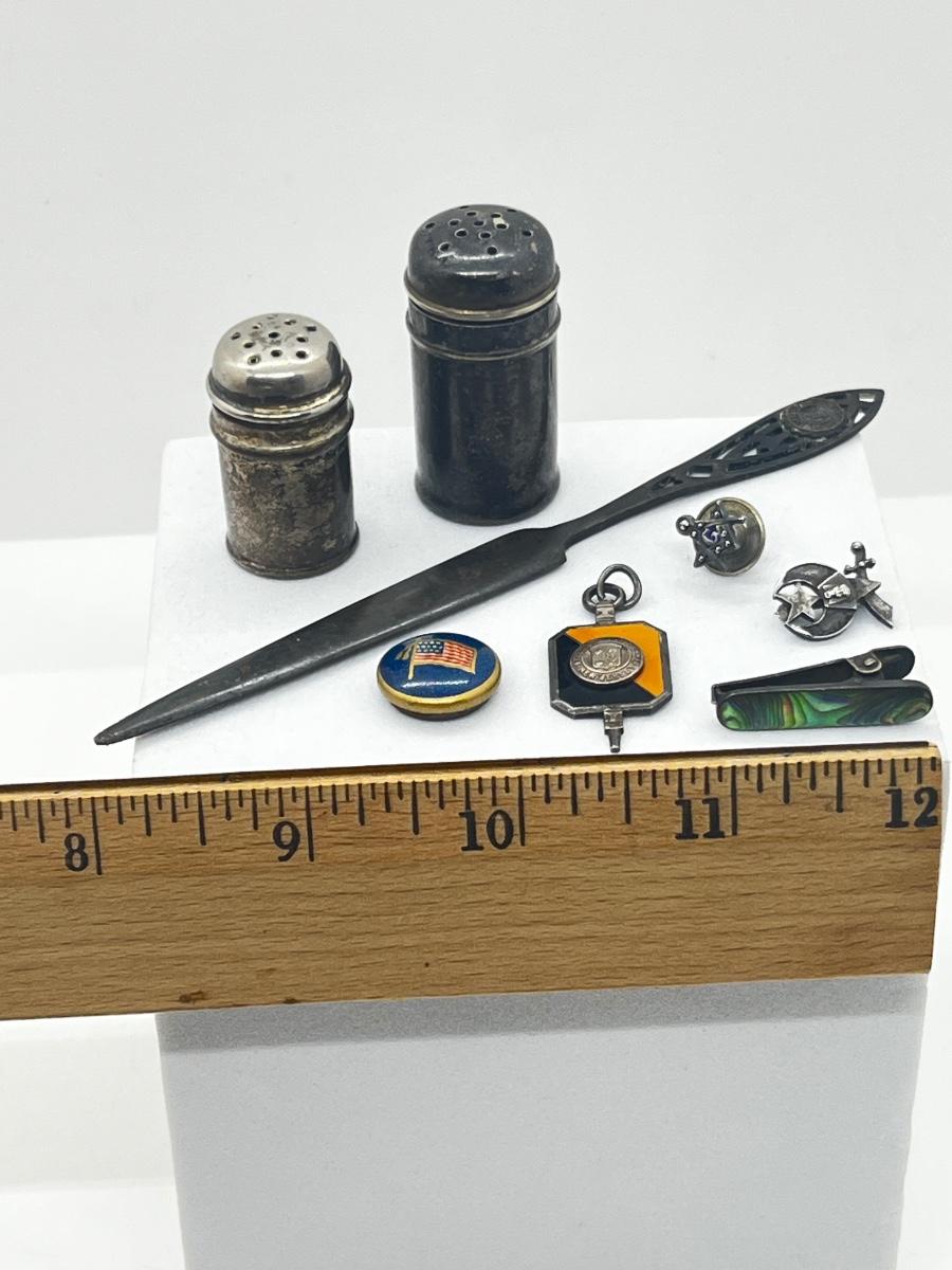 LOT 27: Vintage Sterling Shriner Pin, Sterling Pitman High School Pendant, Marcasite Masonic Pin, Antique Bronze Letter Opener and More!