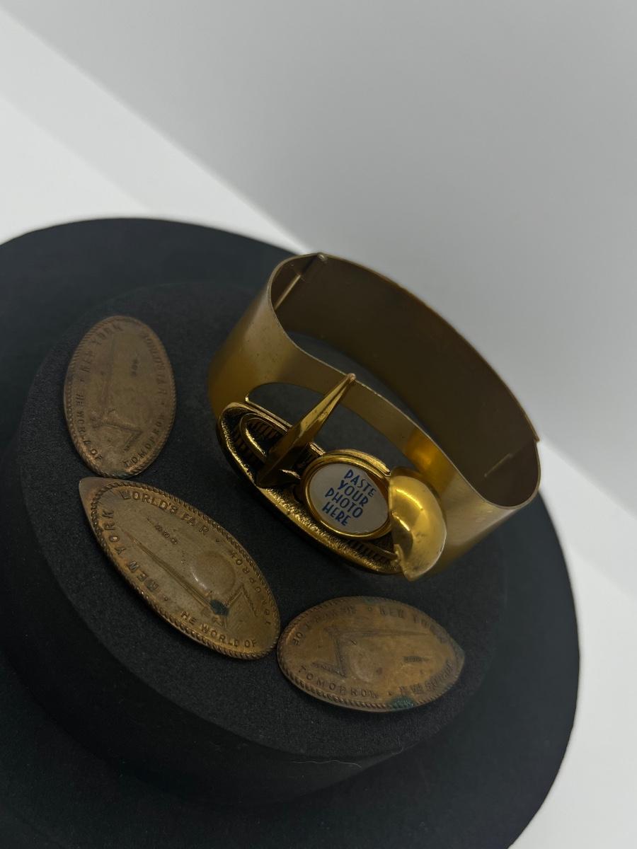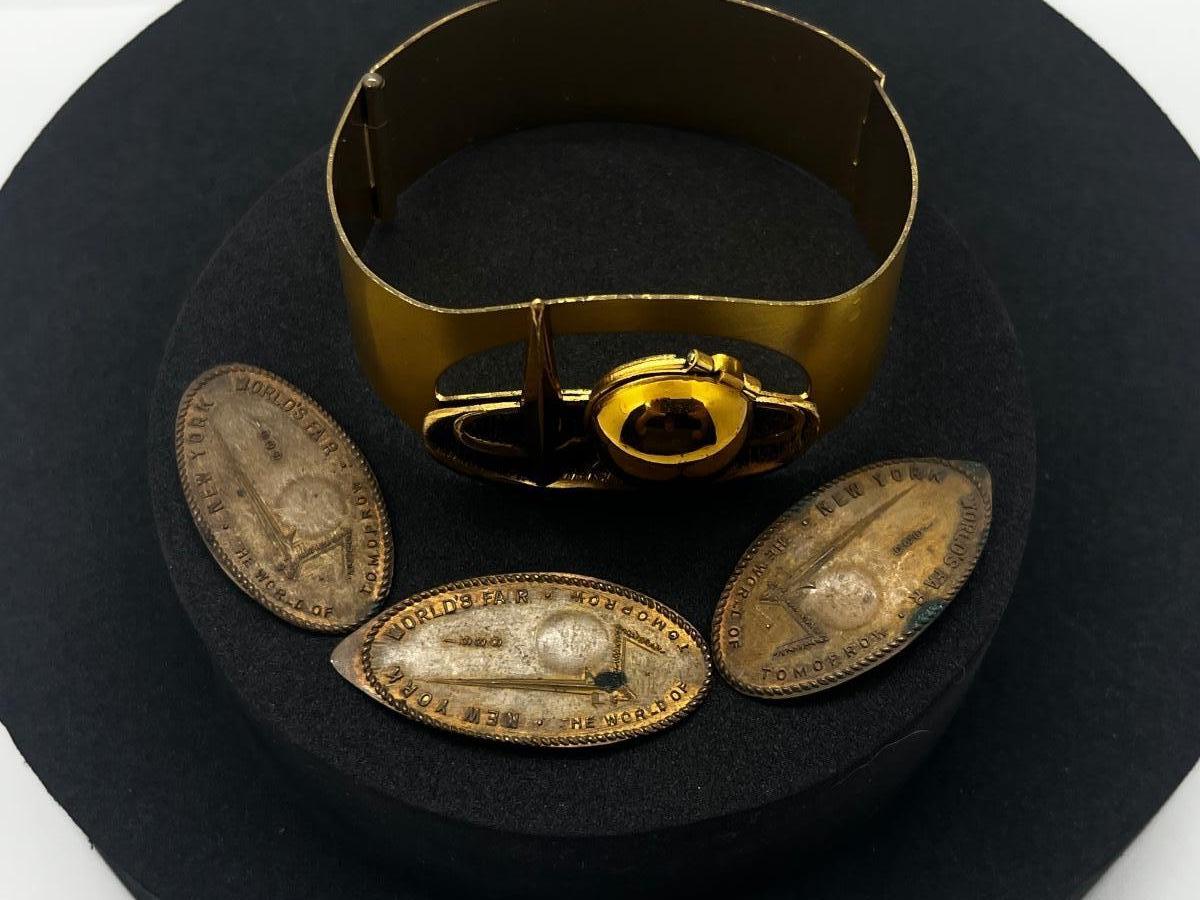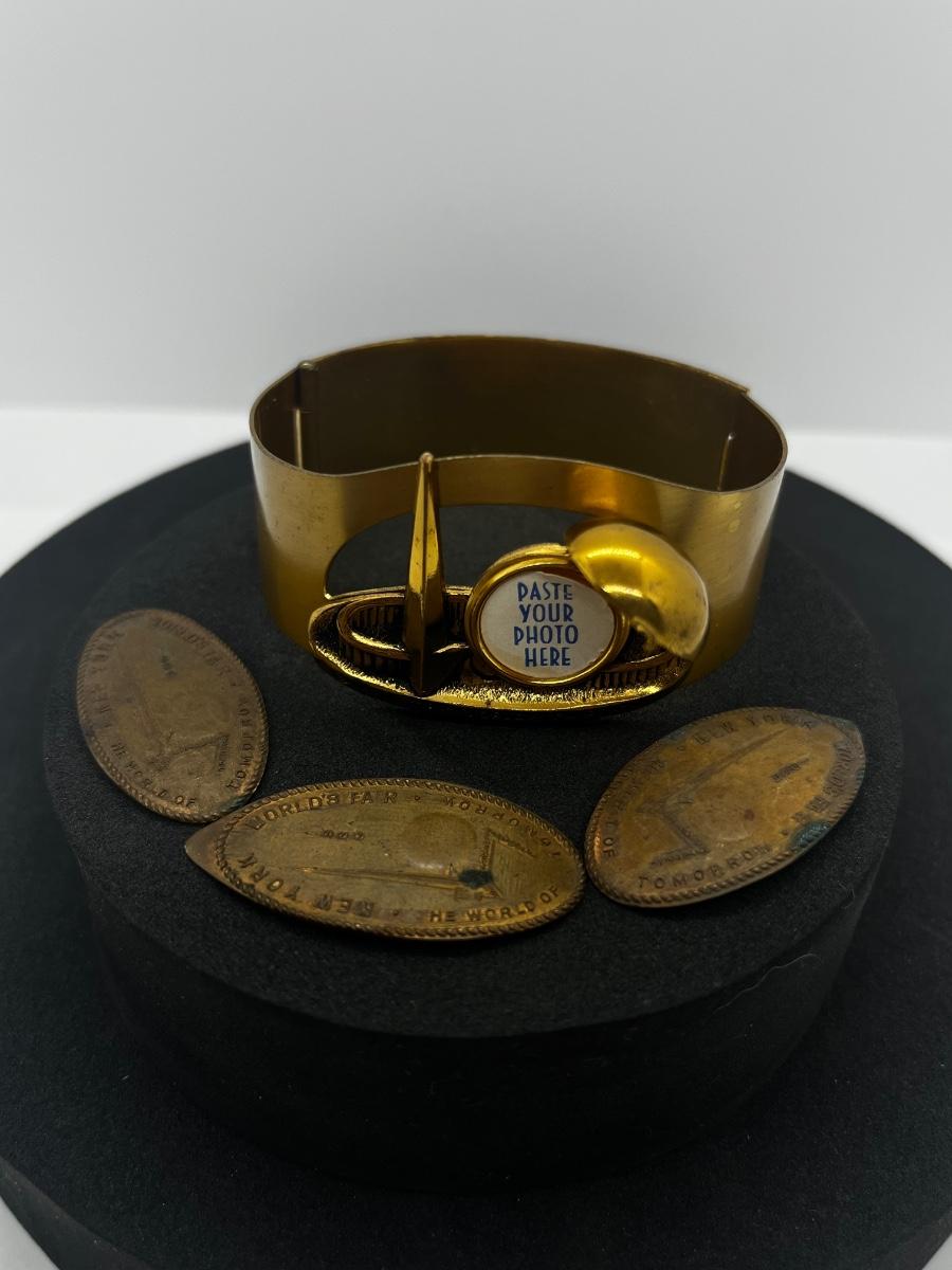 LOT 33: New York World's Fair Lot: Cuff Photo Bracelet and Pressed Pennies
