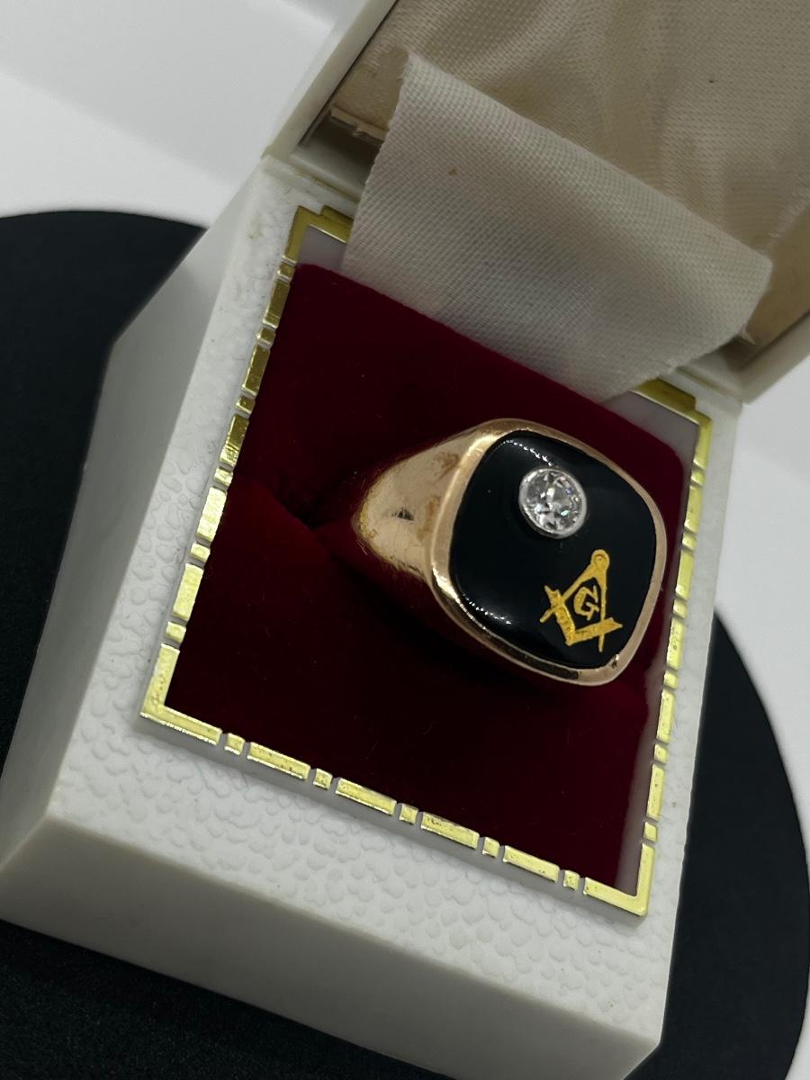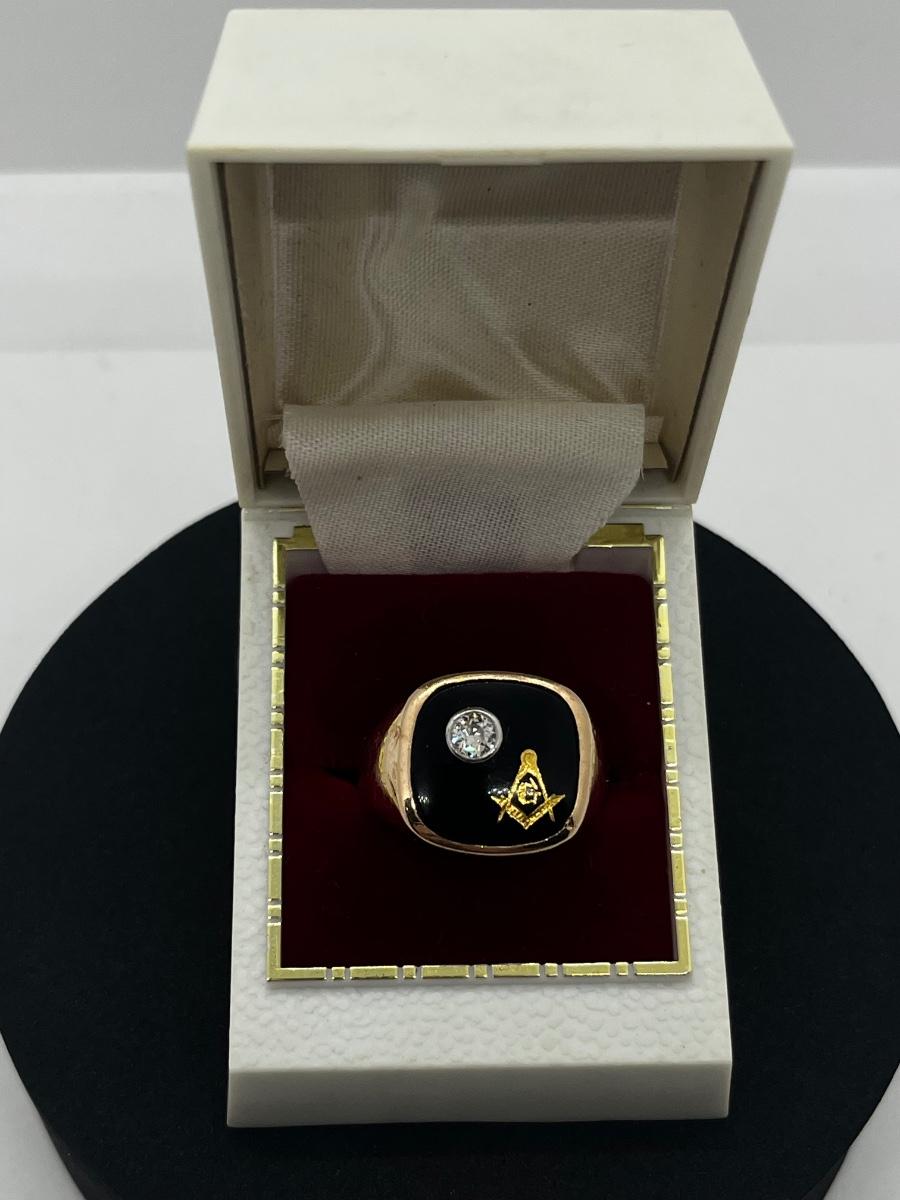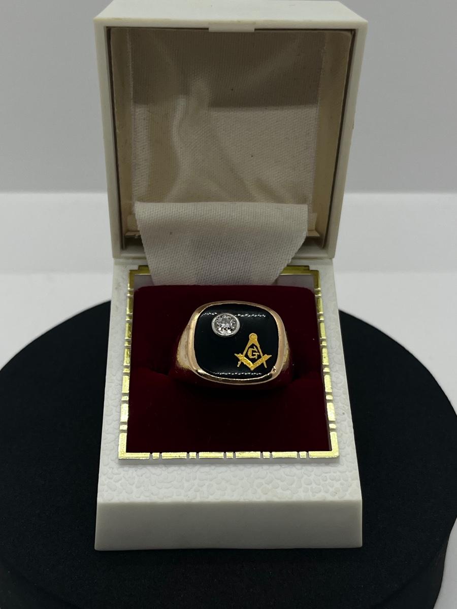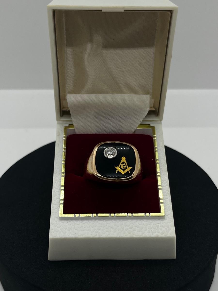 LOT 38: 10K Yellow Gold Masonic Men's Ring with Diamond - Size 10.5 - 9.2 gtw
