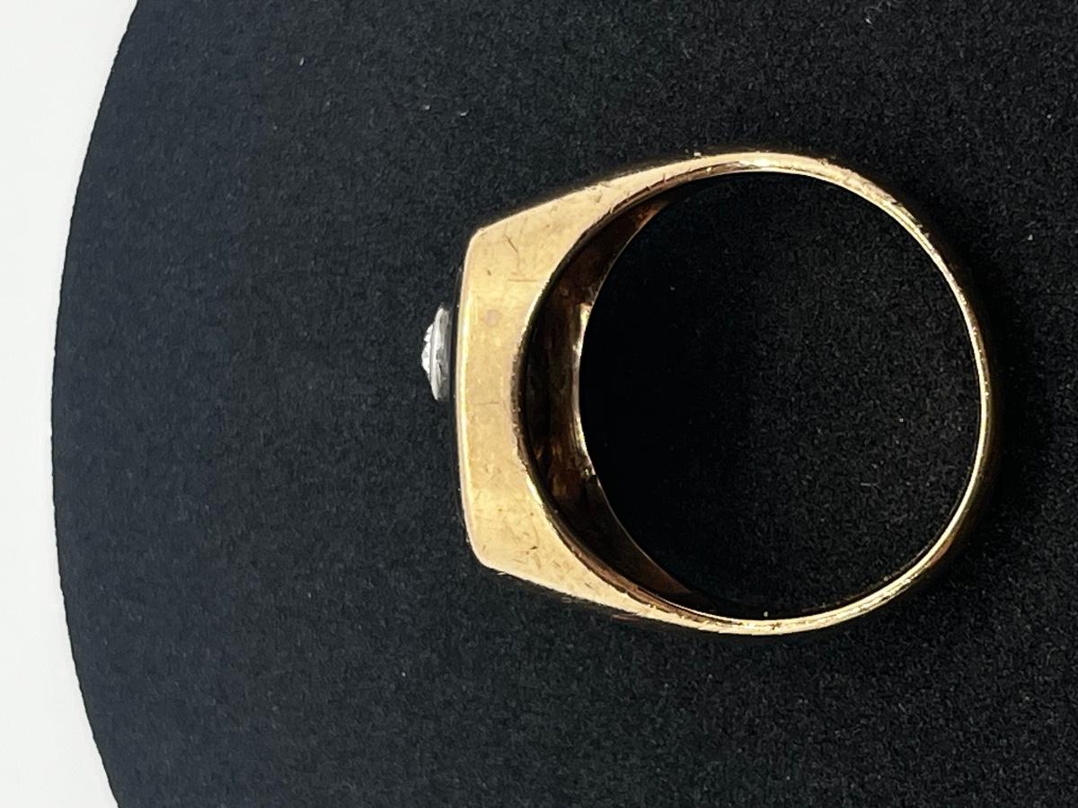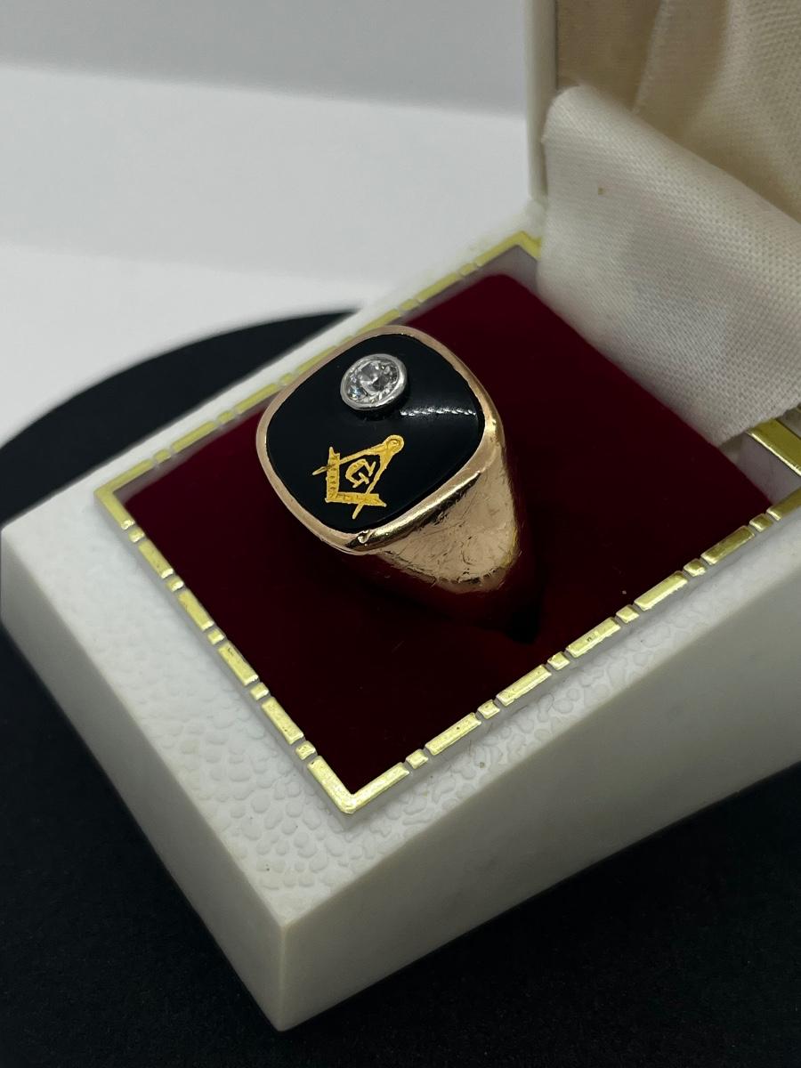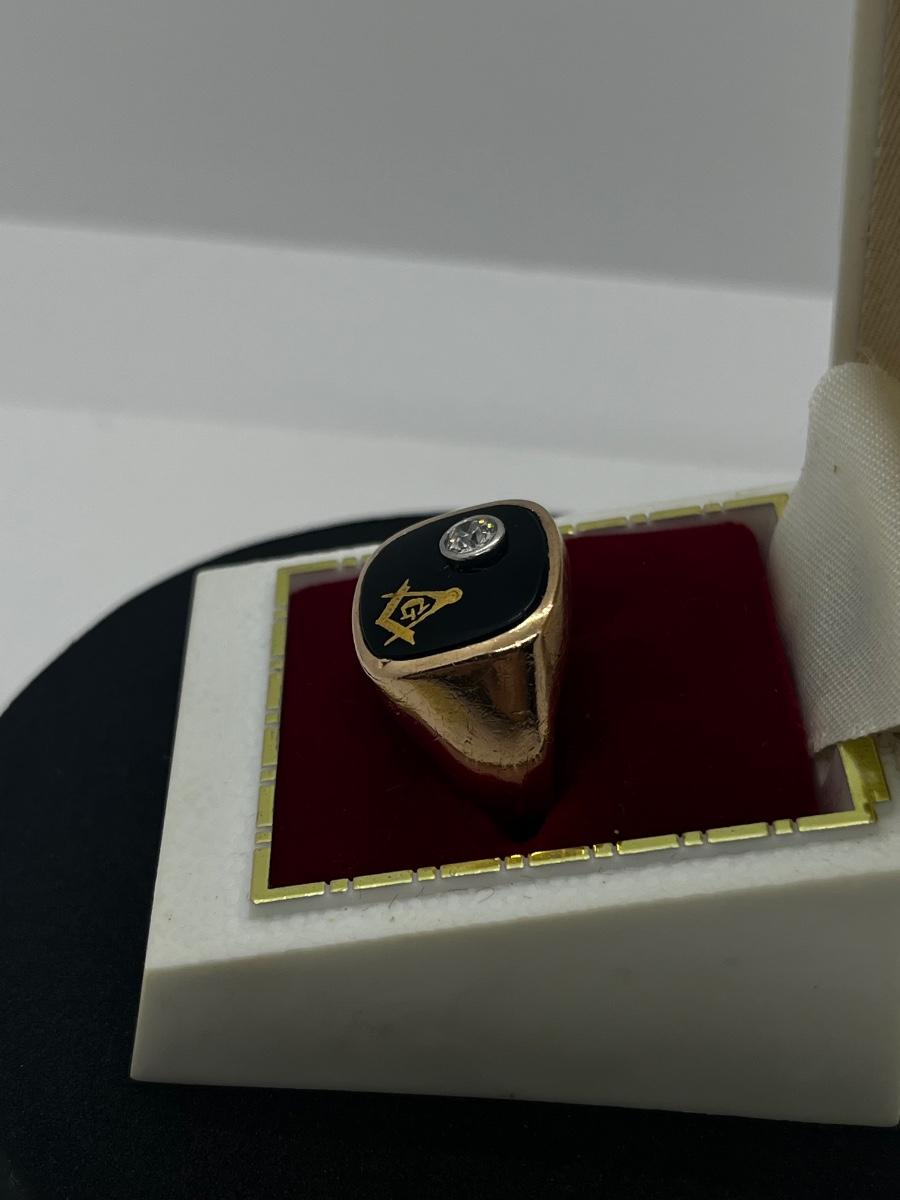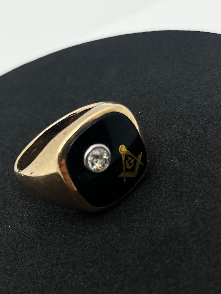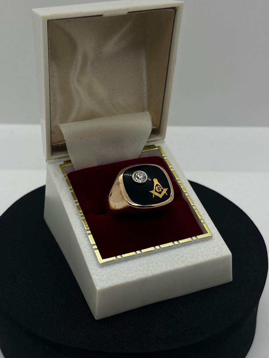 LOT 38: 10K Yellow Gold Masonic Men's Ring with Diamond - Size 10.5 - 9.2 gtw