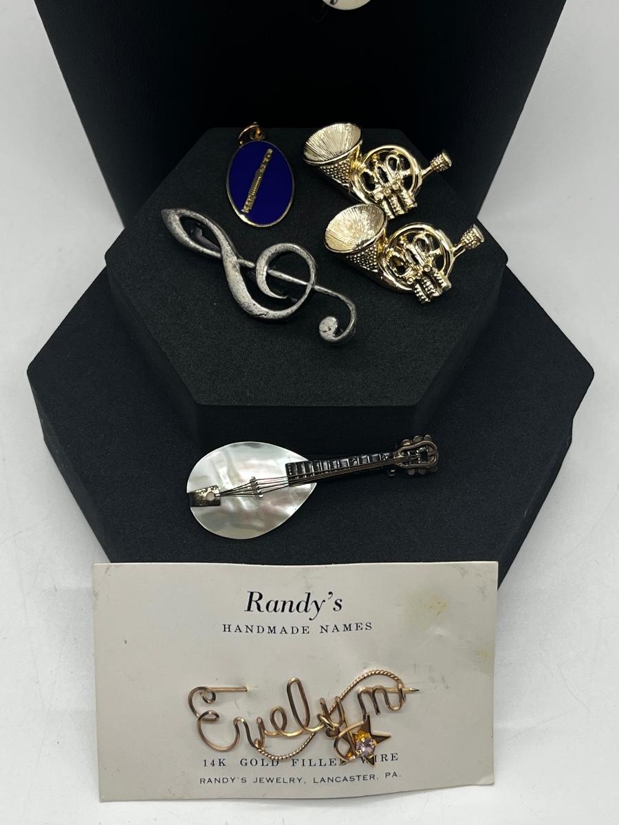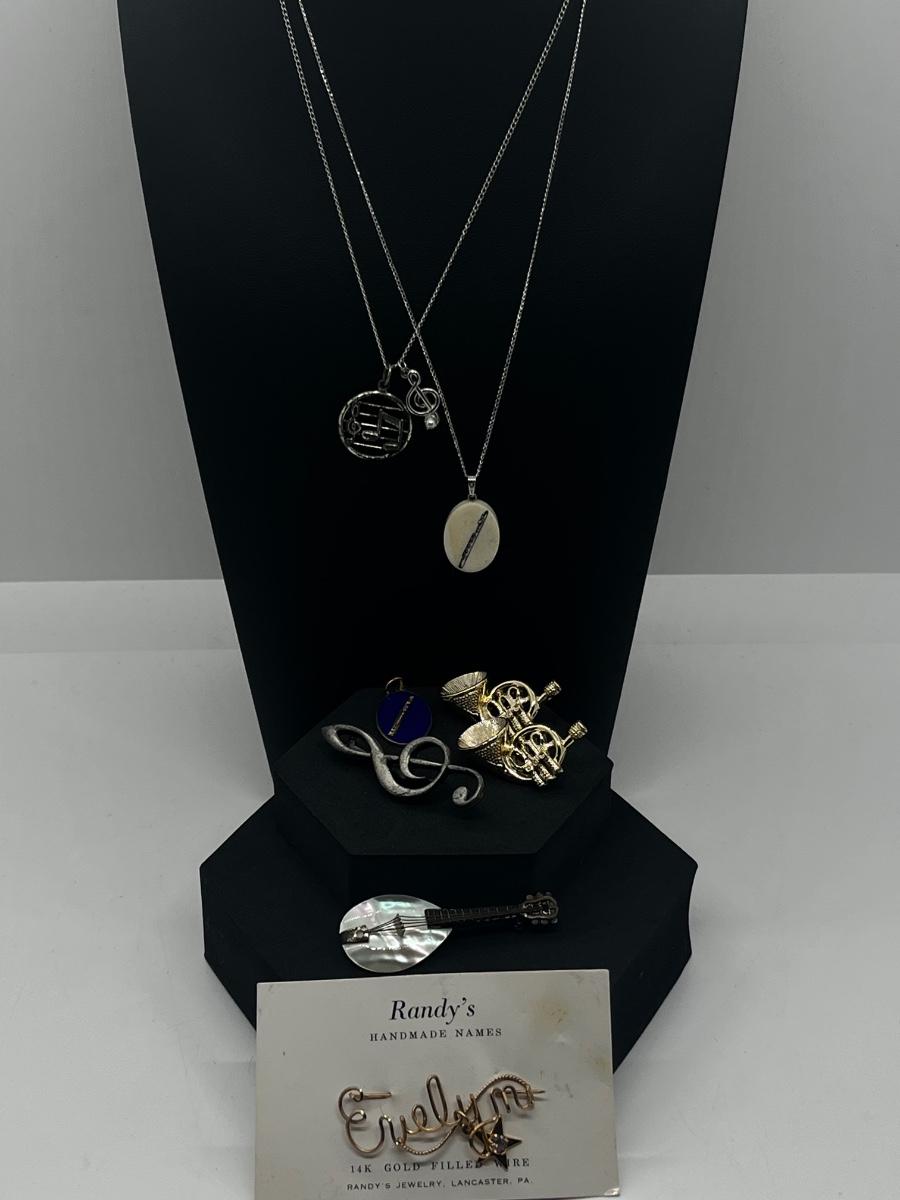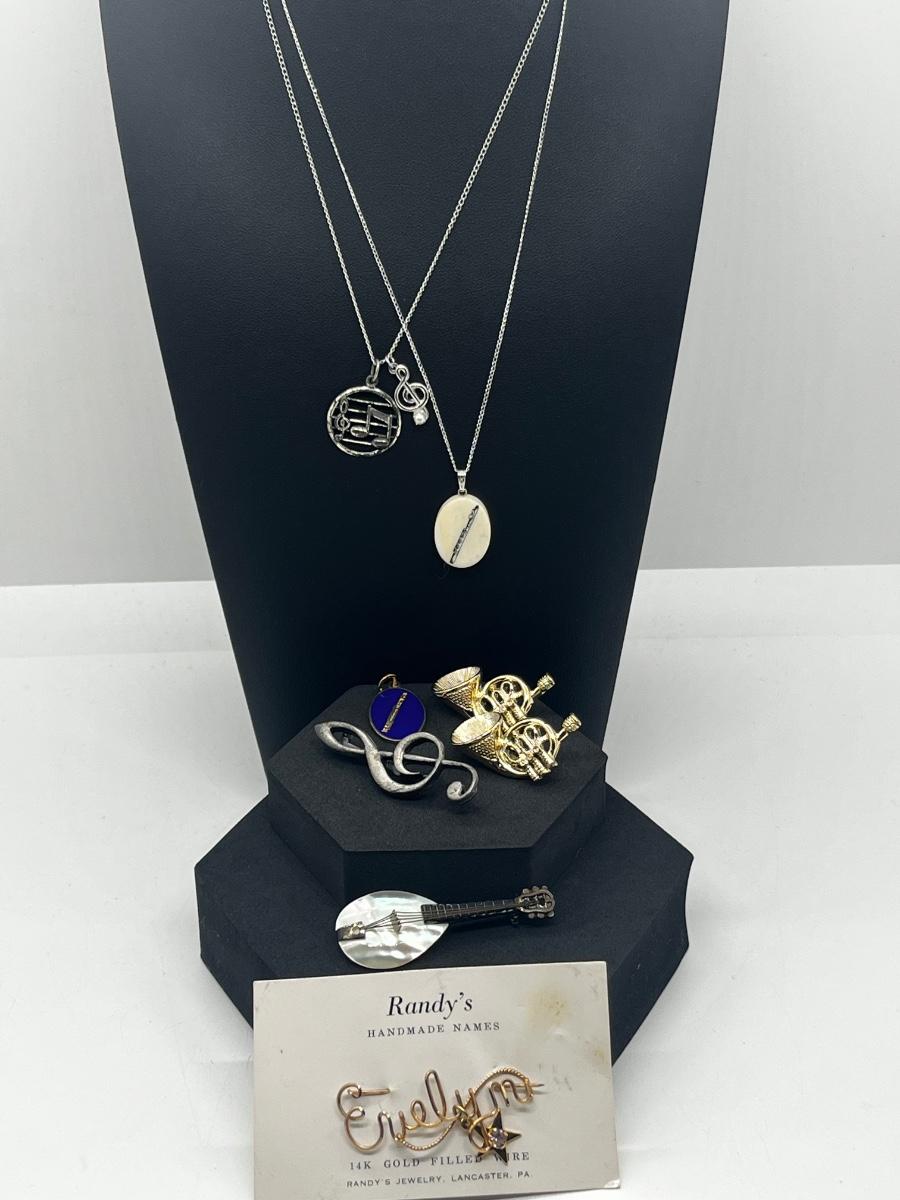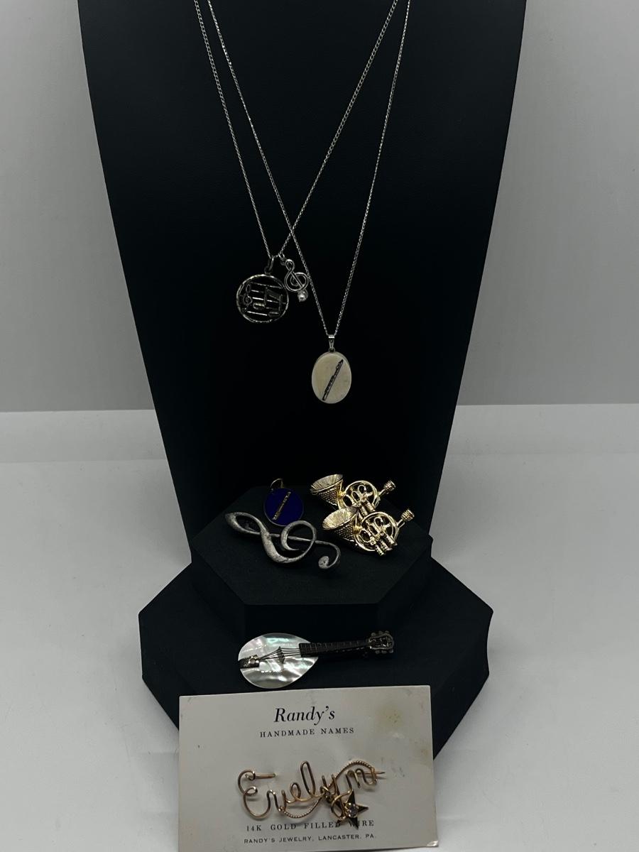 LOT 50: Musical Instrument Themed Costume Jewelry and More - Mother of Pearl Mandolin, Sterling Pendants and Sterling Chains