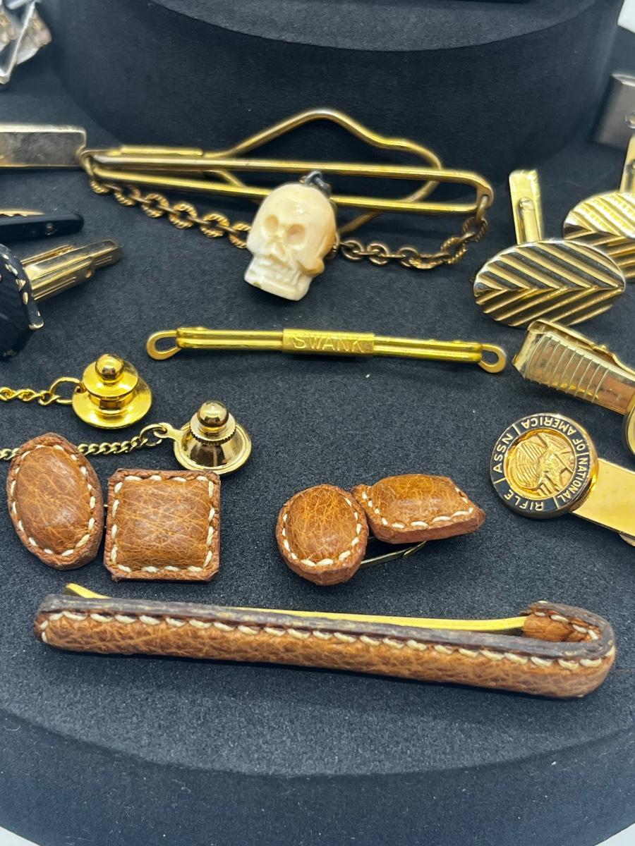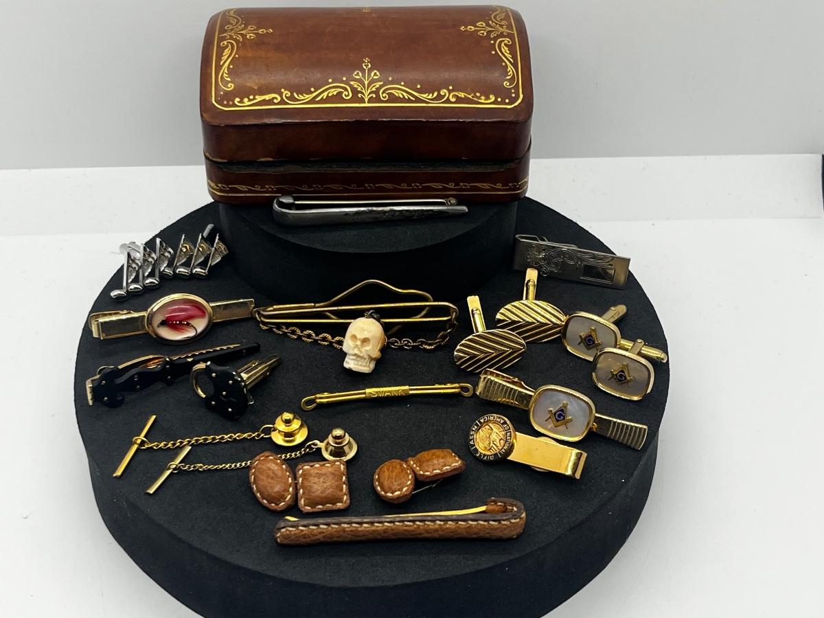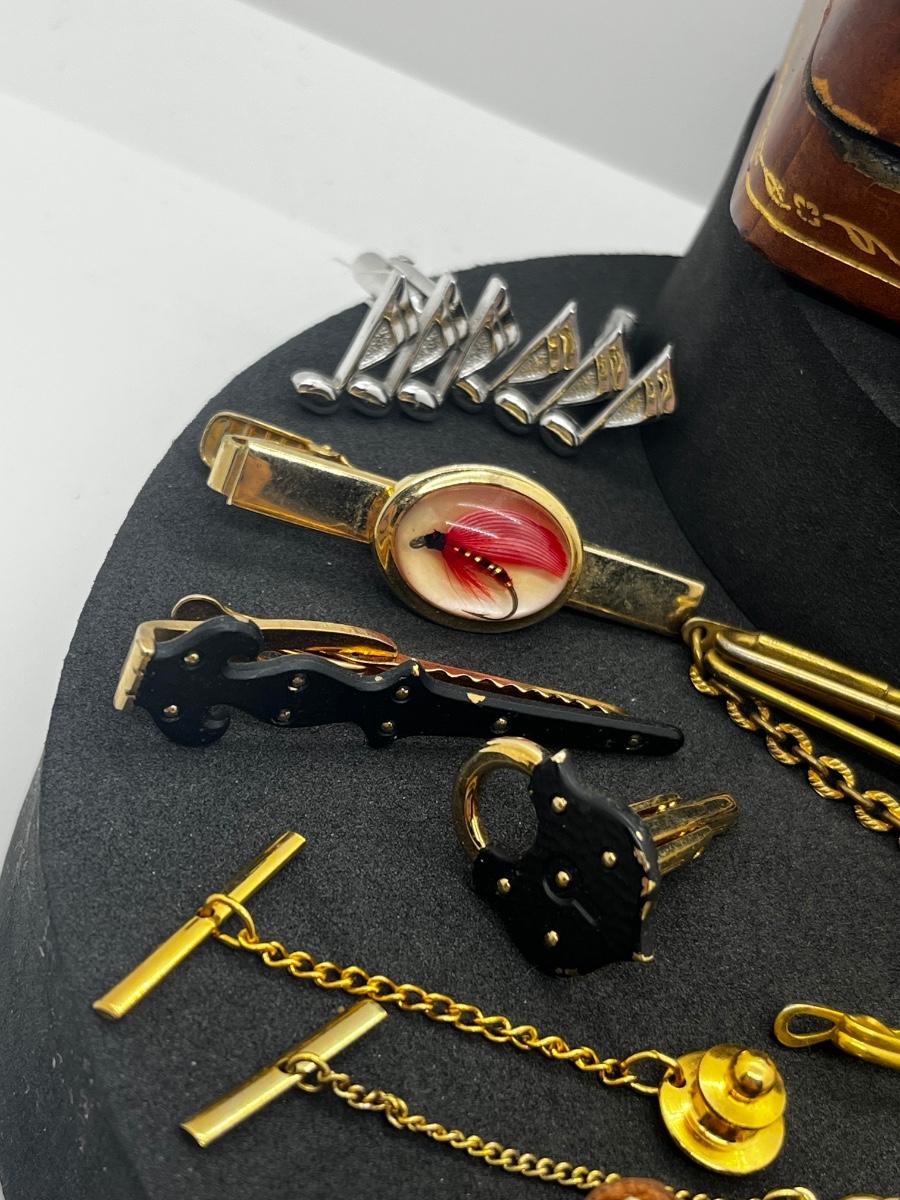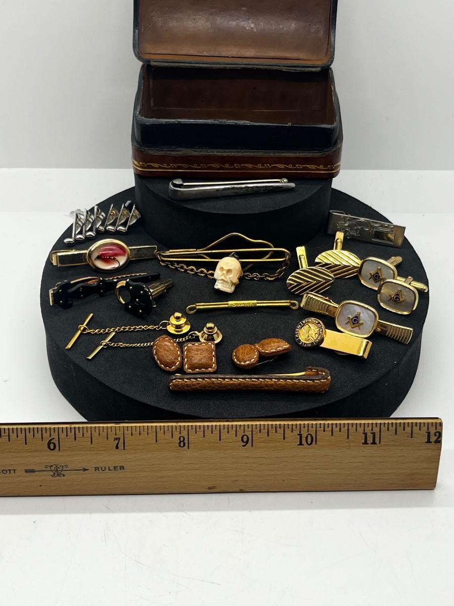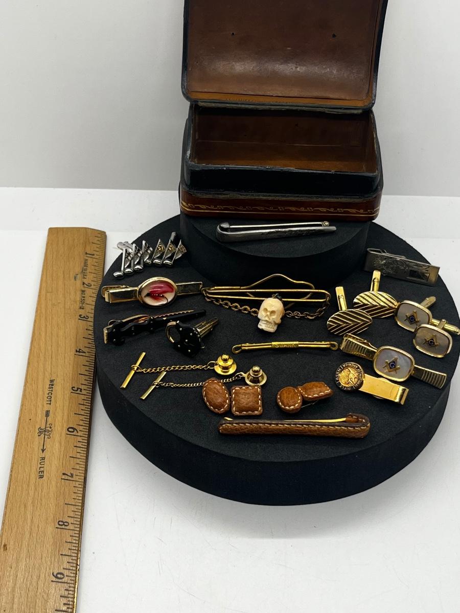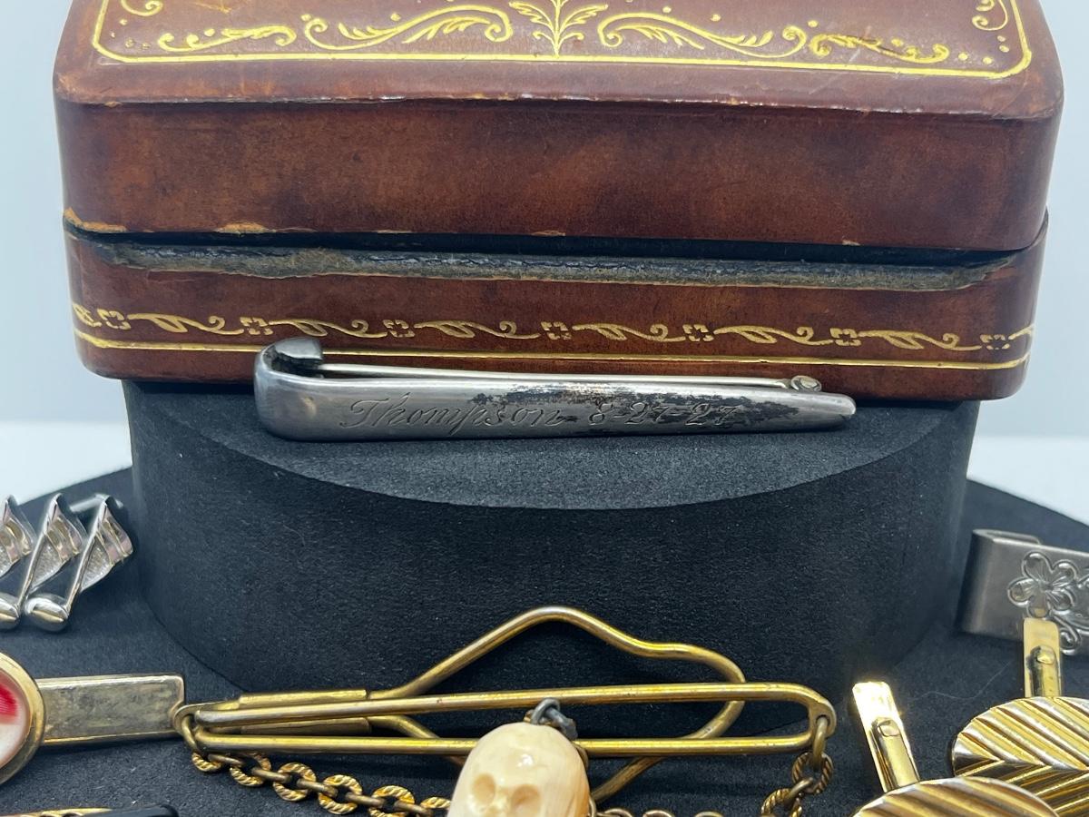 LOT 57: Unique Collection of Vintage Tie Pins and Cufflinks with Vintage Leather Box