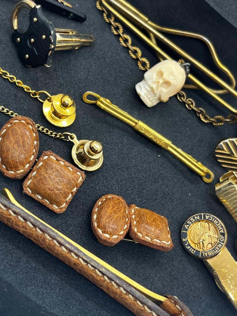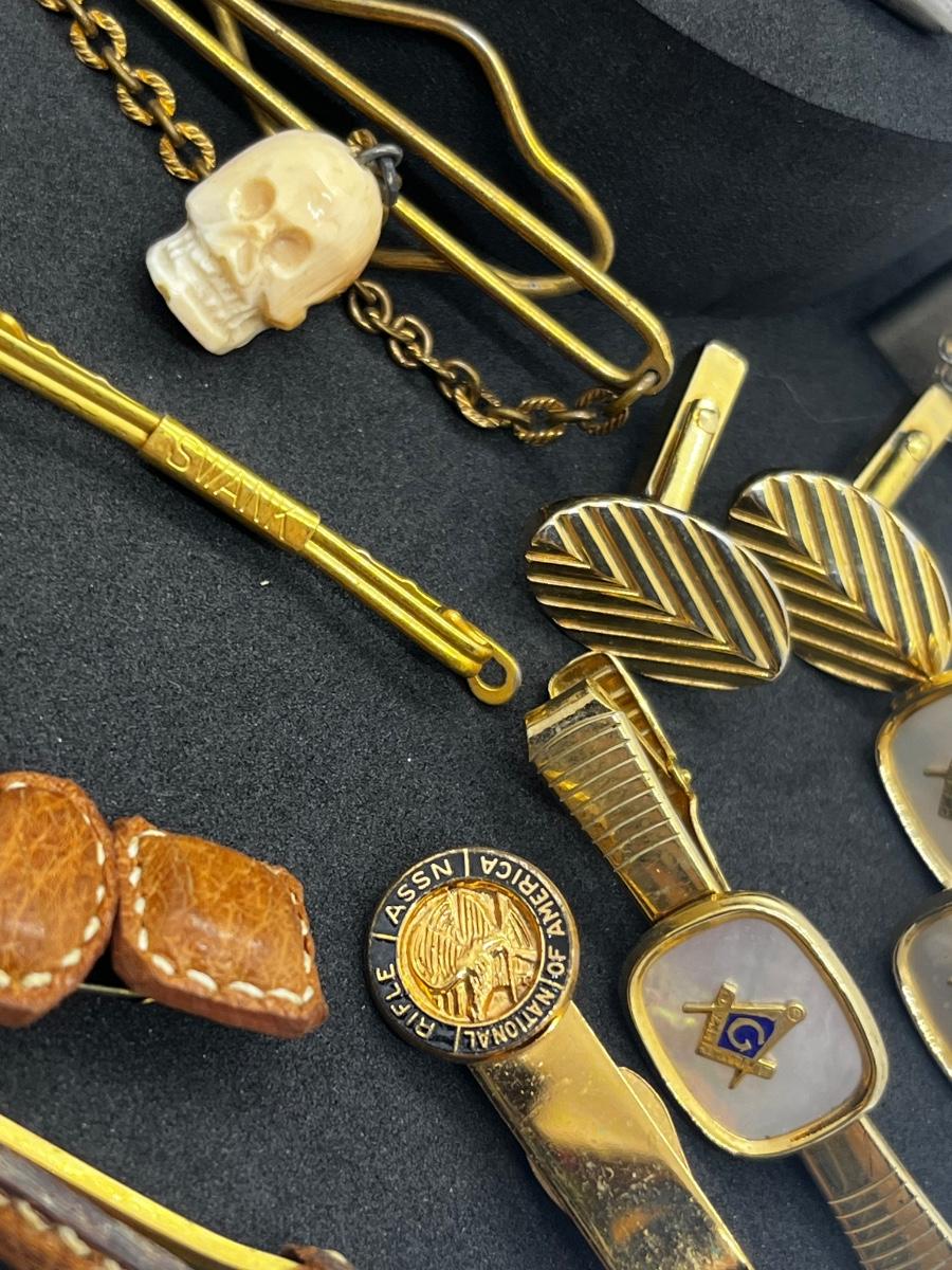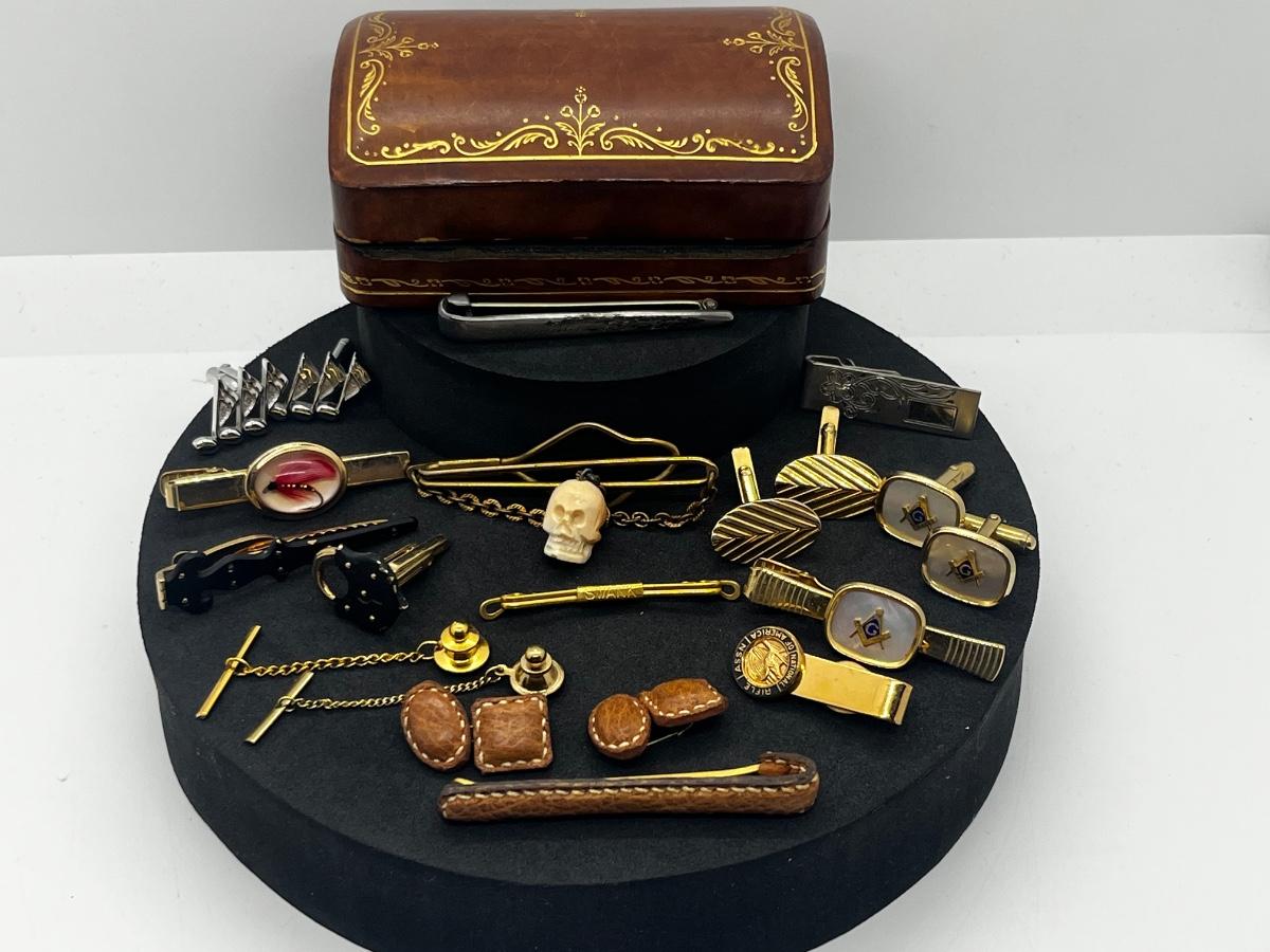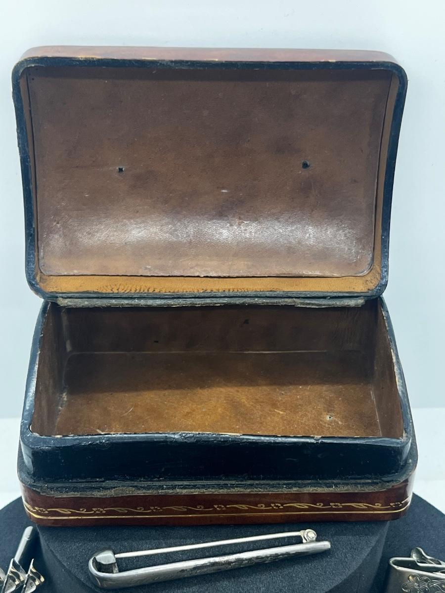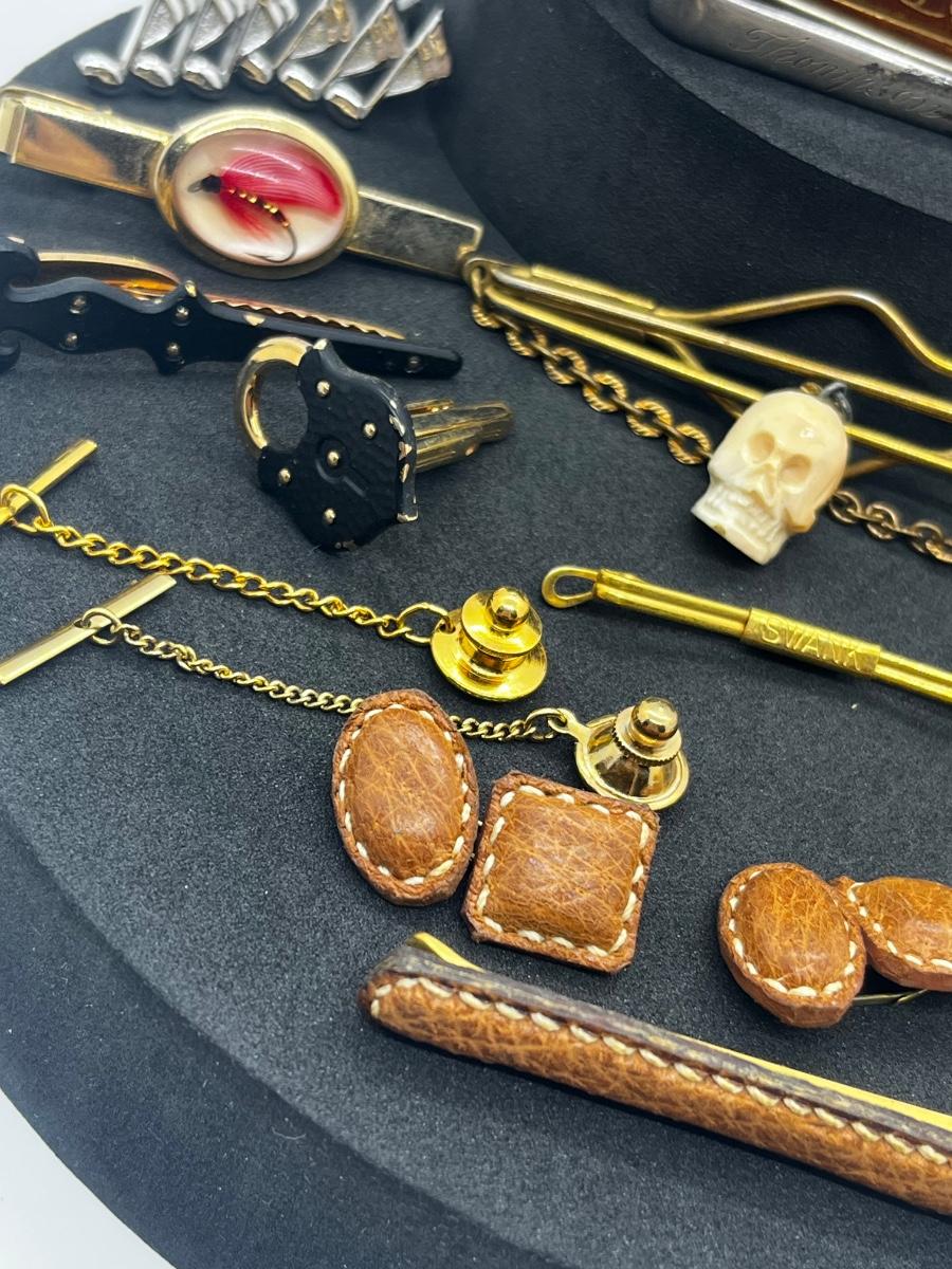 LOT 57: Unique Collection of Vintage Tie Pins and Cufflinks with Vintage Leather Box