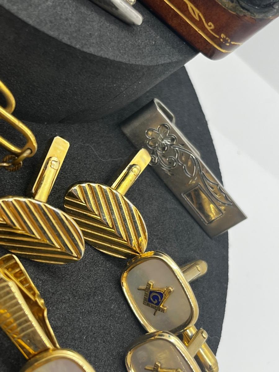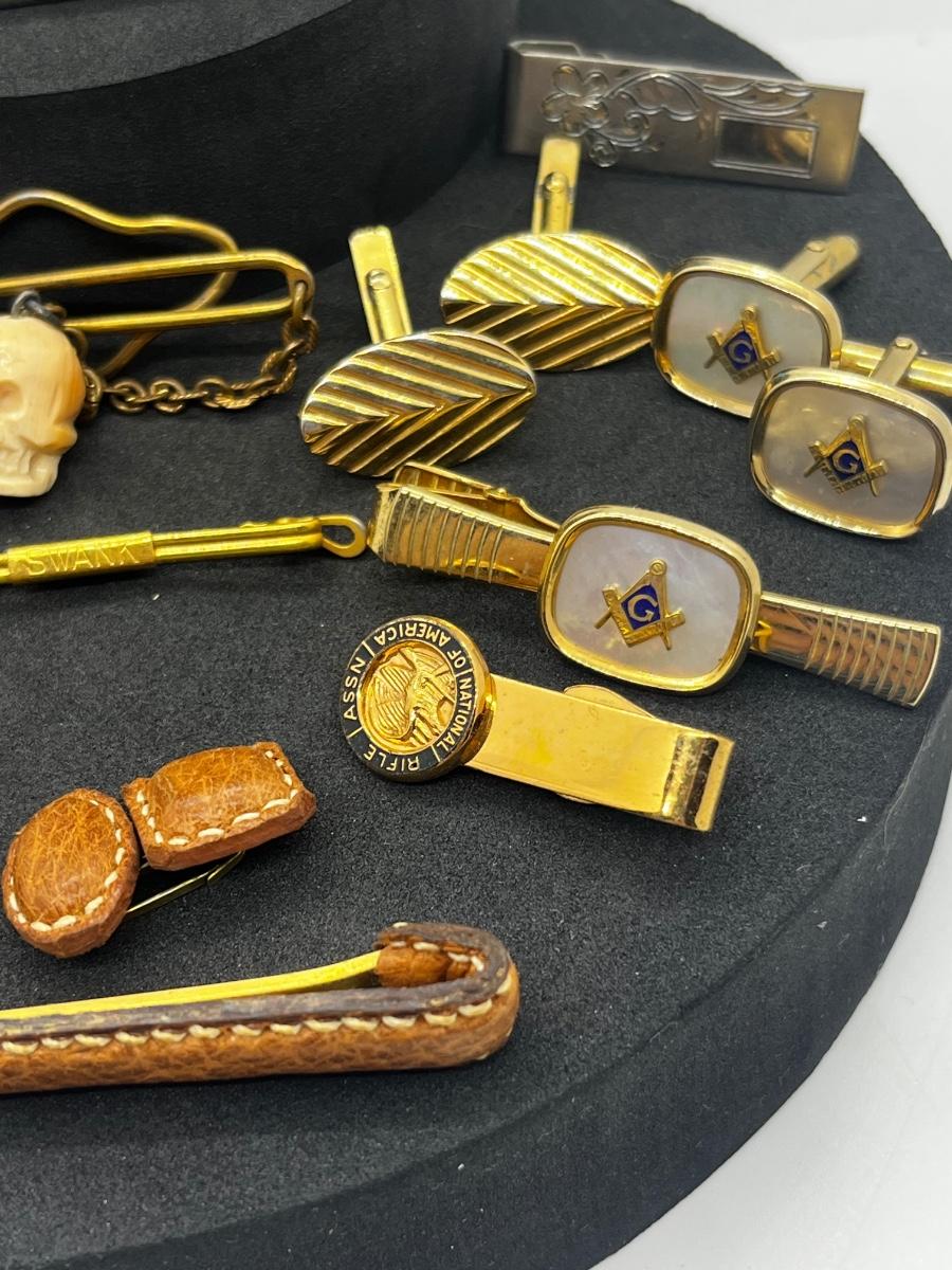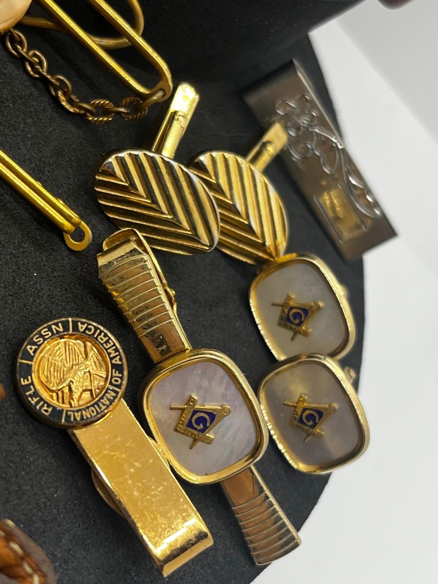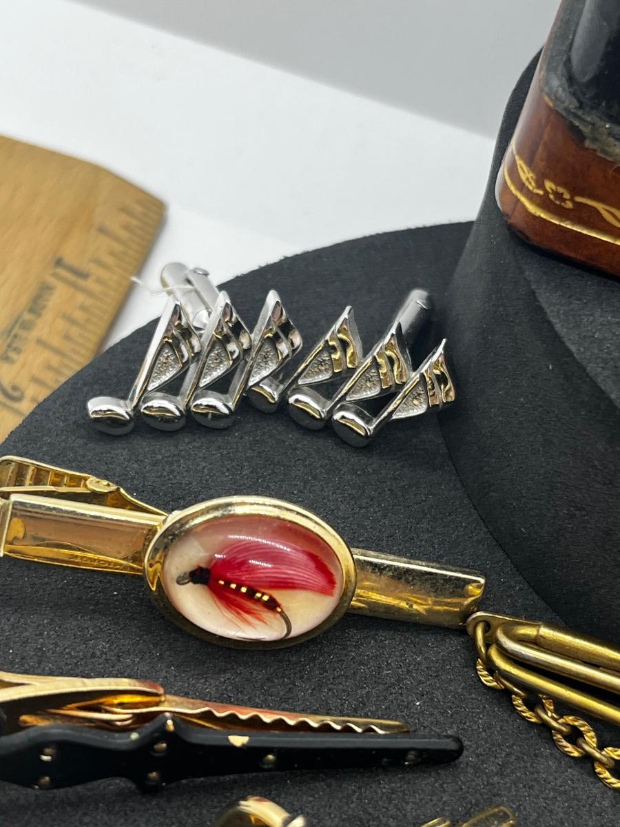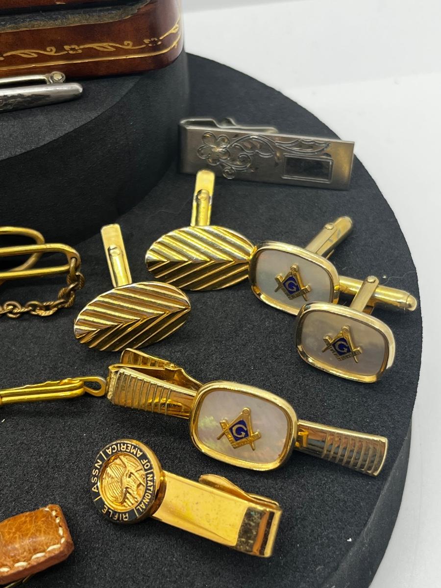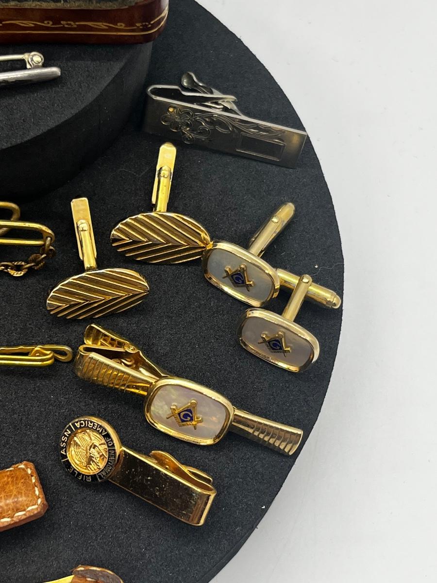 LOT 57: Unique Collection of Vintage Tie Pins and Cufflinks with Vintage Leather Box