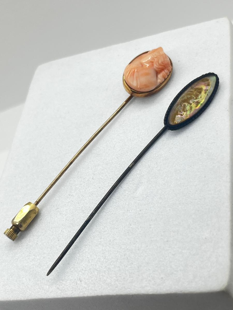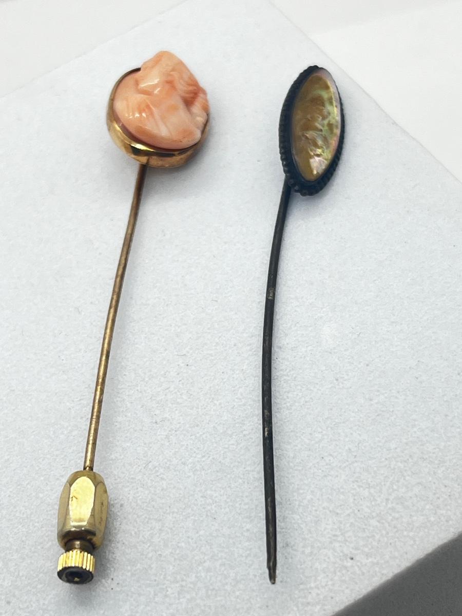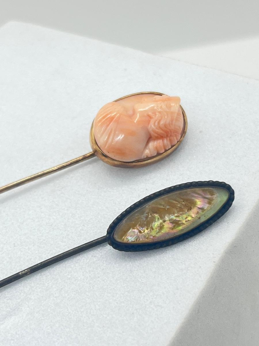 LOT 66: Antique / Vintage Stick Pins - 10K Gold Coral Cameo (4.6gtw) and Sterling Silver w/ Mother of Pearl (2.7 gtw)
