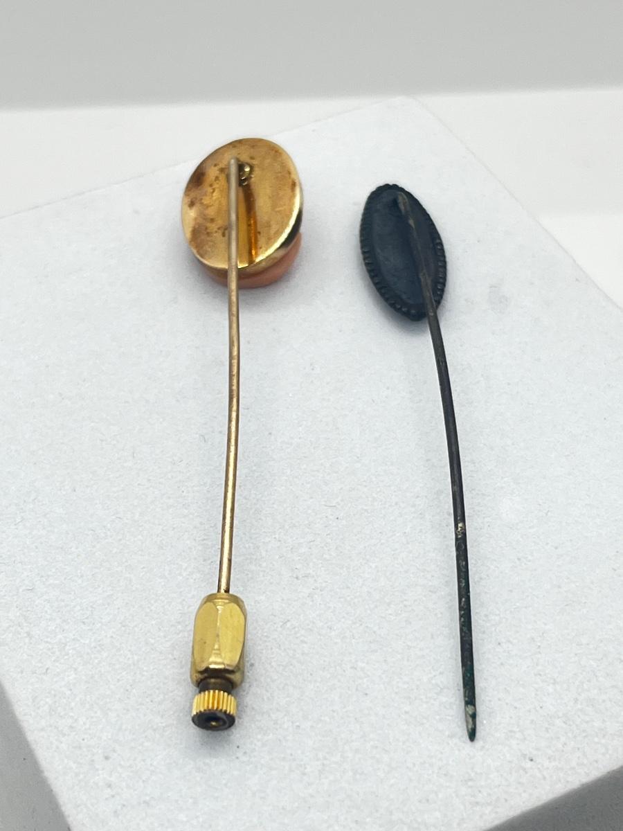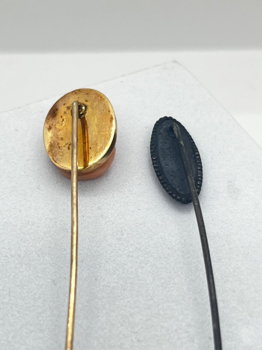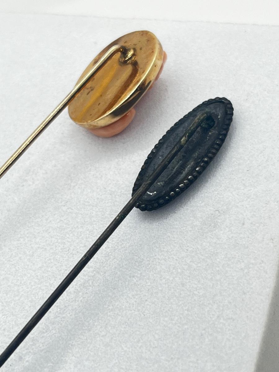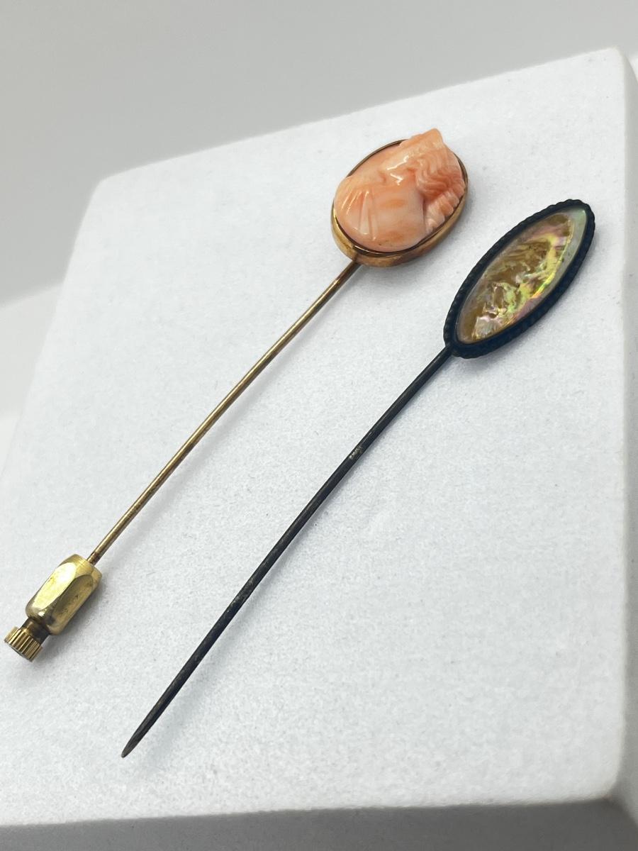 LOT 66: Antique / Vintage Stick Pins - 10K Gold Coral Cameo (4.6gtw) and Sterling Silver w/ Mother of Pearl (2.7 gtw)