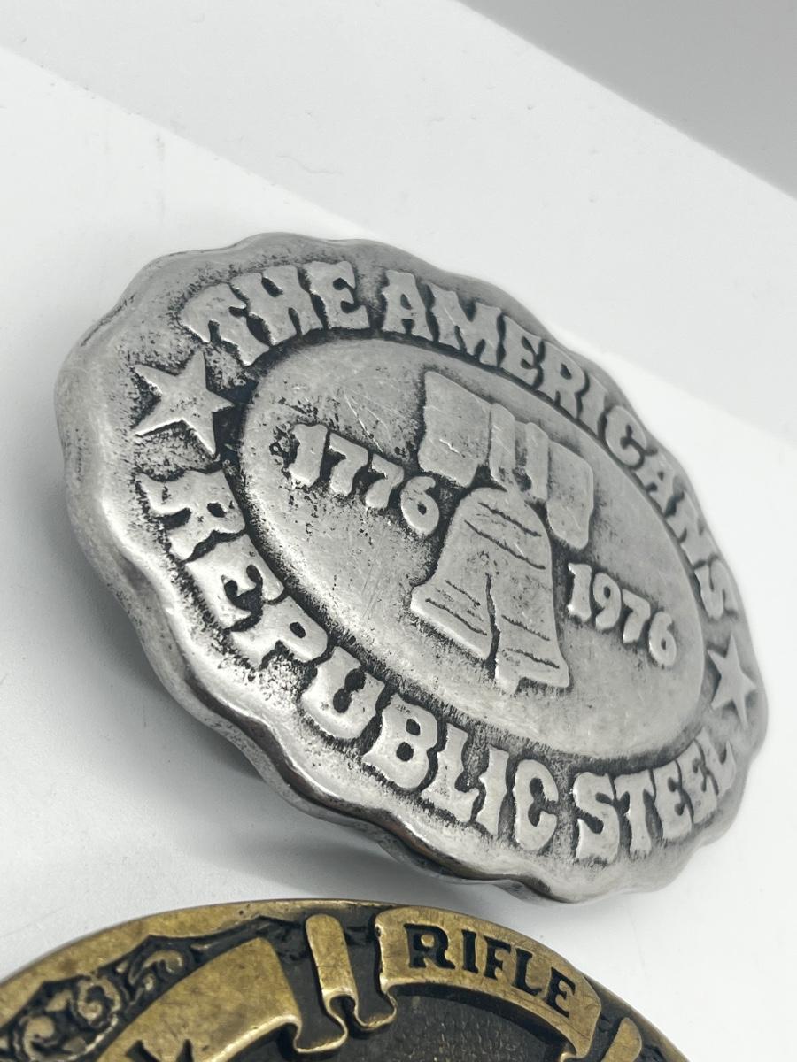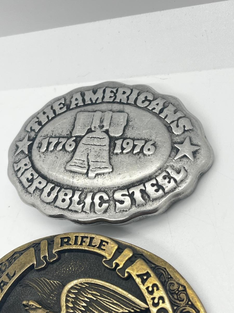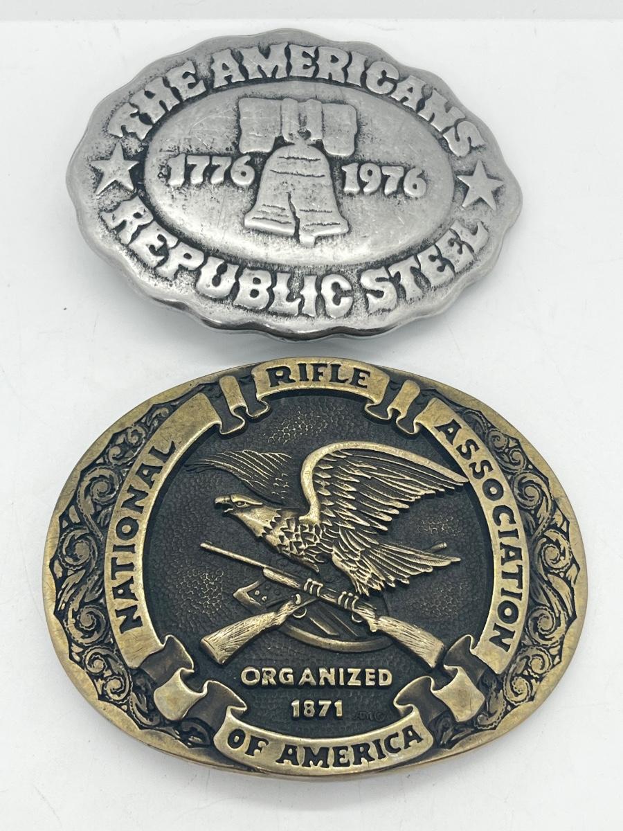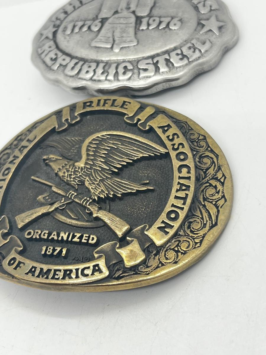 LOT 79: Big and Heavy Vintage Belt Buckles - National Rifle Association and The Americans Republic Steel
