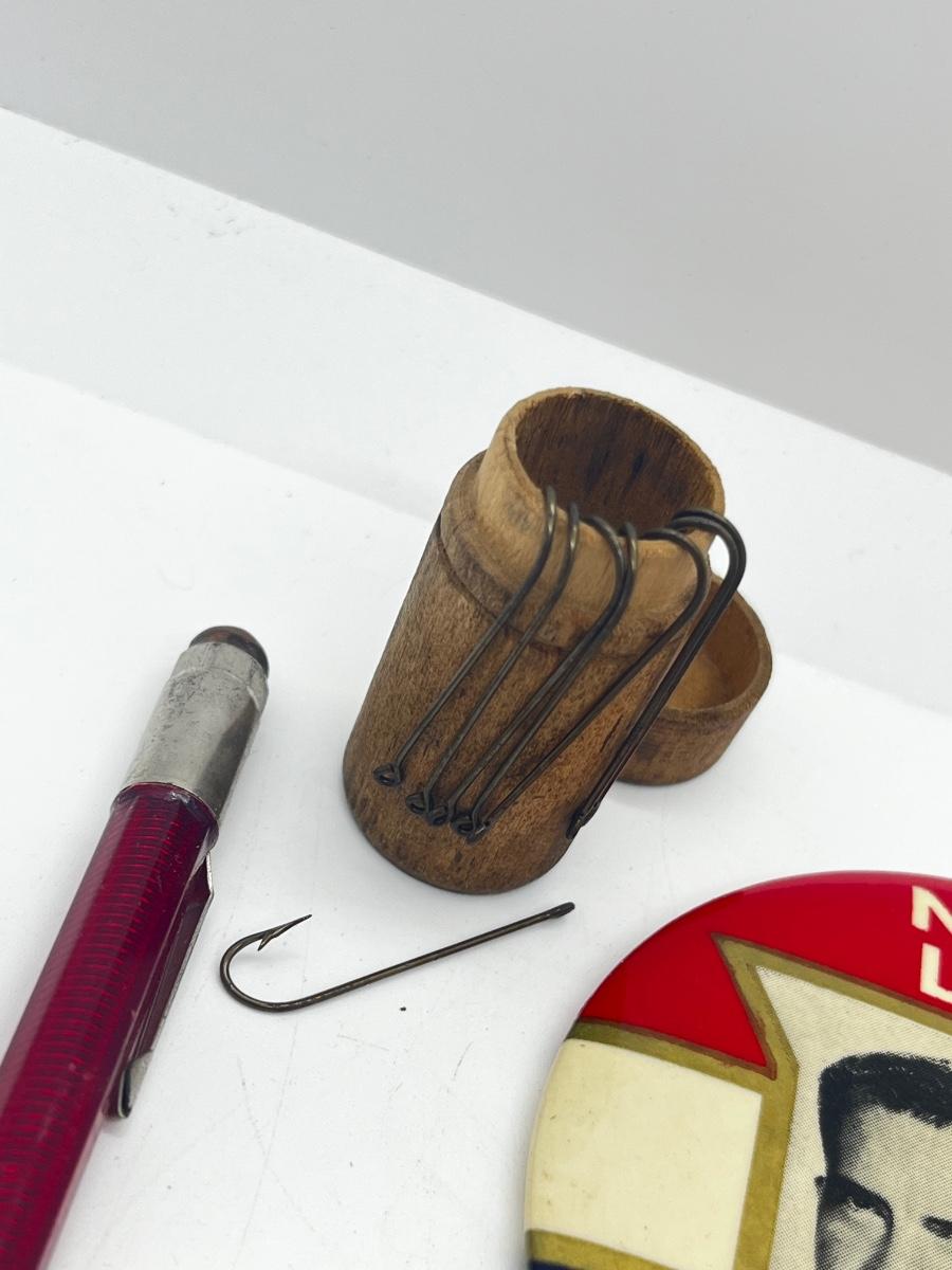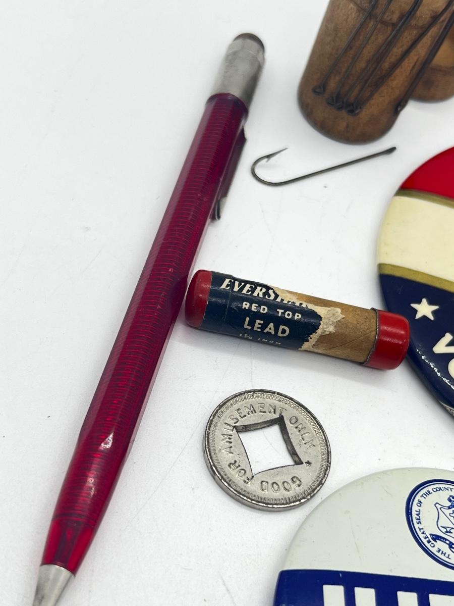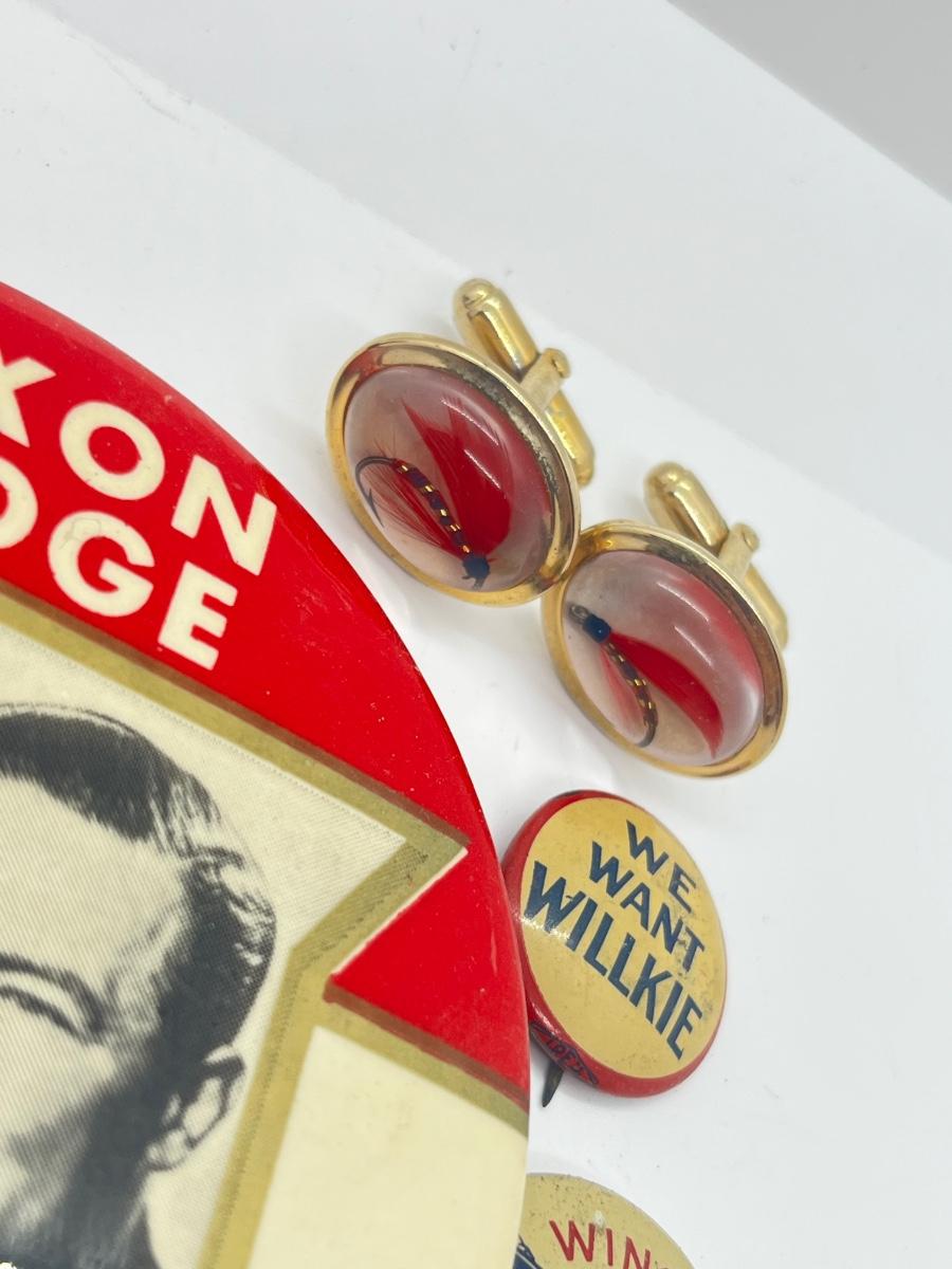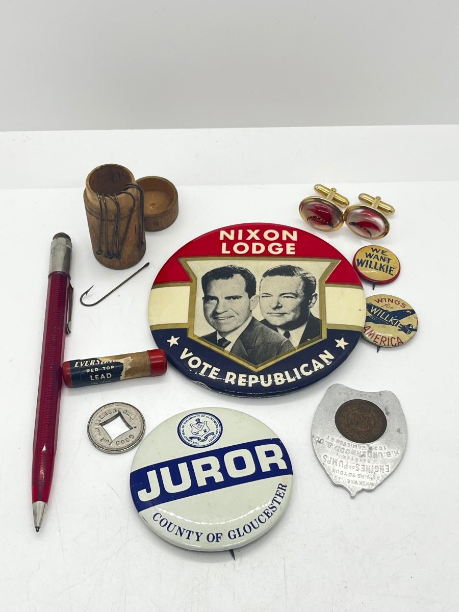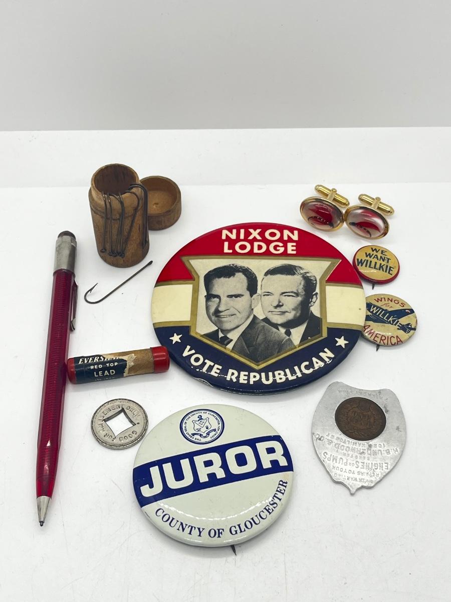 LOT 80: Vintage Odds and Ends: Political Button, Fish Hook Cufflinks, Lead Pencil and More!