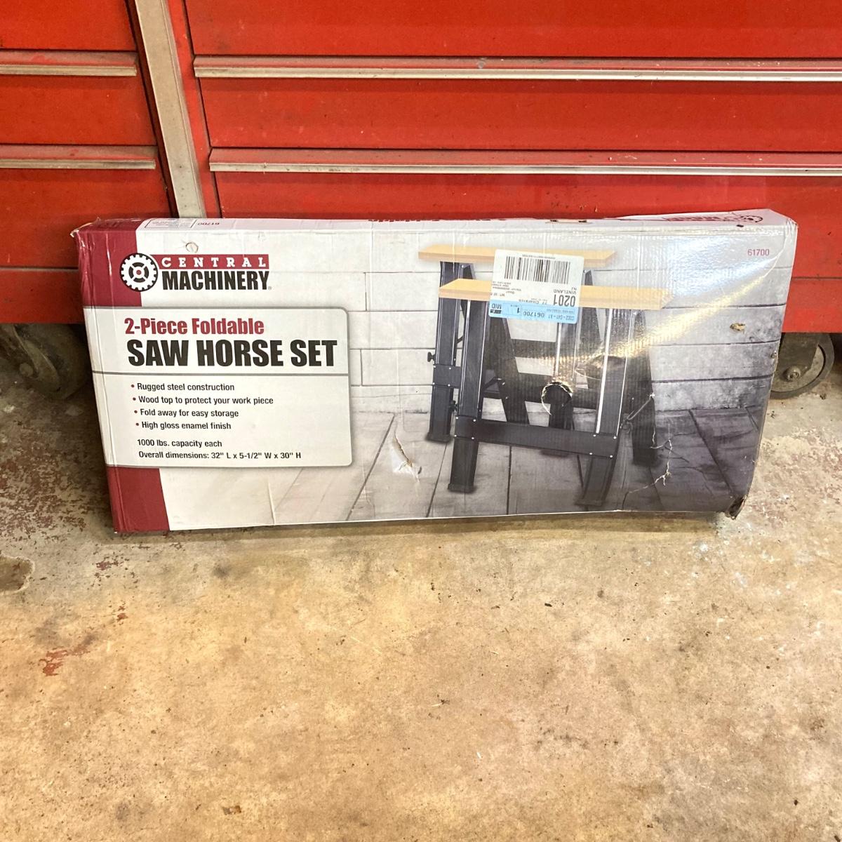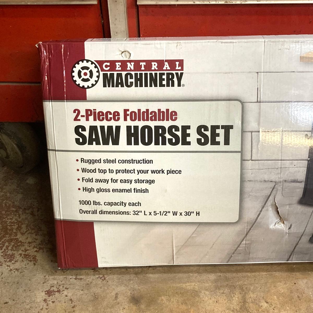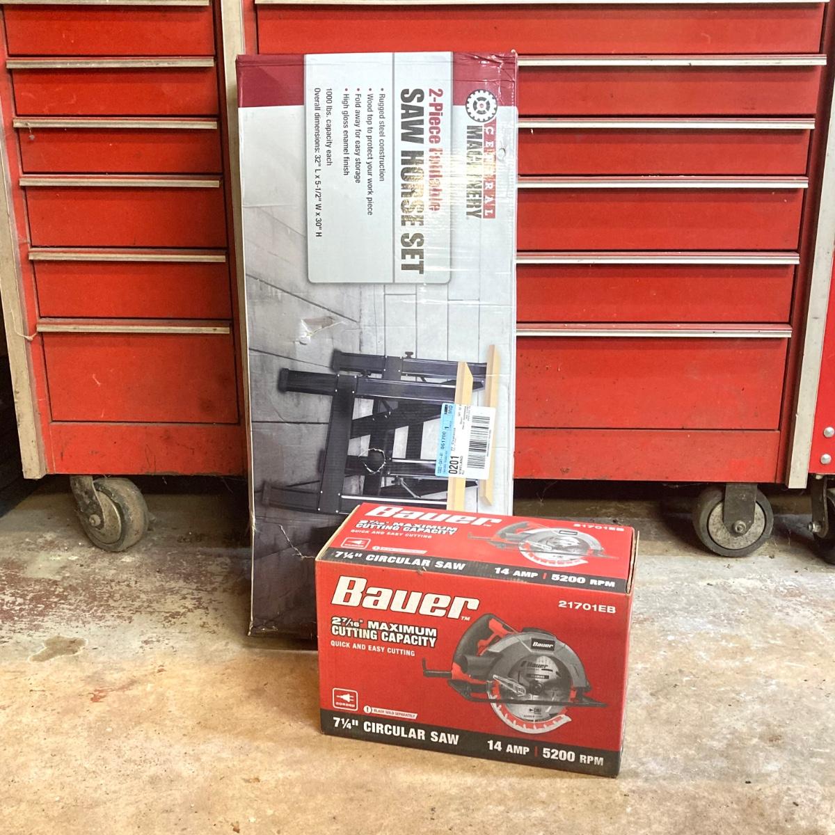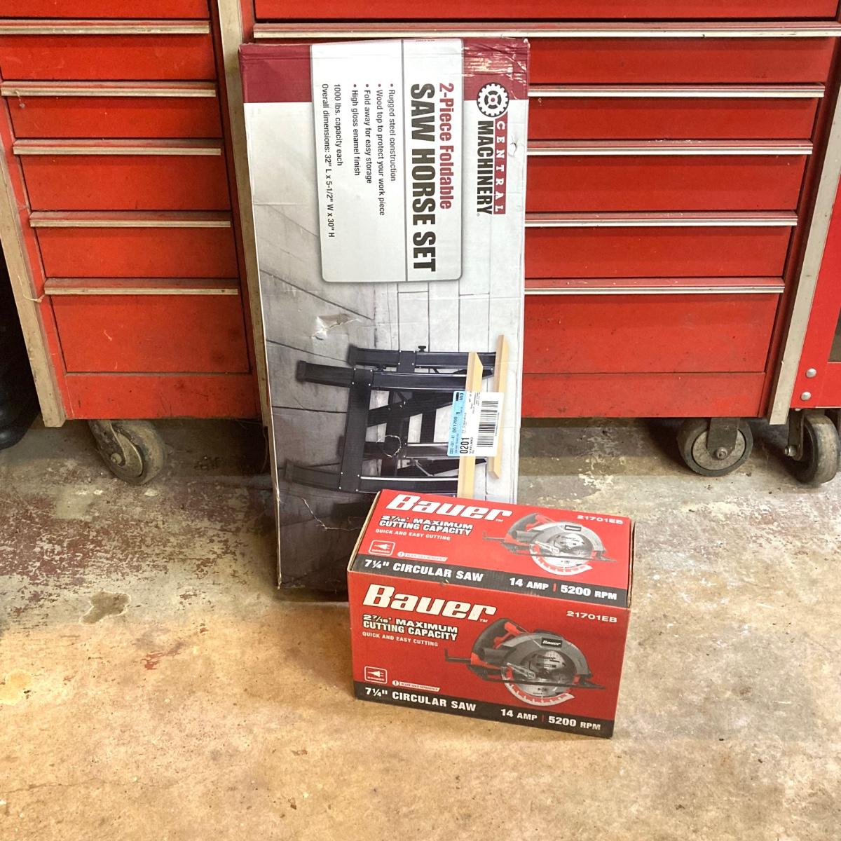 LOT 58: Bauer 7 1/4" Circular Saw 21701EB (New in Box) and Central Machinery 2-Piece Foldable Saw Horse Set in Original Box