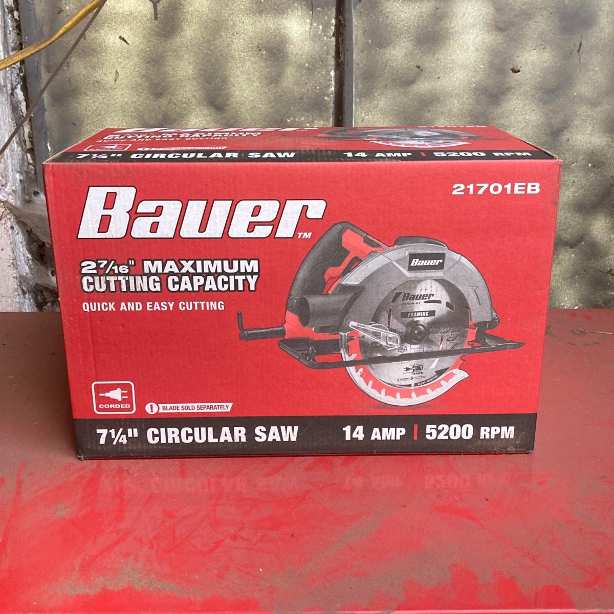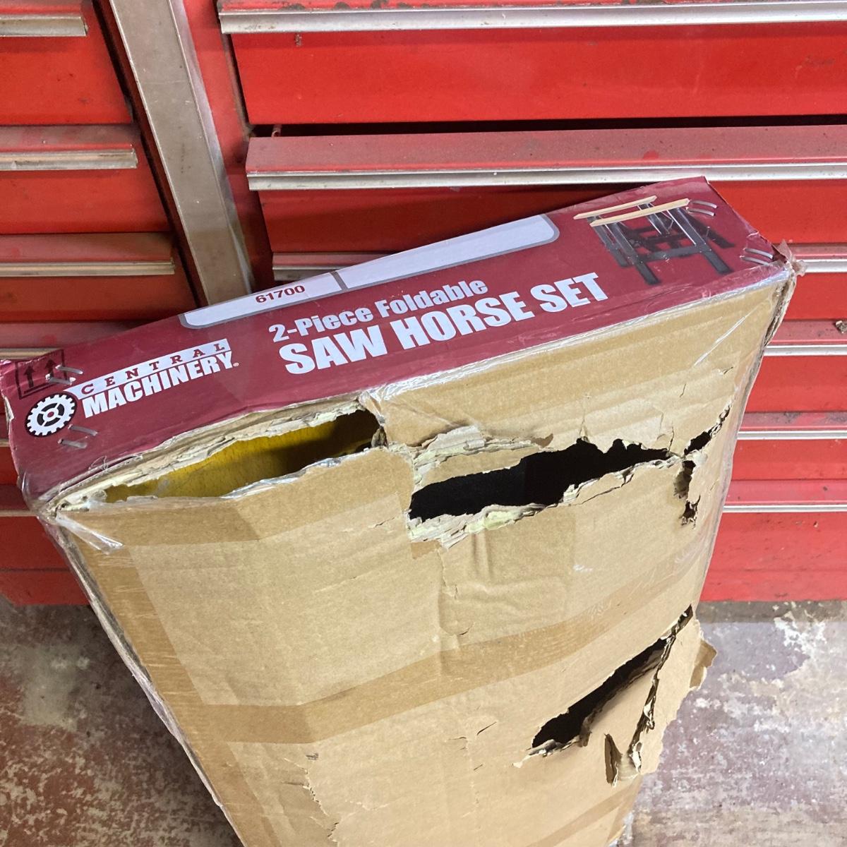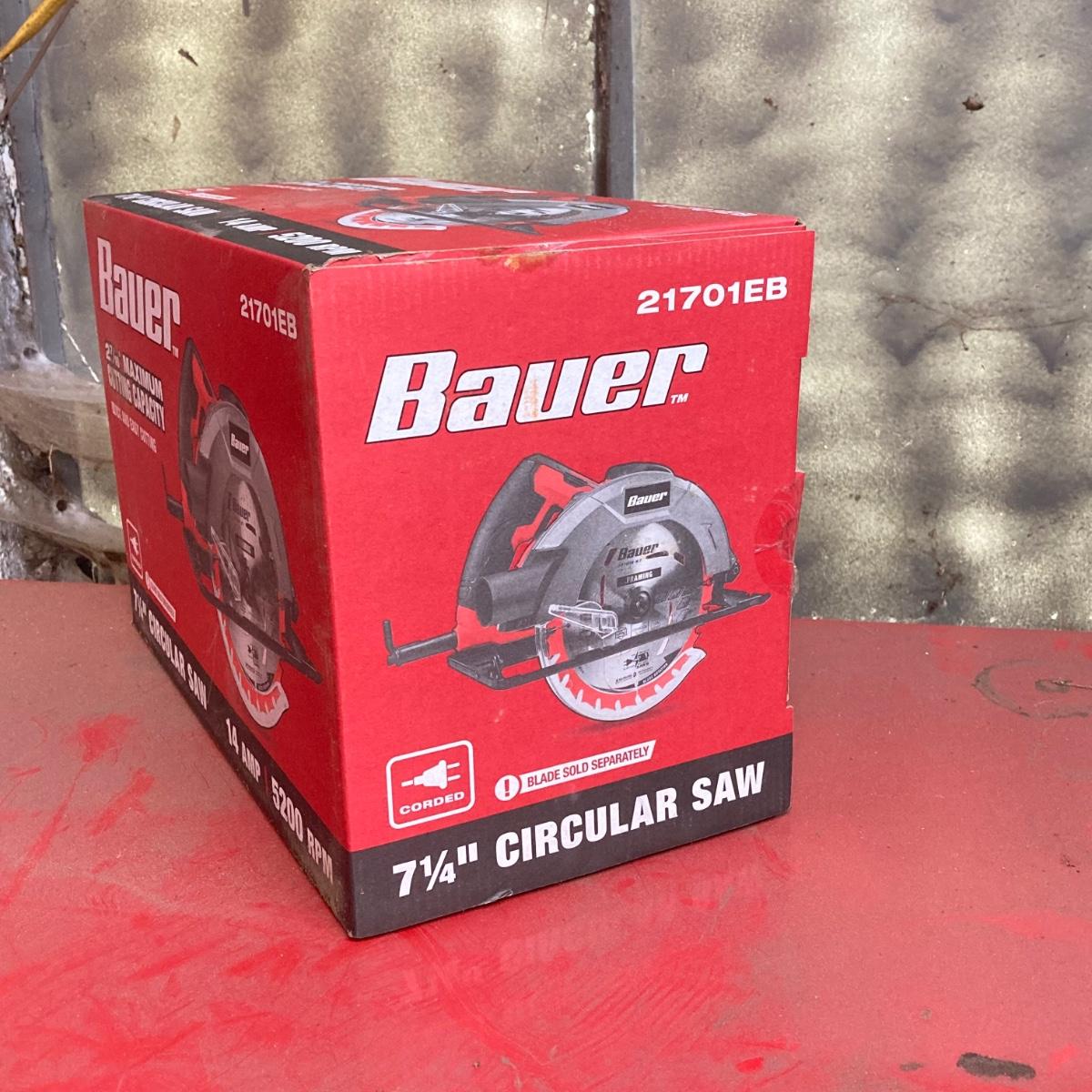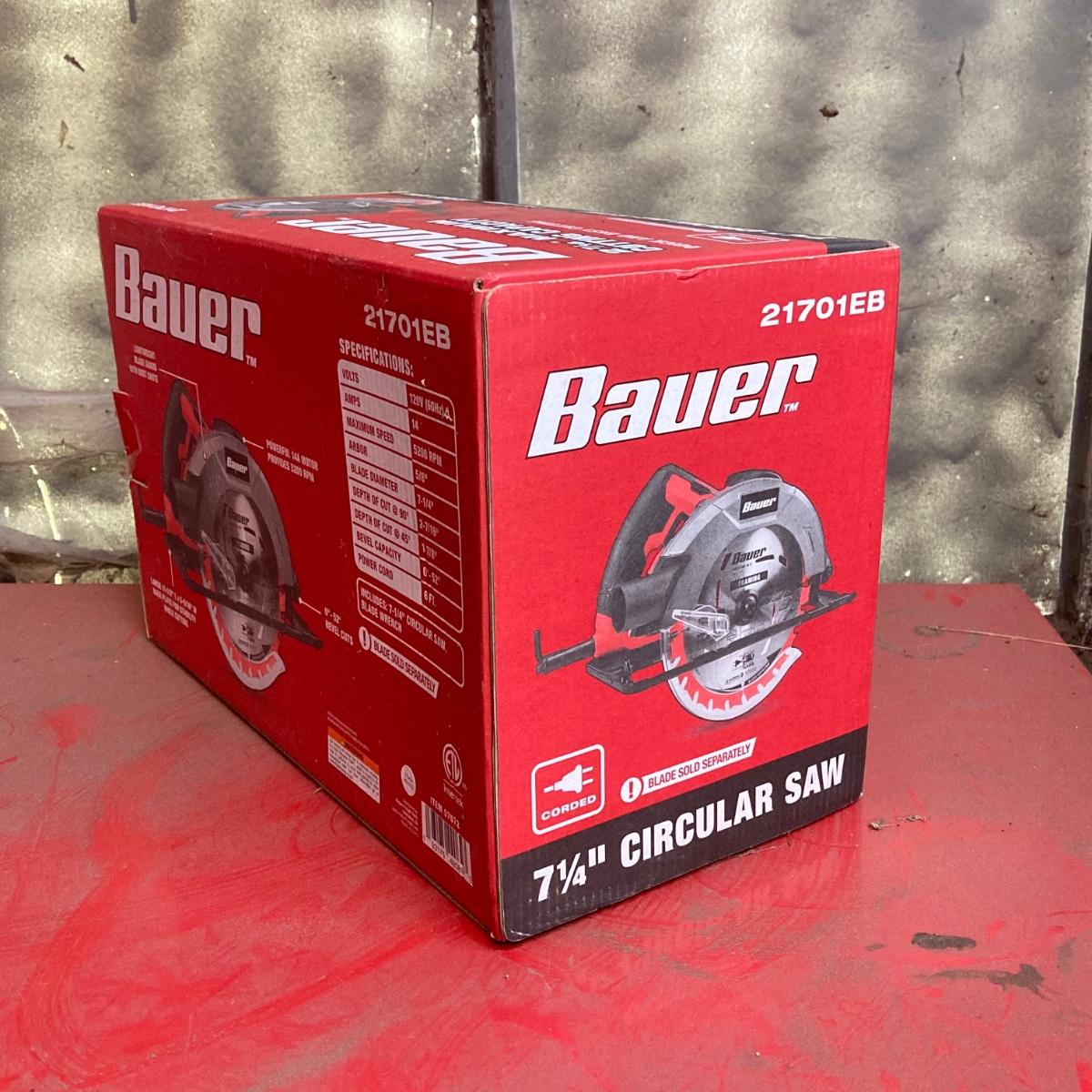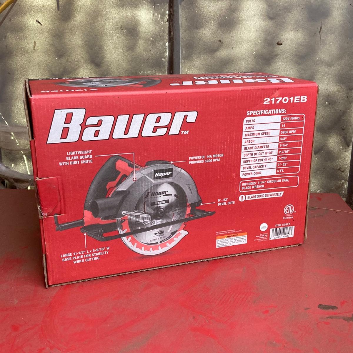 LOT 58: Bauer 7 1/4" Circular Saw 21701EB (New in Box) and Central Machinery 2-Piece Foldable Saw Horse Set in Original Box