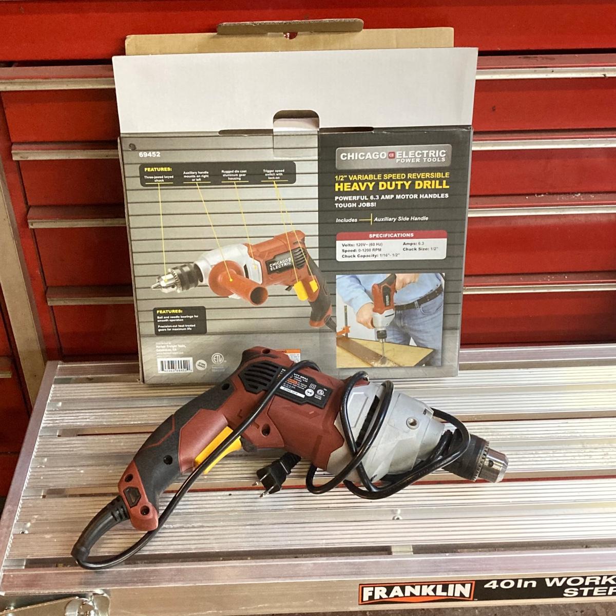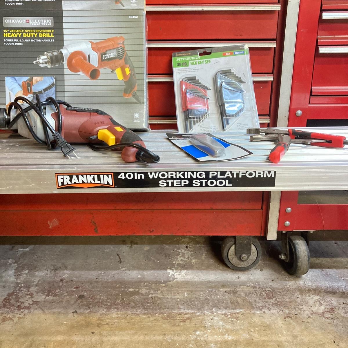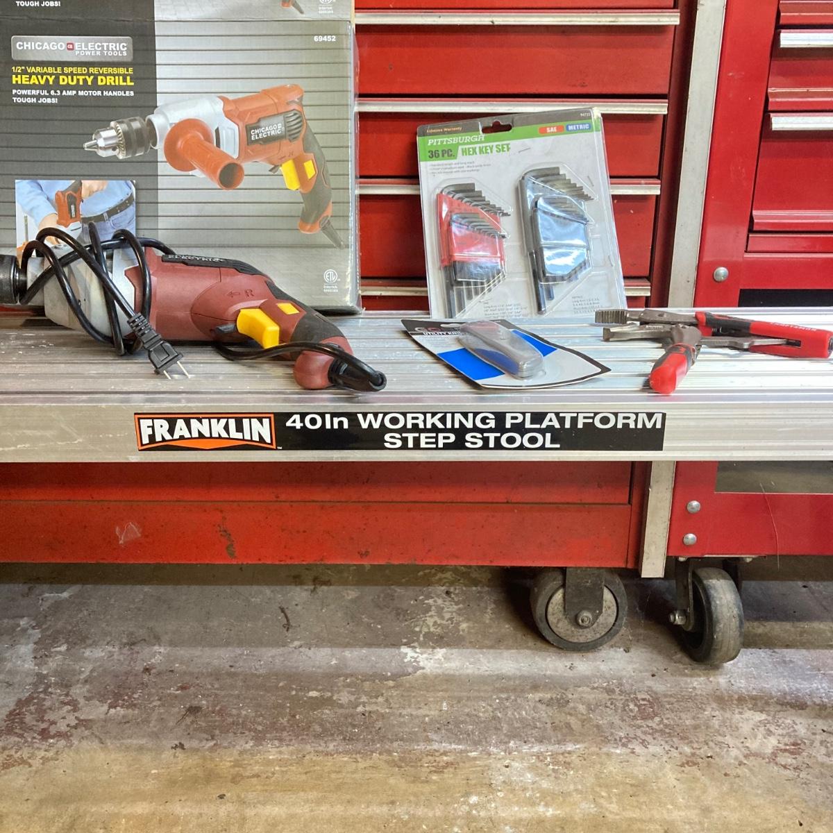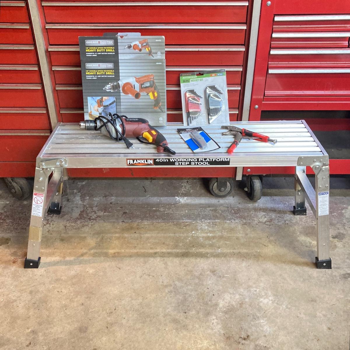LOT 62: Franklin 40-inch Working Platform / Step Stool, Chicago Electric Heavy Duty Drill Serial No. 37464-2216 and Hand Tools