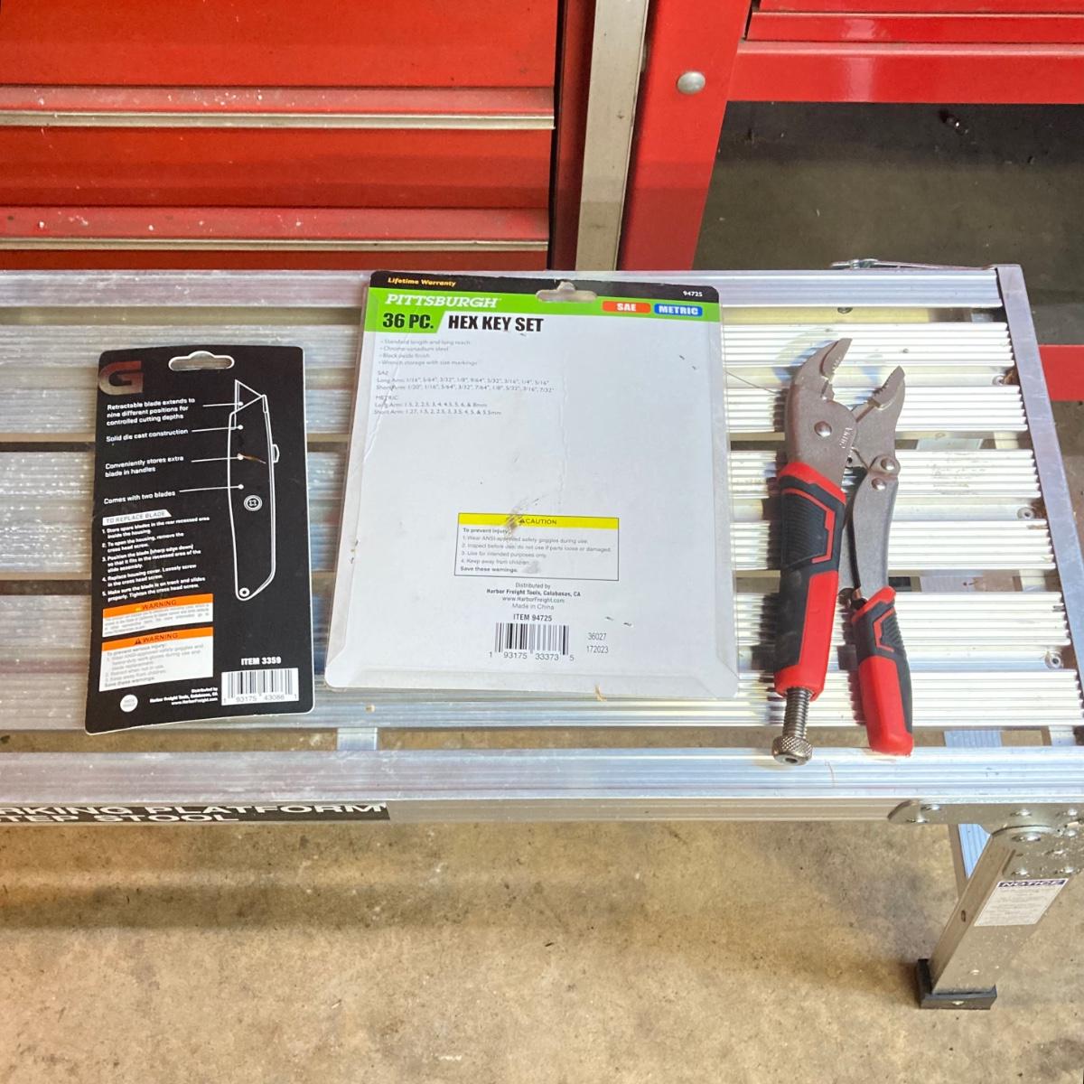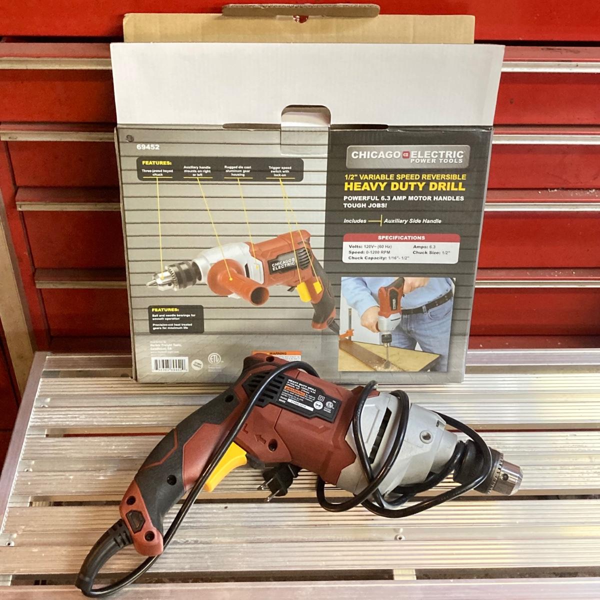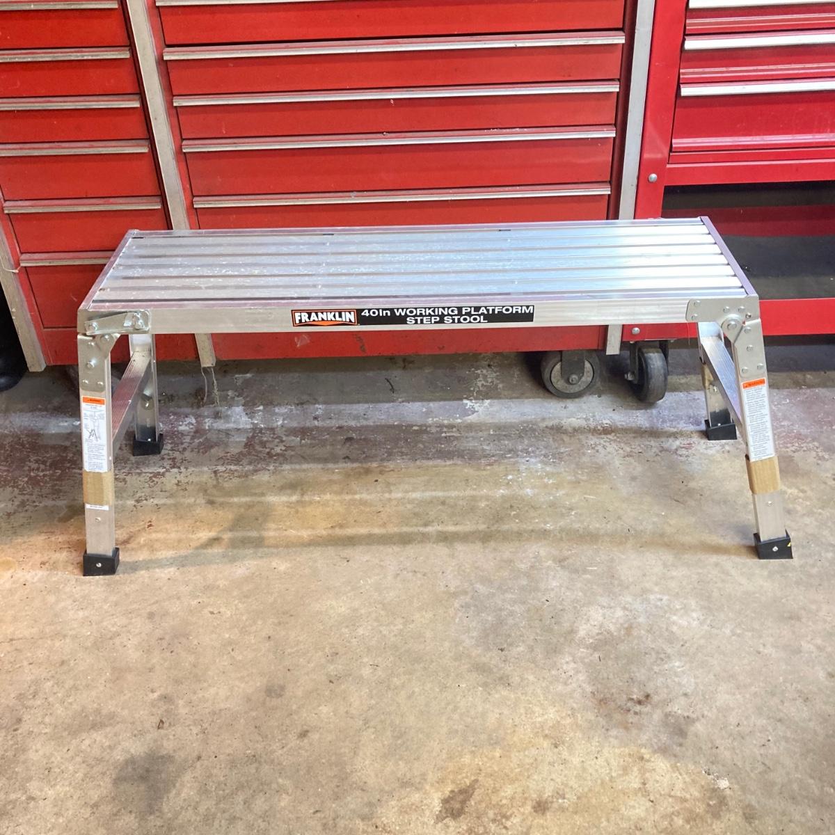 LOT 62: Franklin 40-inch Working Platform / Step Stool, Chicago Electric Heavy Duty Drill Serial No. 37464-2216 and Hand Tools