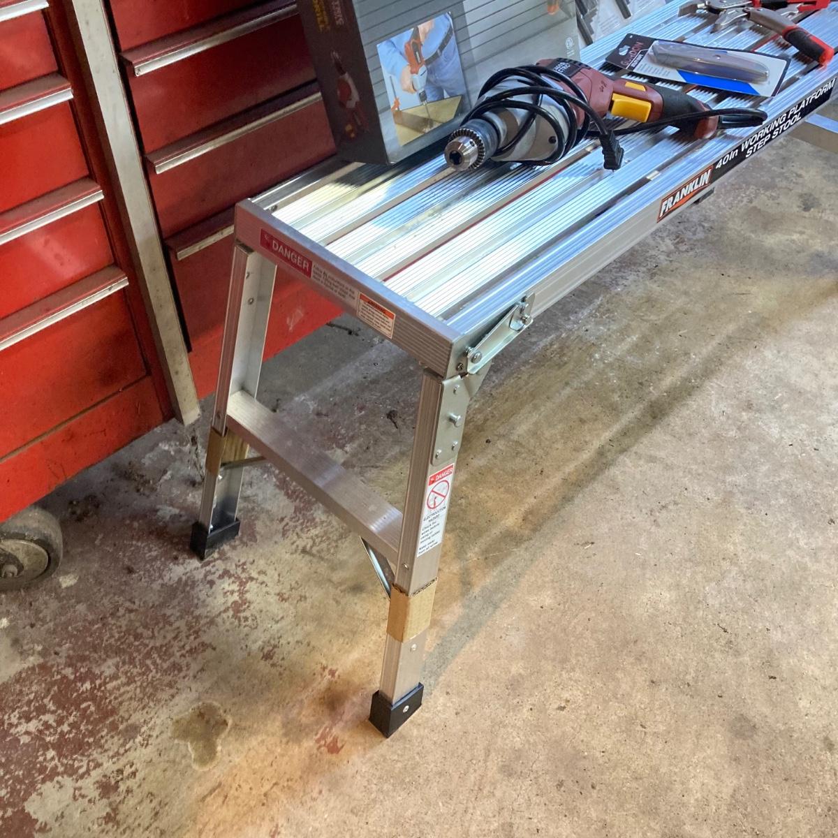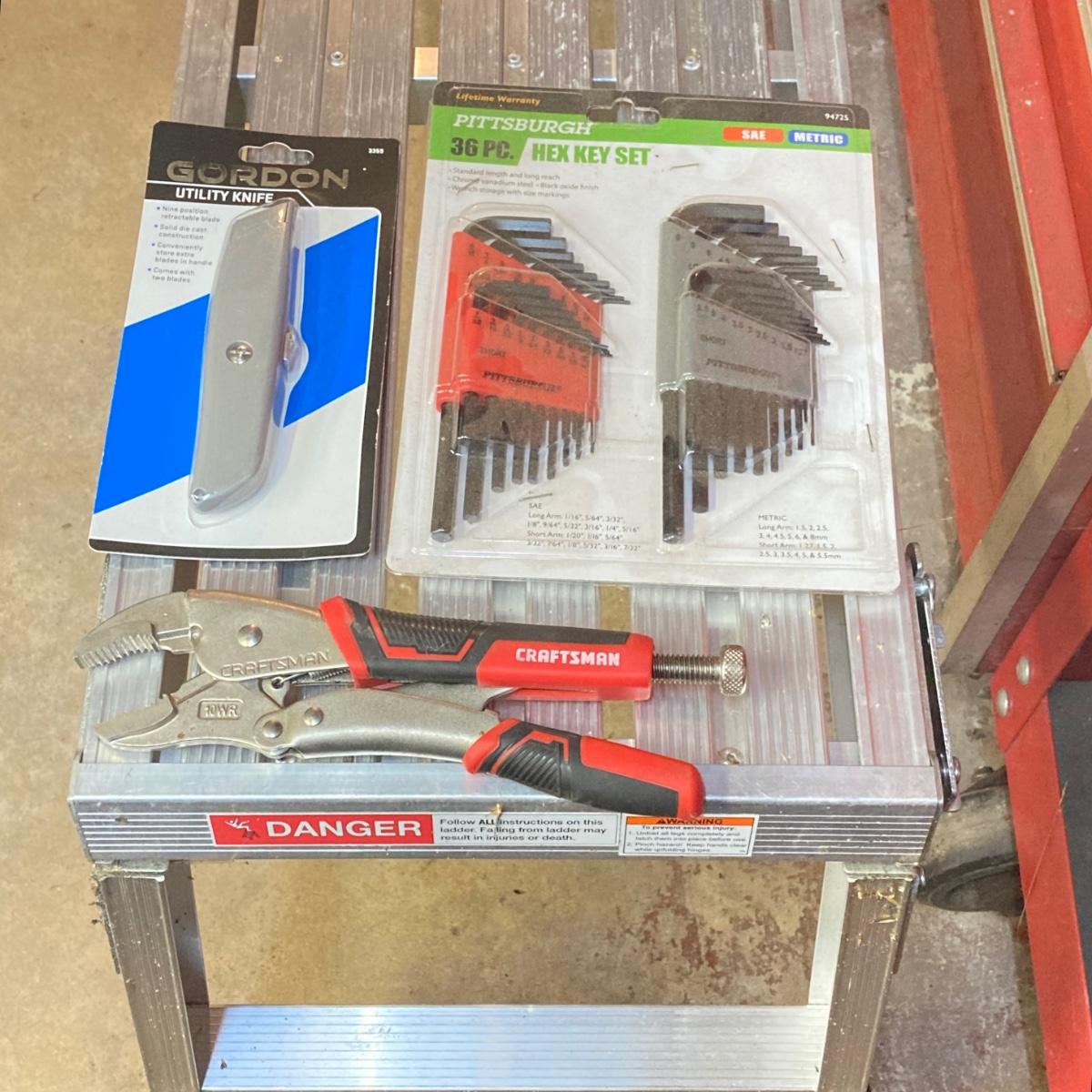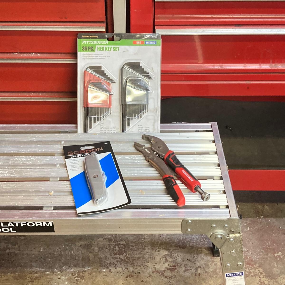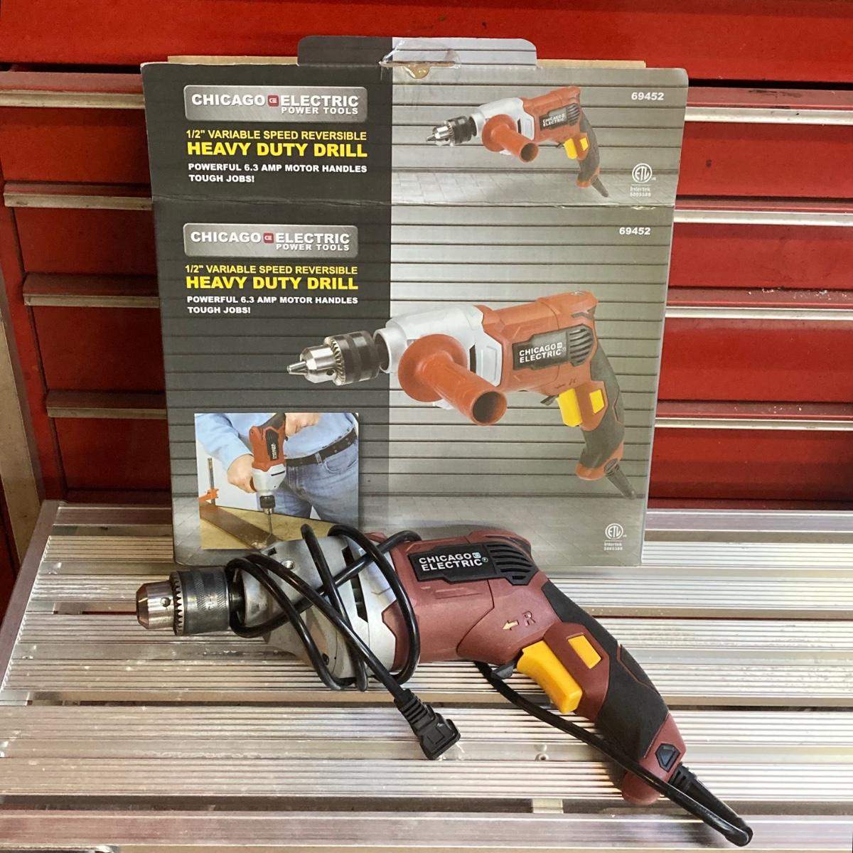 LOT 62: Franklin 40-inch Working Platform / Step Stool, Chicago Electric Heavy Duty Drill Serial No. 37464-2216 and Hand Tools