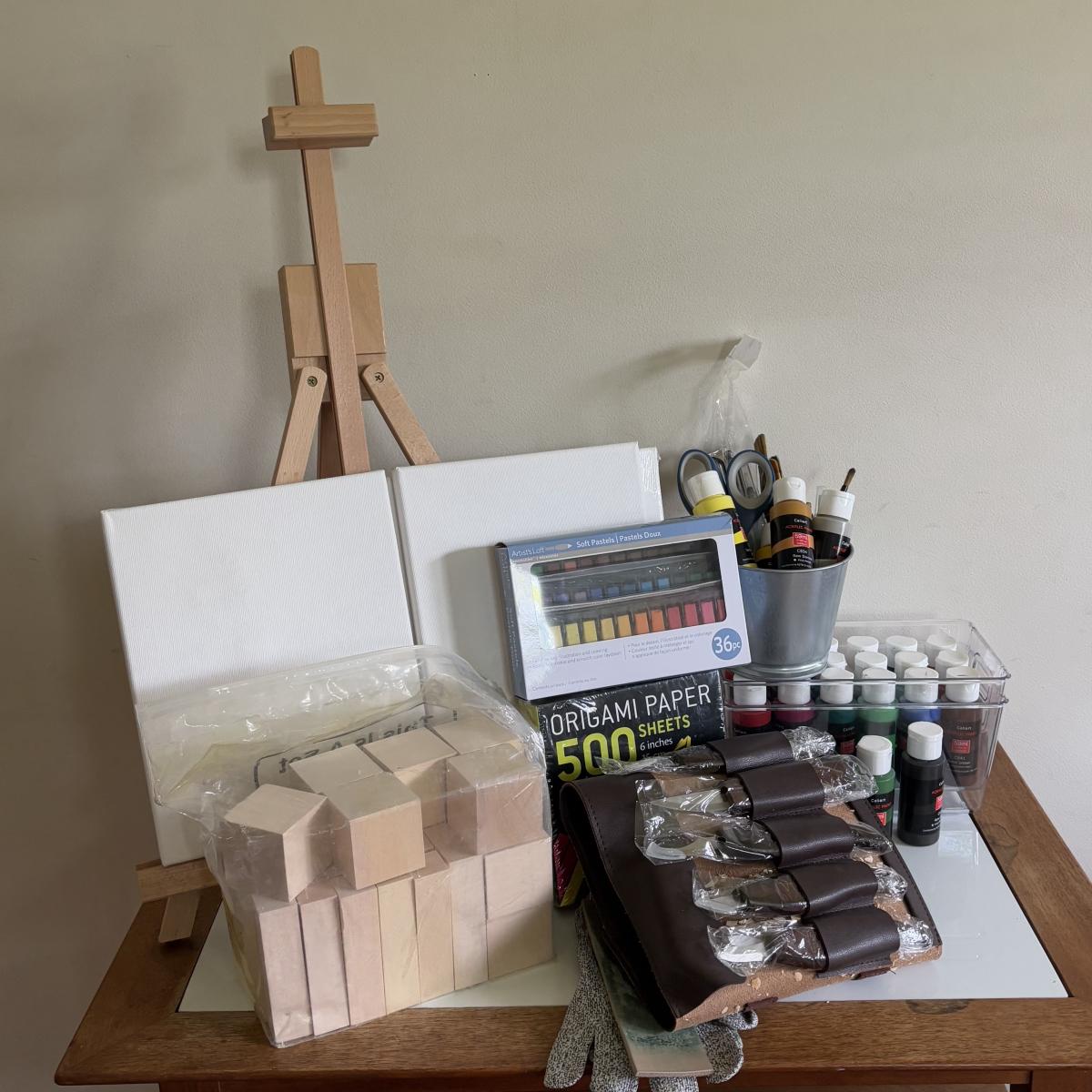 LOT 94: Craft Night: Woodcarving Set, Balsa Wood Blocks, Paints, Canvas, Easel and More