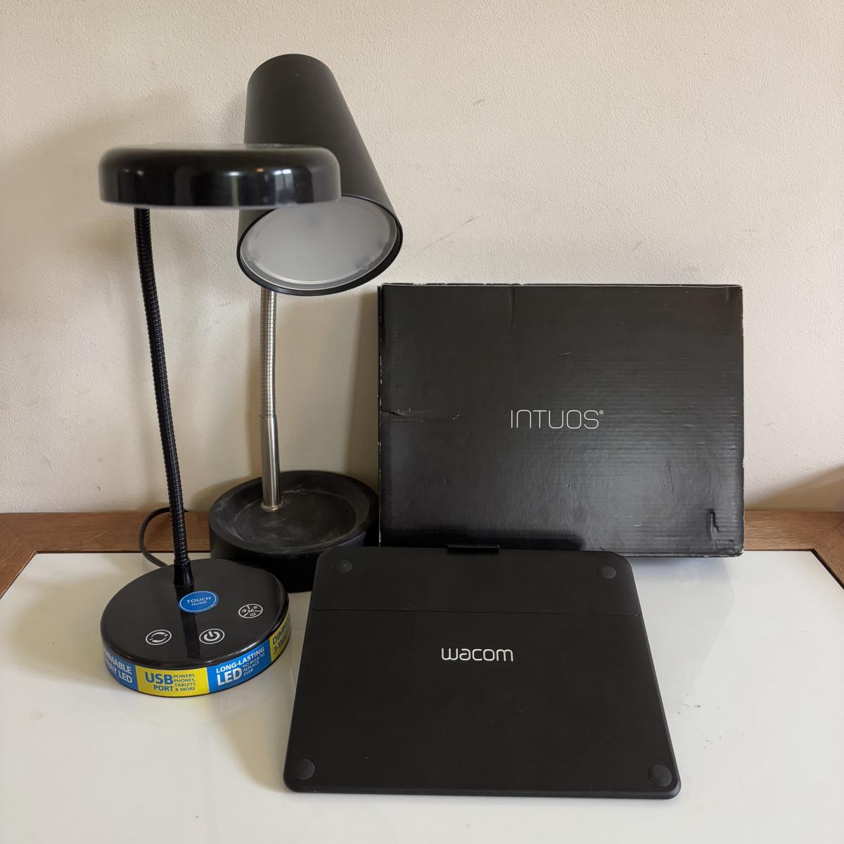 LOT 108: Wacom Intuos Drawing Tablet (missing pen) & Desk Lamps