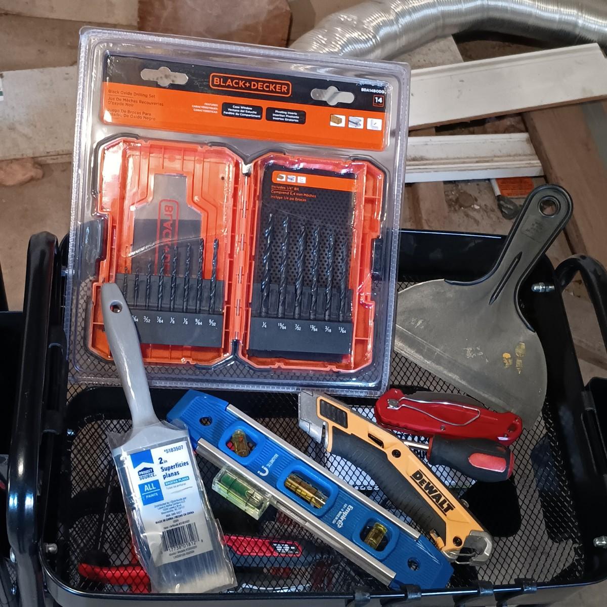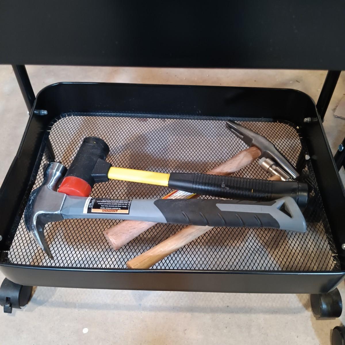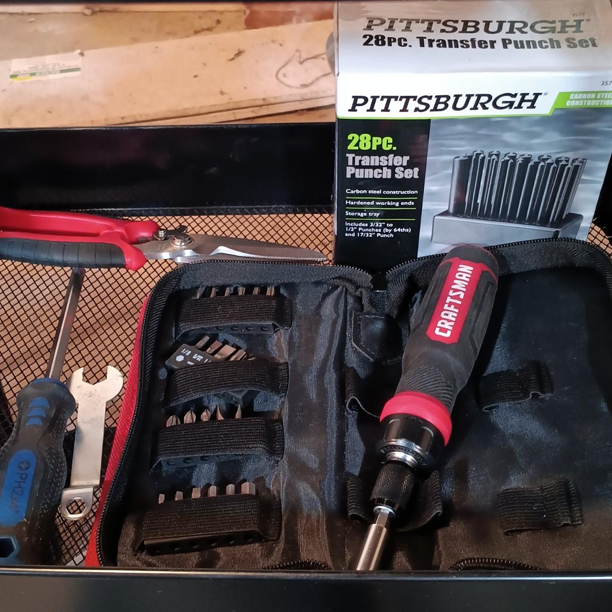 LOT 125: Pair of Metal Trolleys with Bauer Rotary Tool, Punch Sets, Black&Decker 3/8" Corded Drill & More