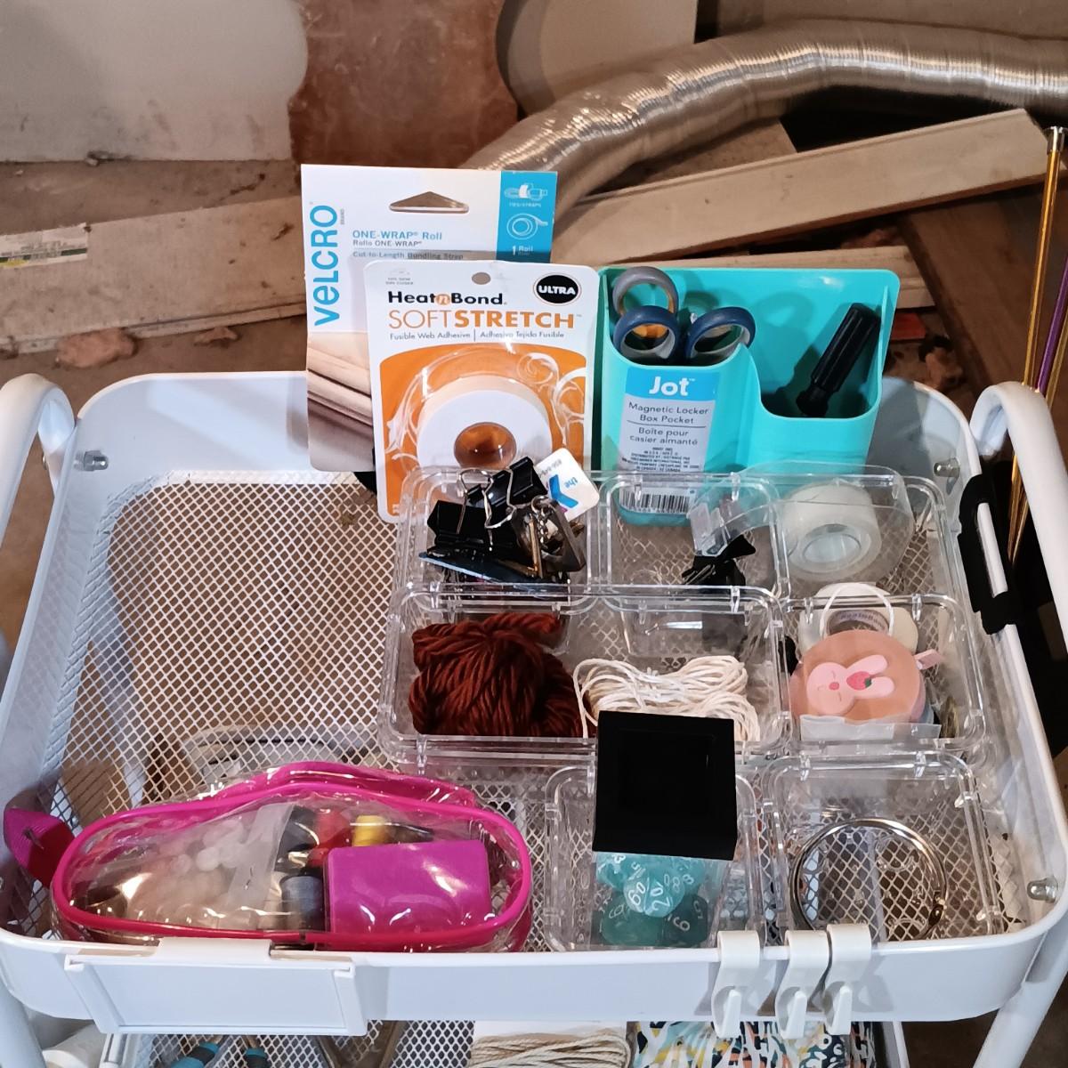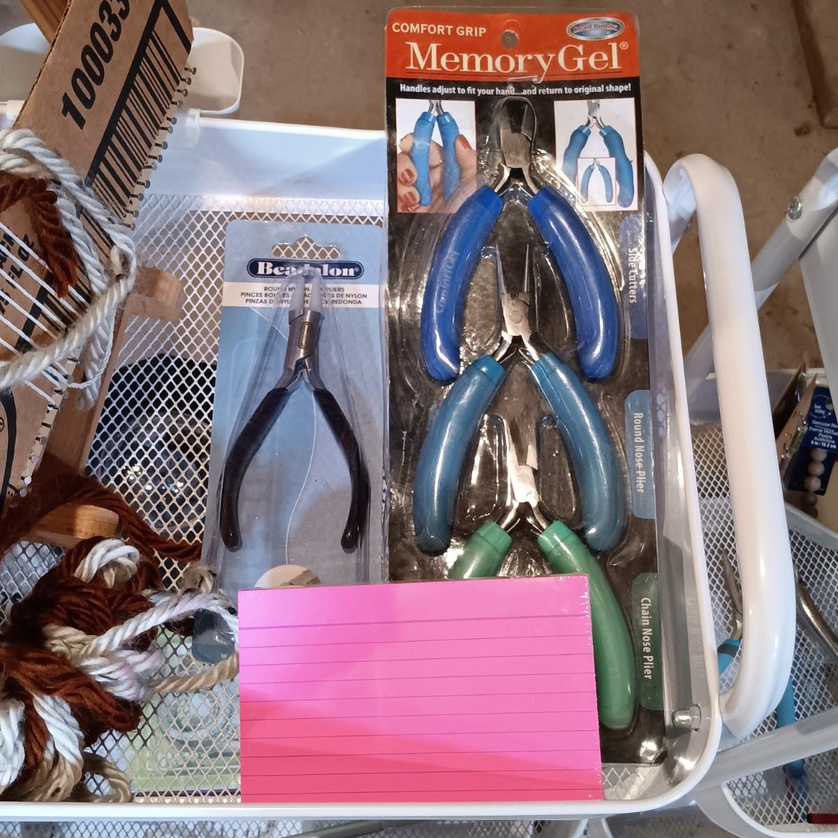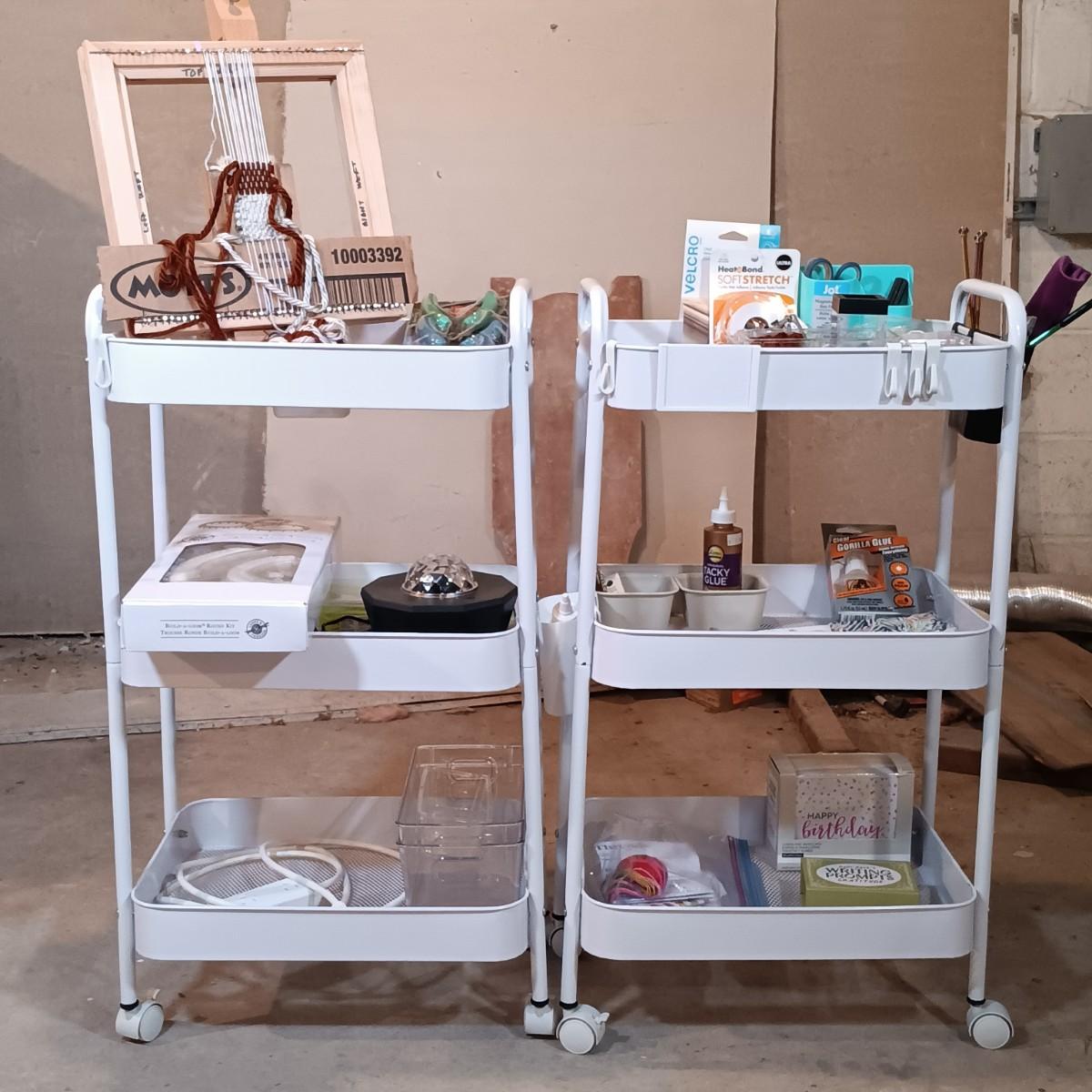 LOT 126: Pair of Metal Trolleys with NIP Pliers, Looms, 80Proof Goods Leather Working Scraps & More