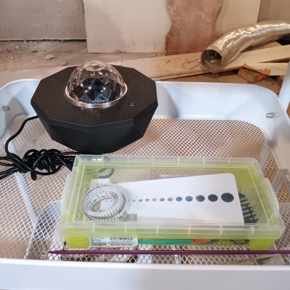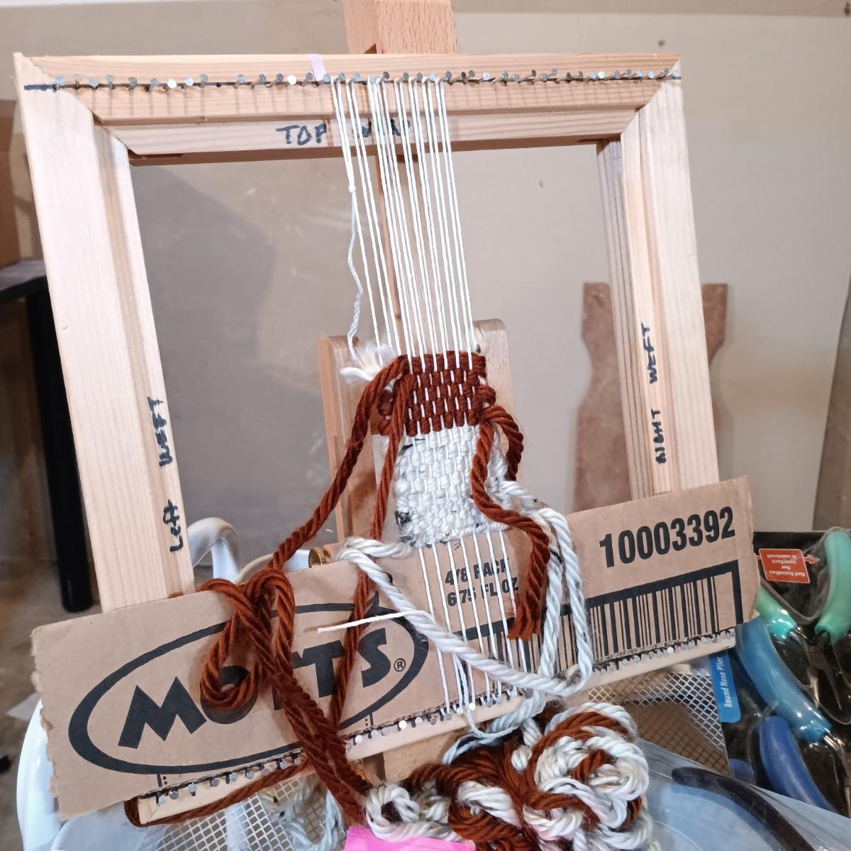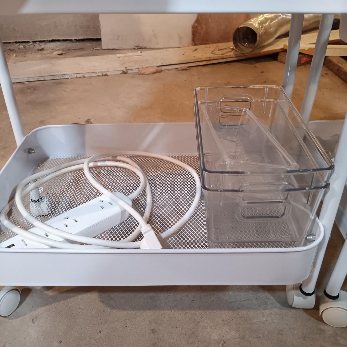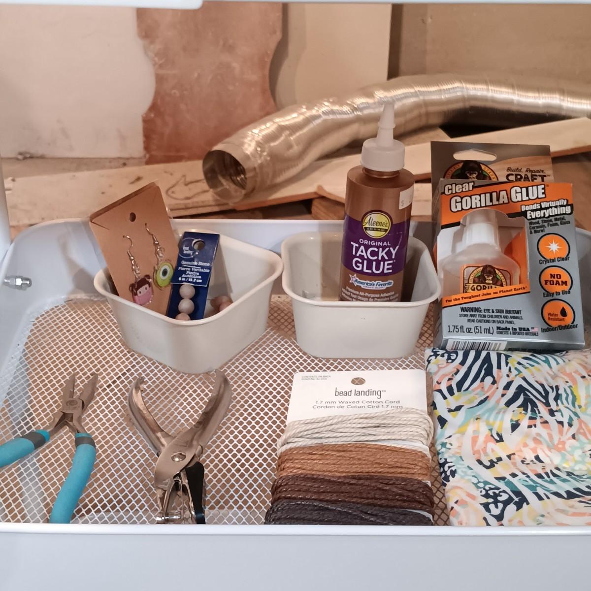 LOT 126: Pair of Metal Trolleys with NIP Pliers, Looms, 80Proof Goods Leather Working Scraps & More