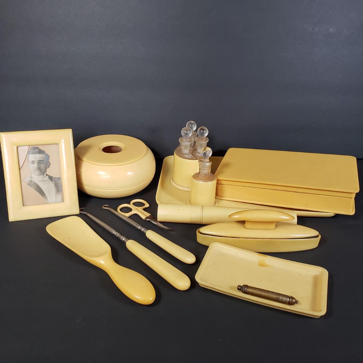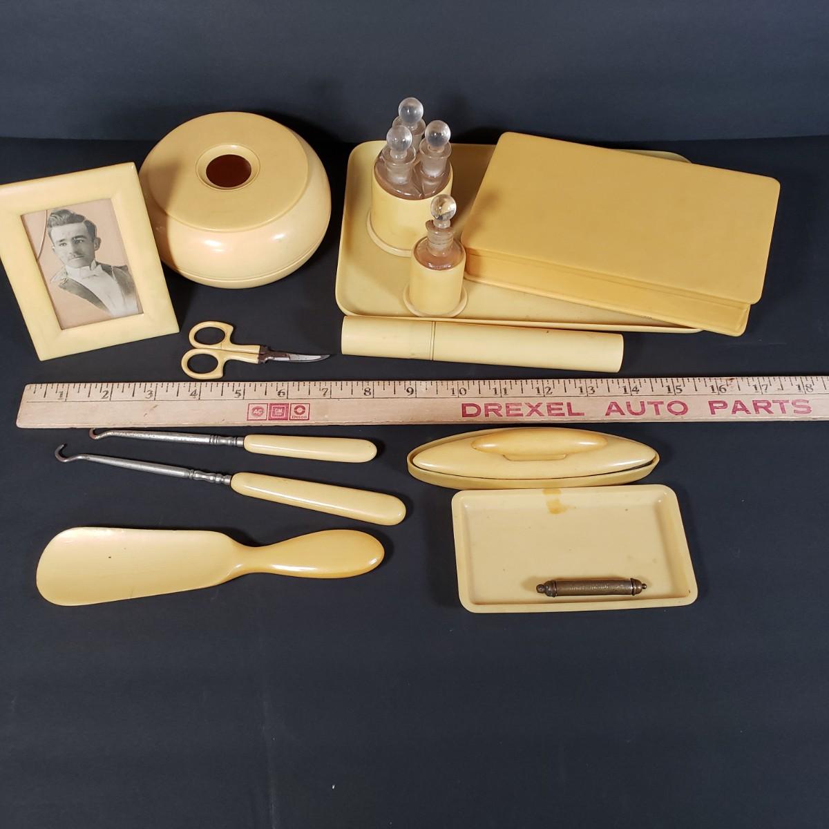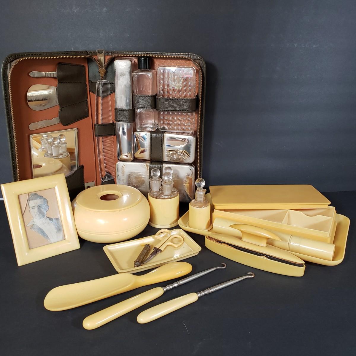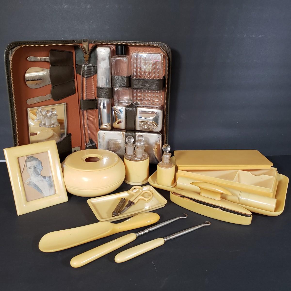 LOT 51L: Vintage Celluloid Ladies Vanity Set & Men's Travel Toiletry Set with Identity Indicator
