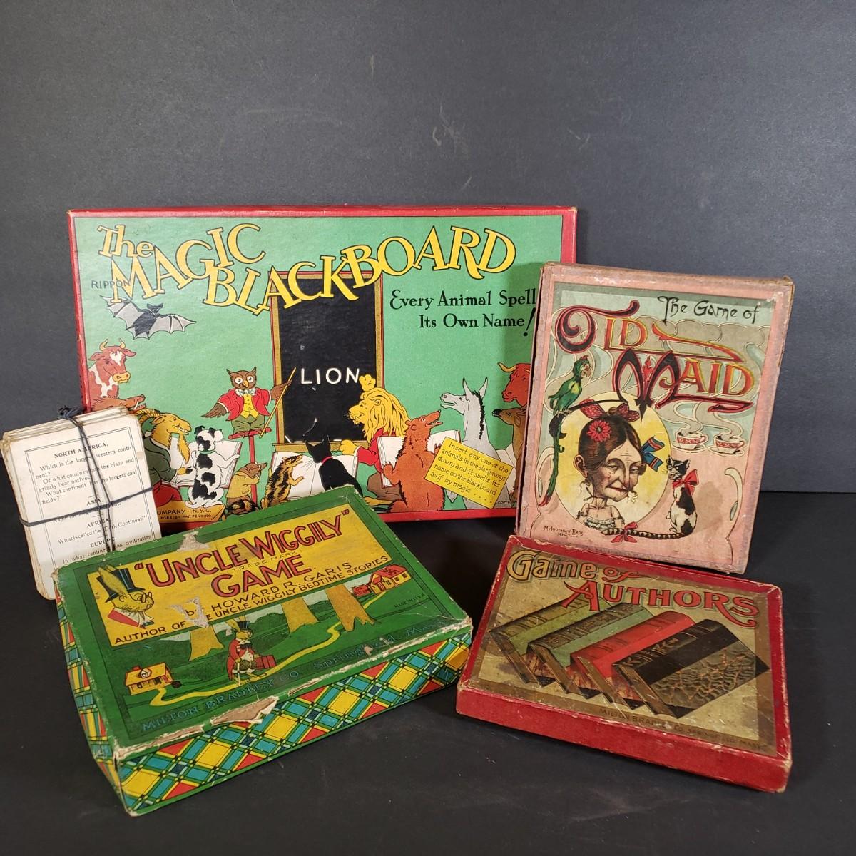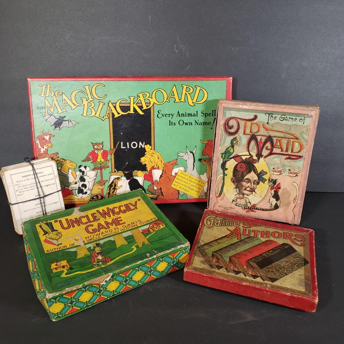 LOT 89L: Uncle Wiggly Game, Old Maid, Magic Blackboard, Game of Authors Milton Bradley