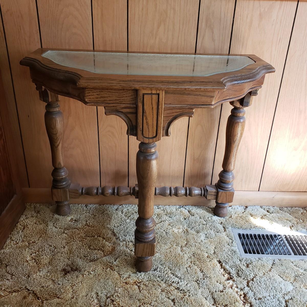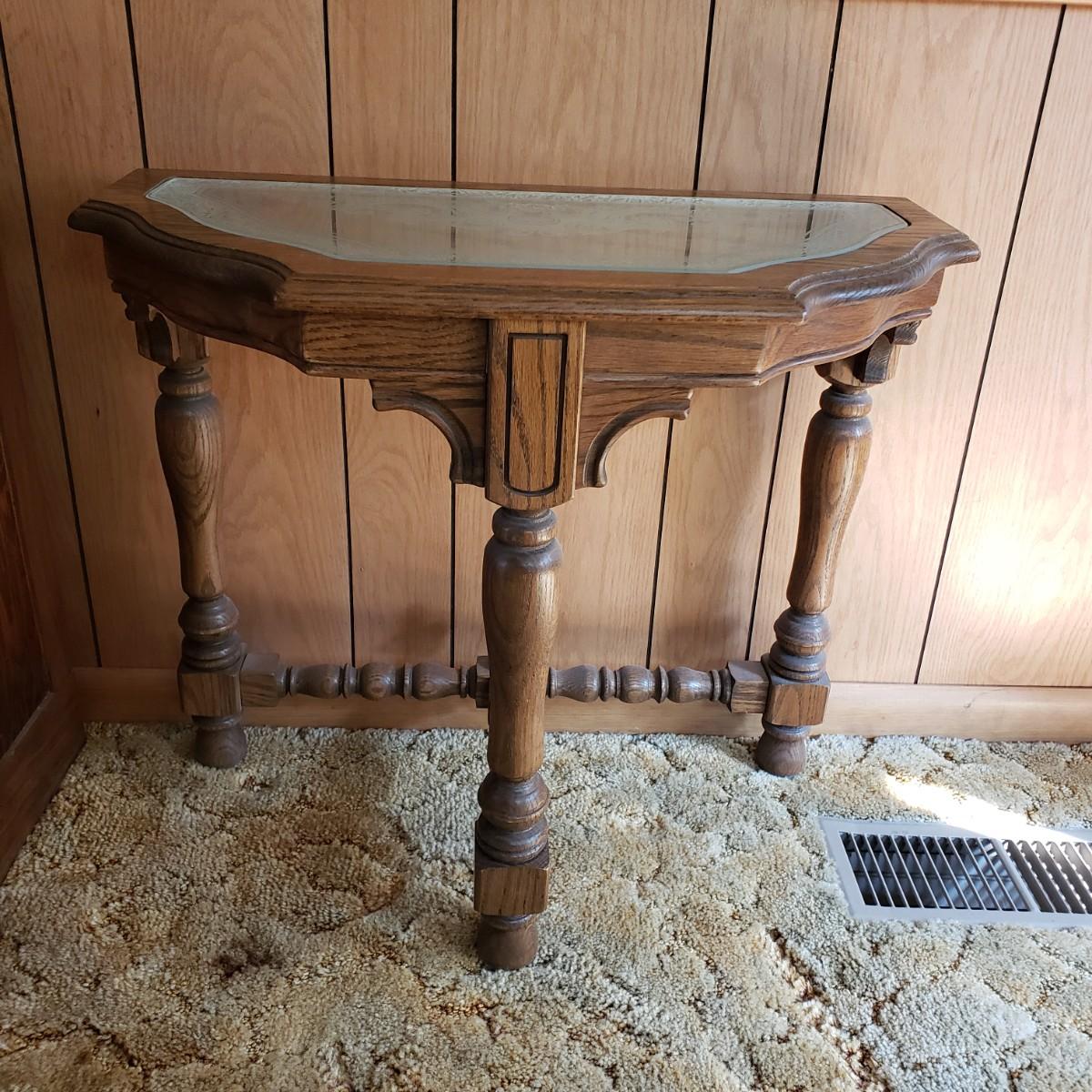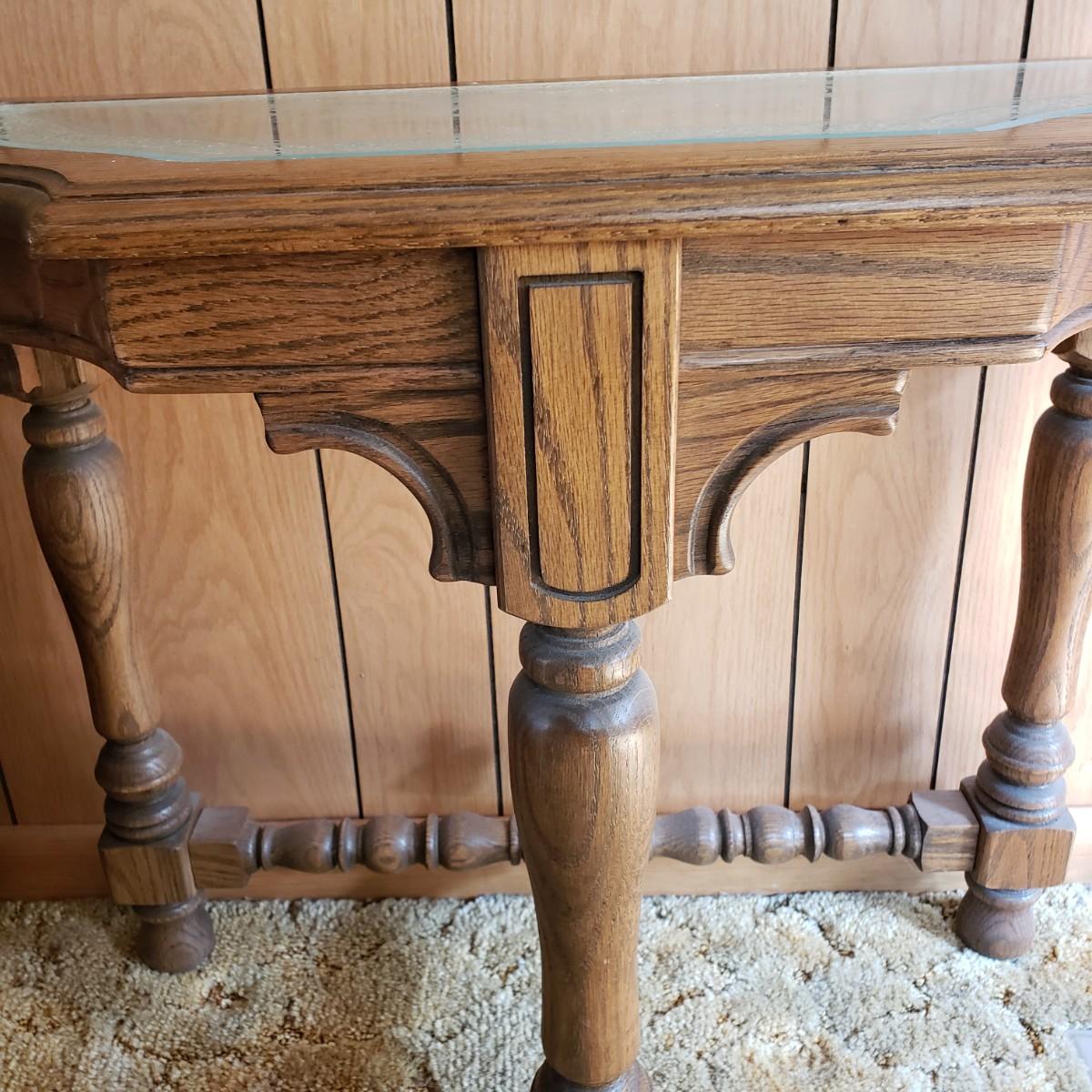 LOT 91P: Etched Glass Top Wooden Turned Leg Console Table