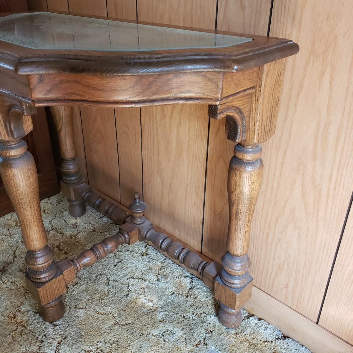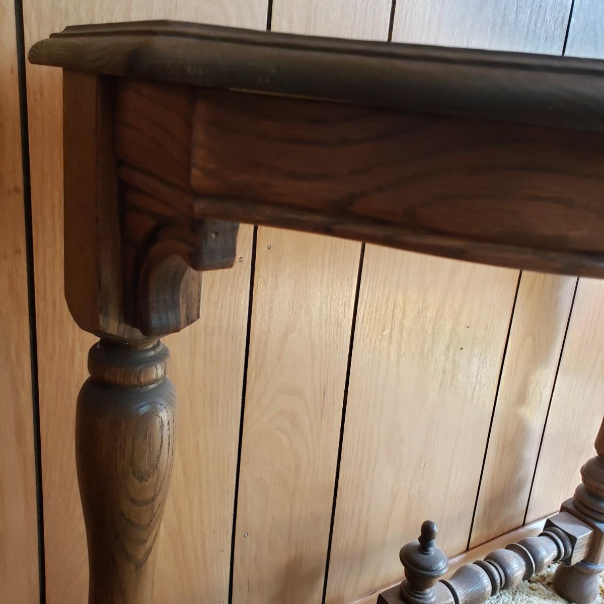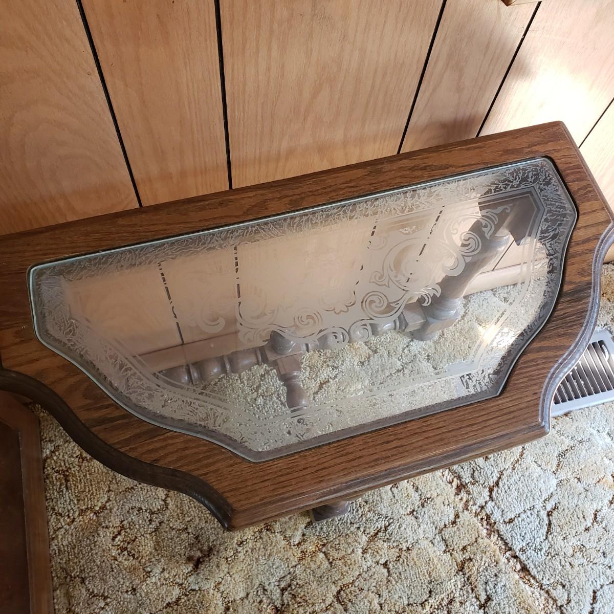 LOT 91P: Etched Glass Top Wooden Turned Leg Console Table