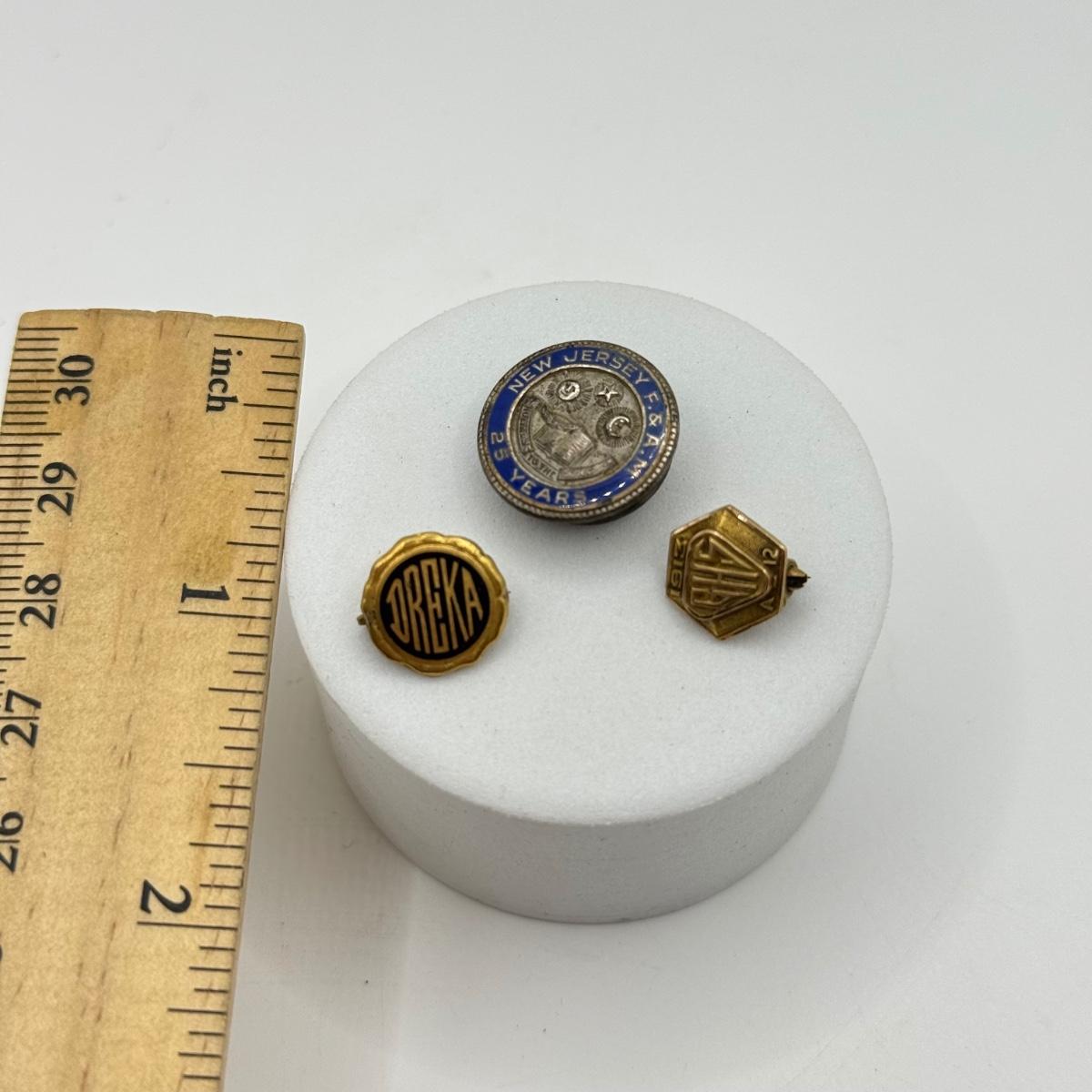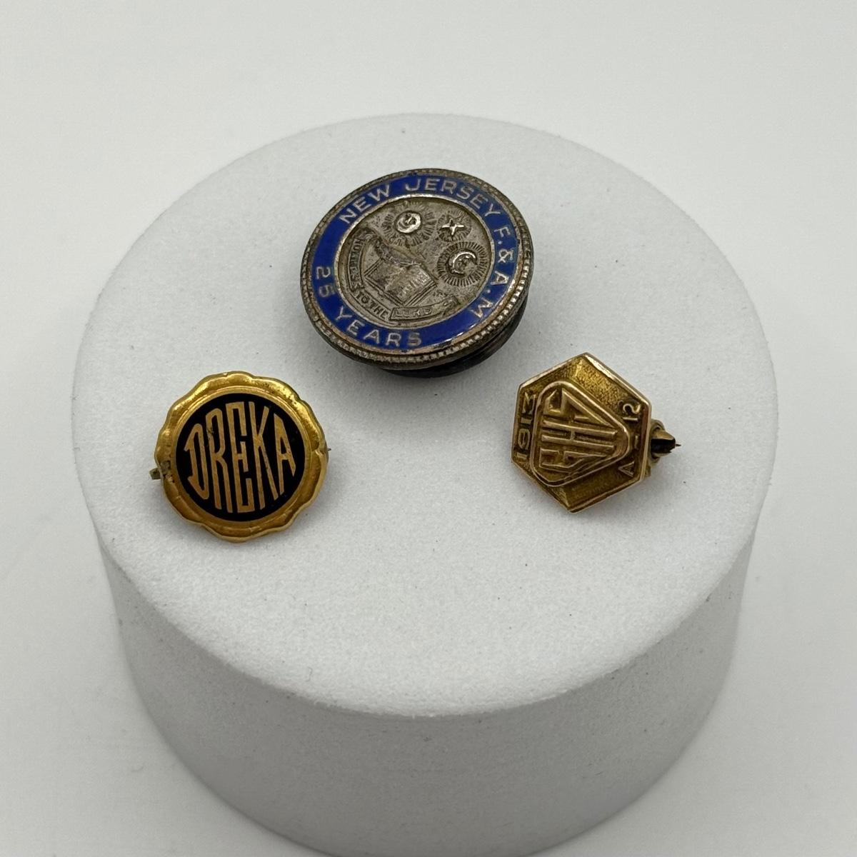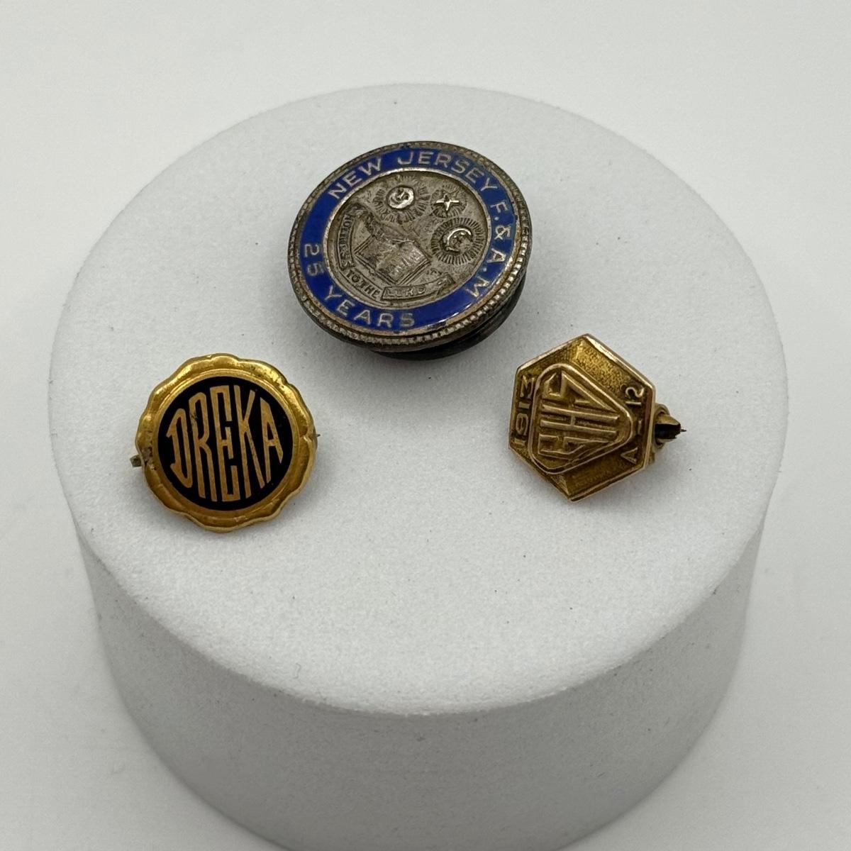 LOT 101J: Vintage Pins: Sterling Silver New Jersey F&AM 25 Years (3.62g) & 14k Gold Dreka & GHS 1913 (3.21gtw)