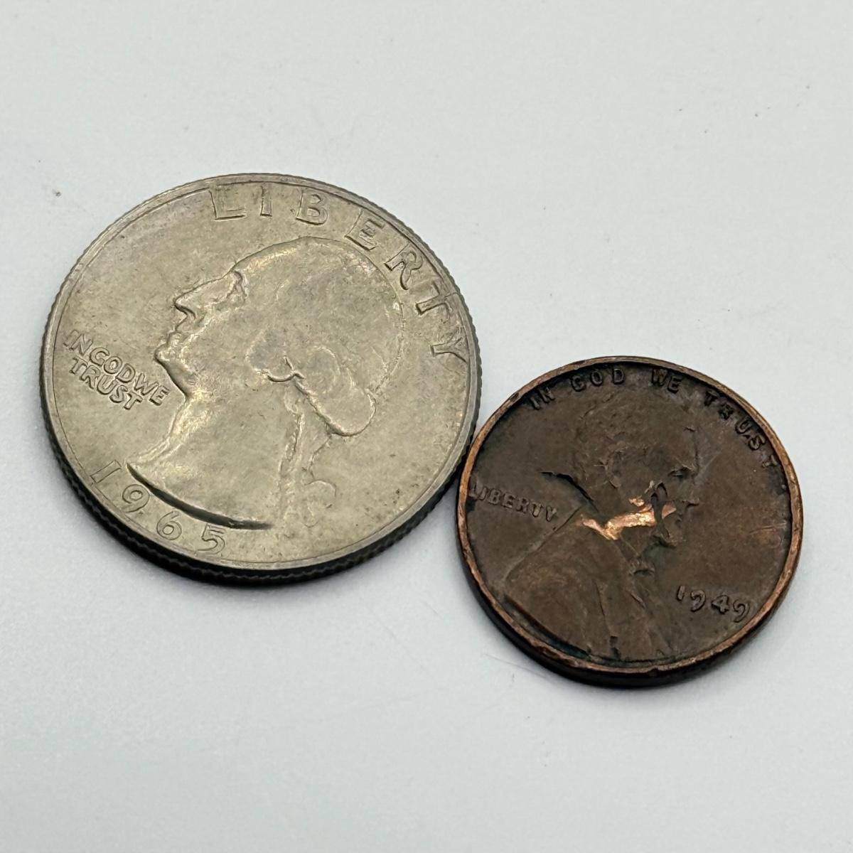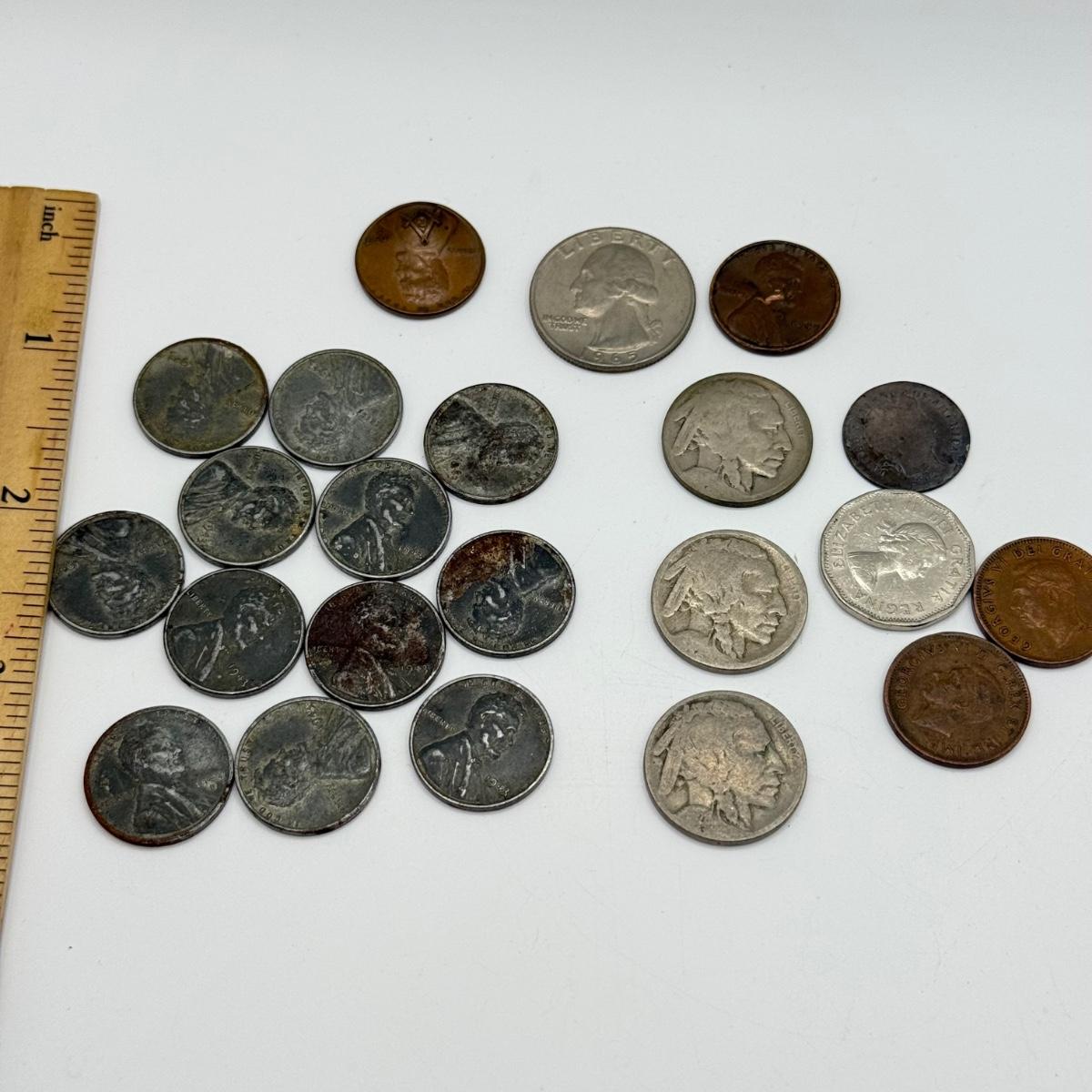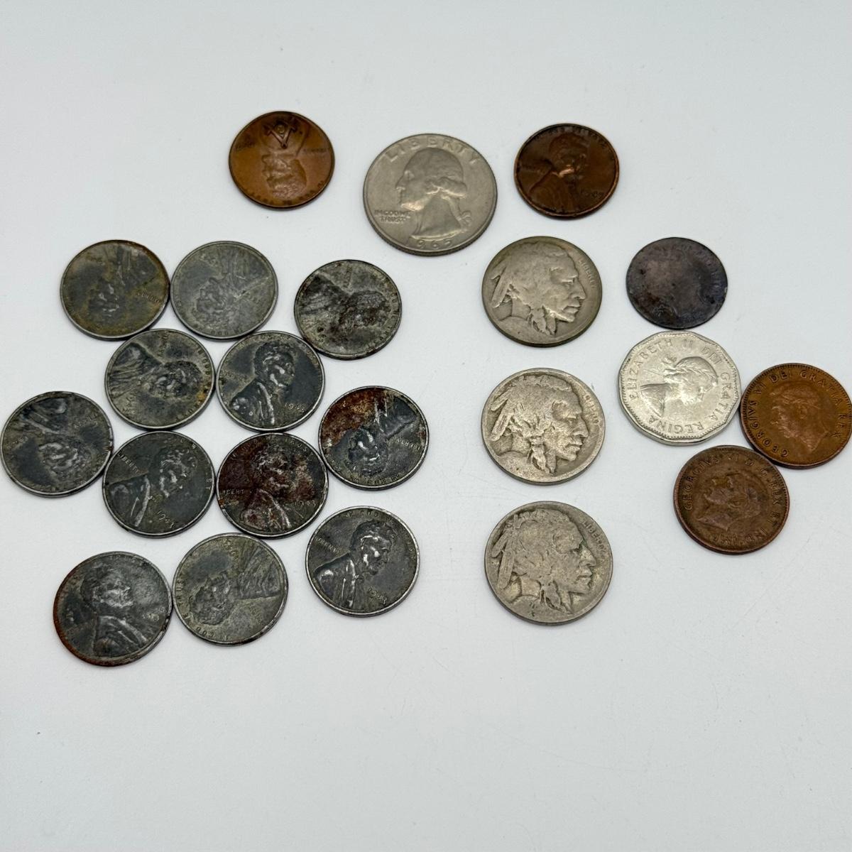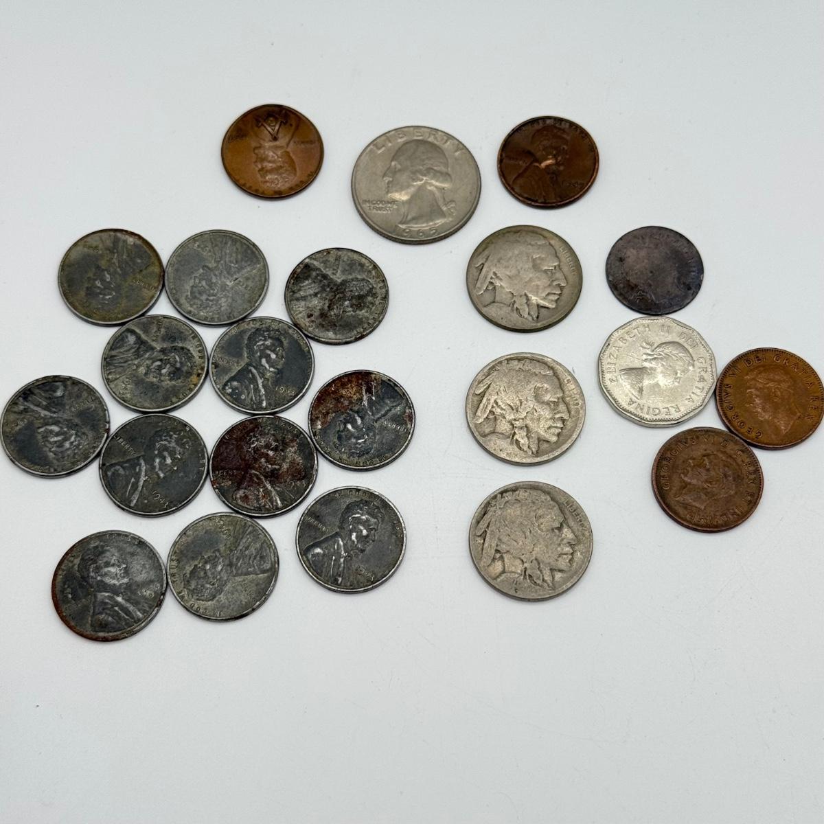 LOT 109J: US Coin Collection: 13 Steel Pennies (1943), 1949 Penny and 1965 Quarter w/ No Mint Marks, Buffalo Nickels (3), Mason Penny & More