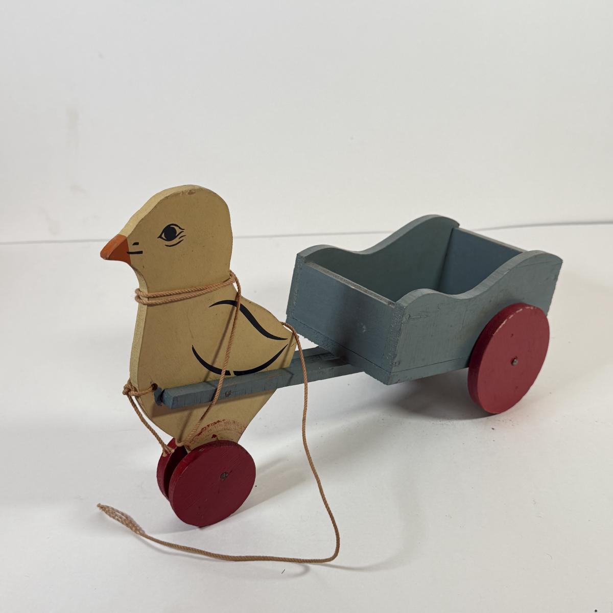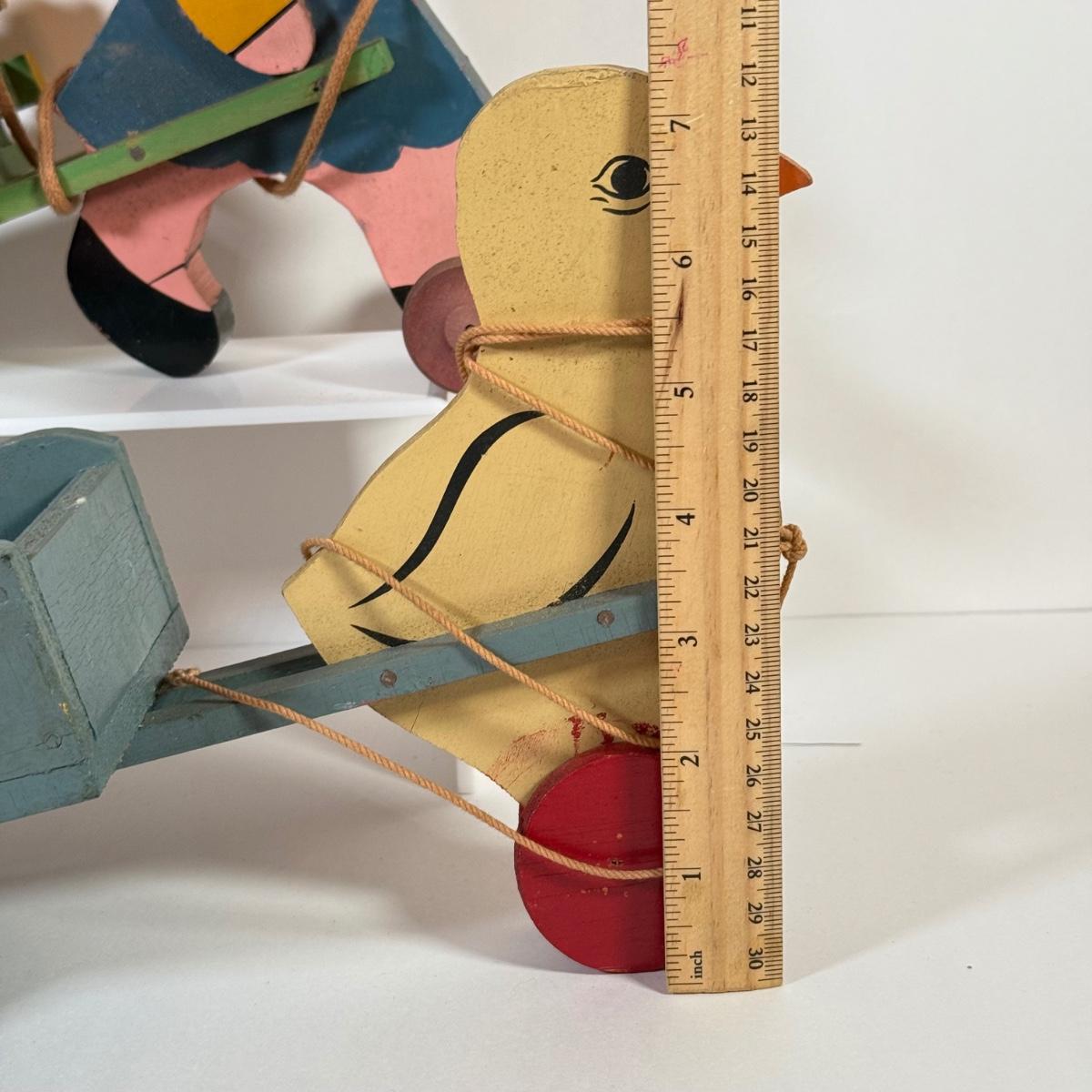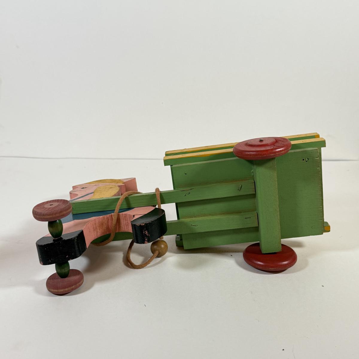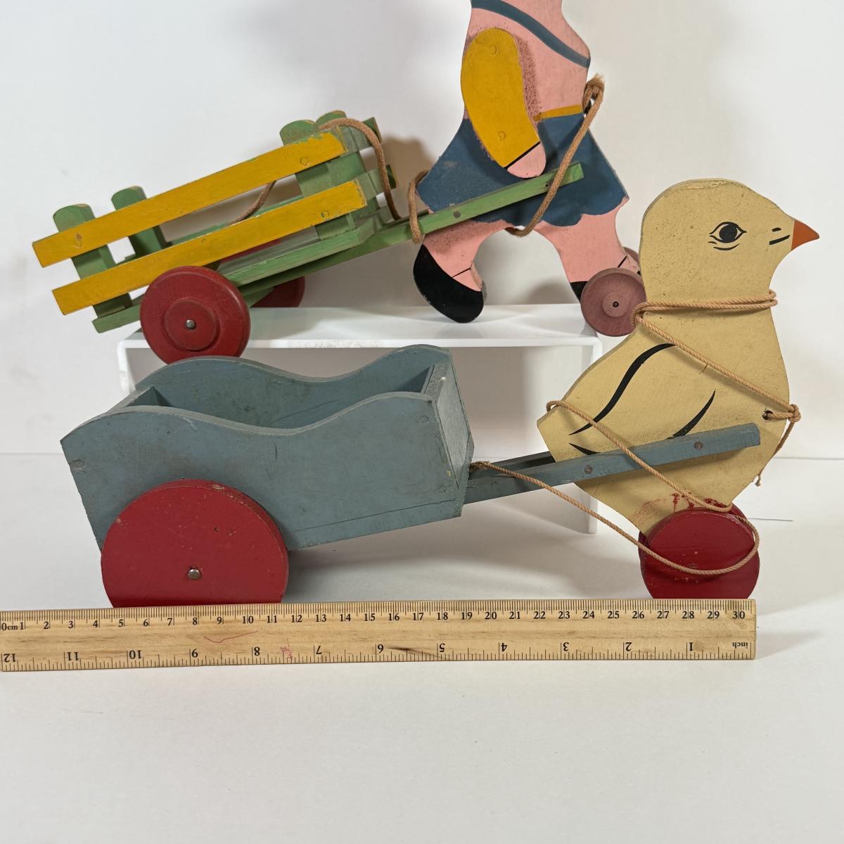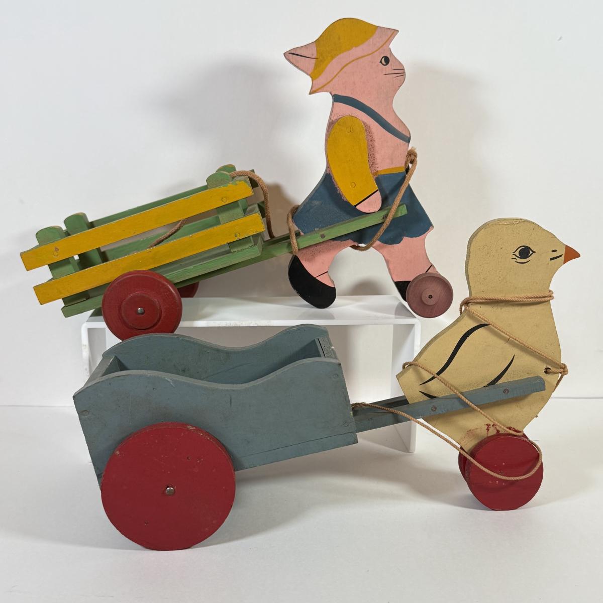 LOT 123L: Vintage Wooden Pull Toys w/ Wagons - one stamped "Toddler Toys"
