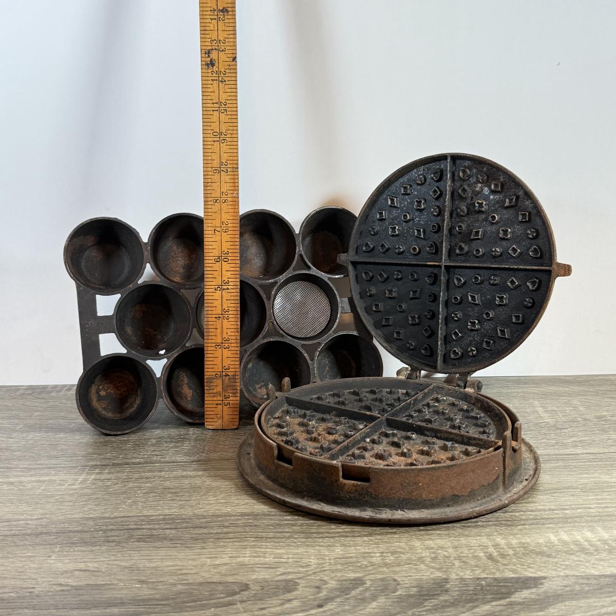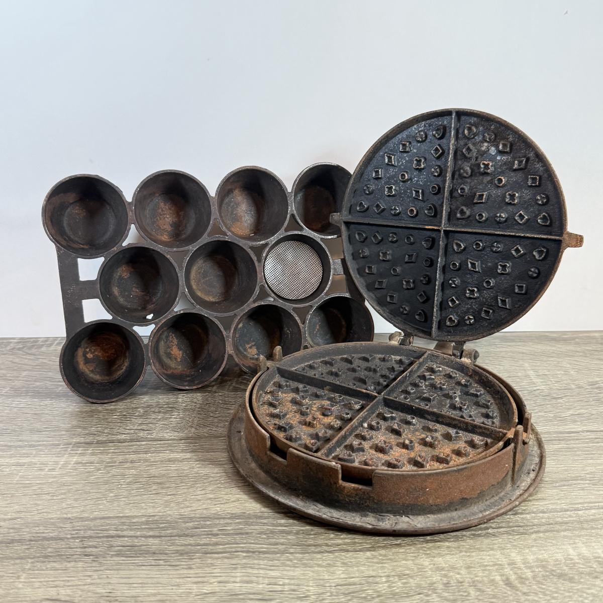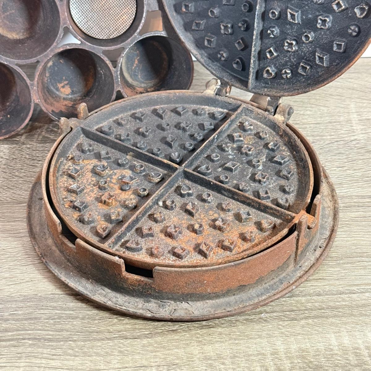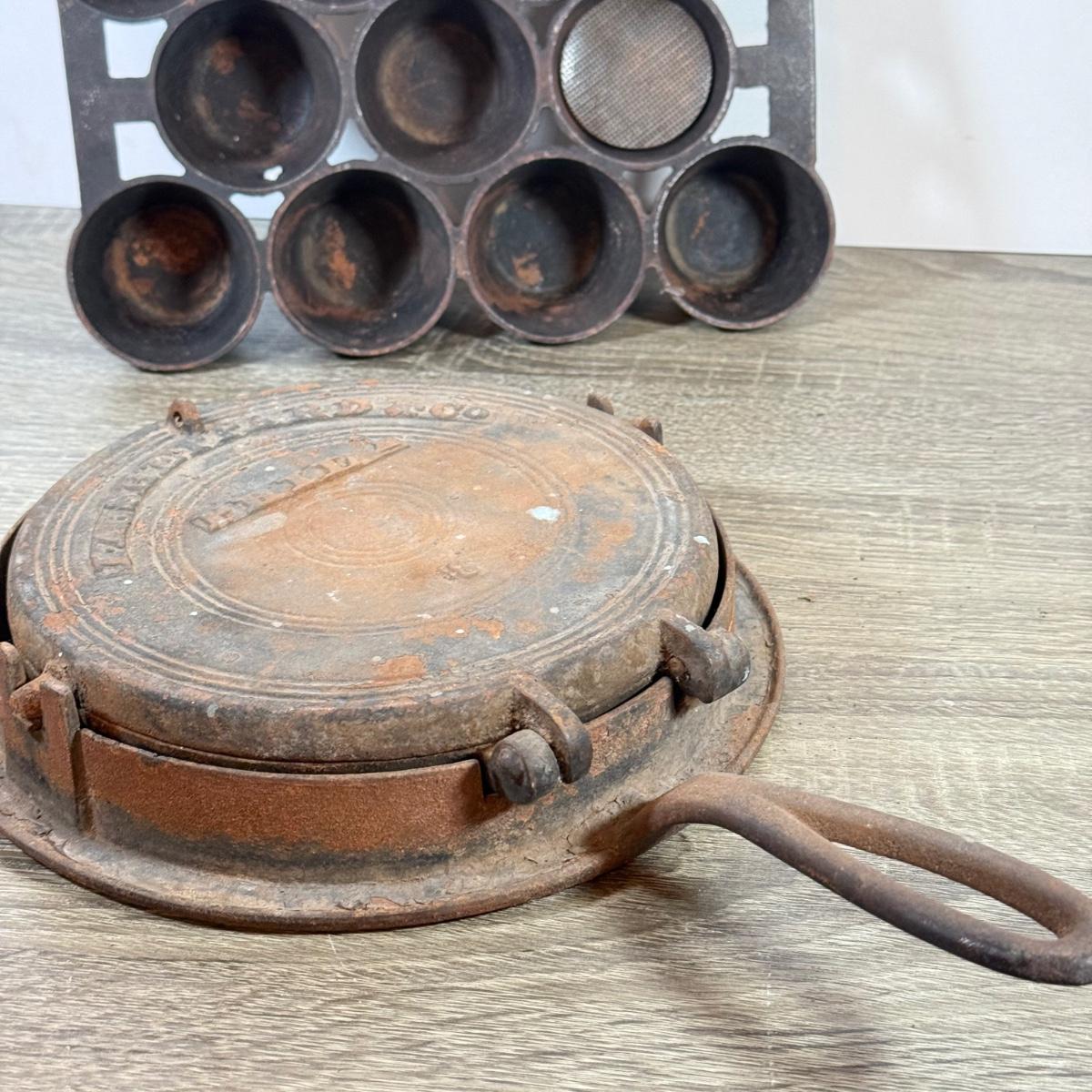 LOT 134L: Vintage Cast Iron Muffin Pan & Waffle Maker