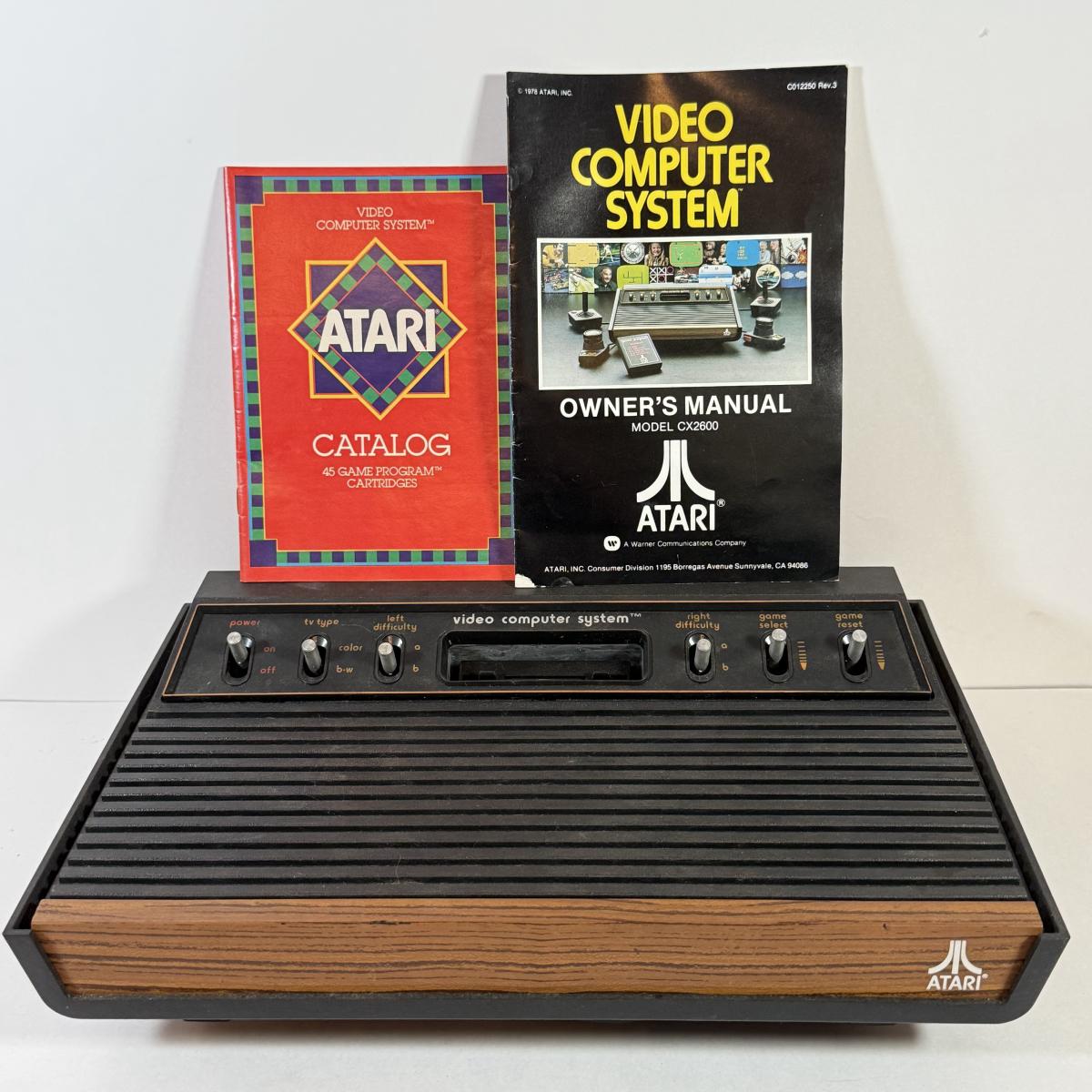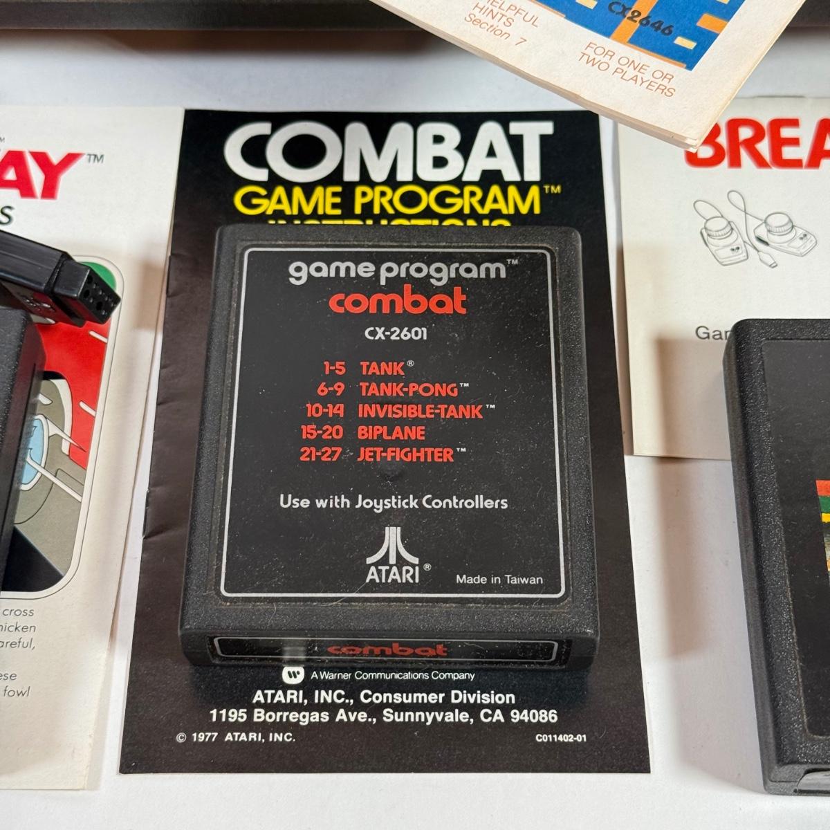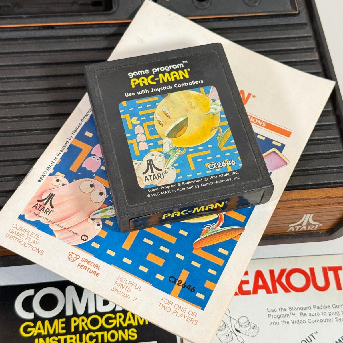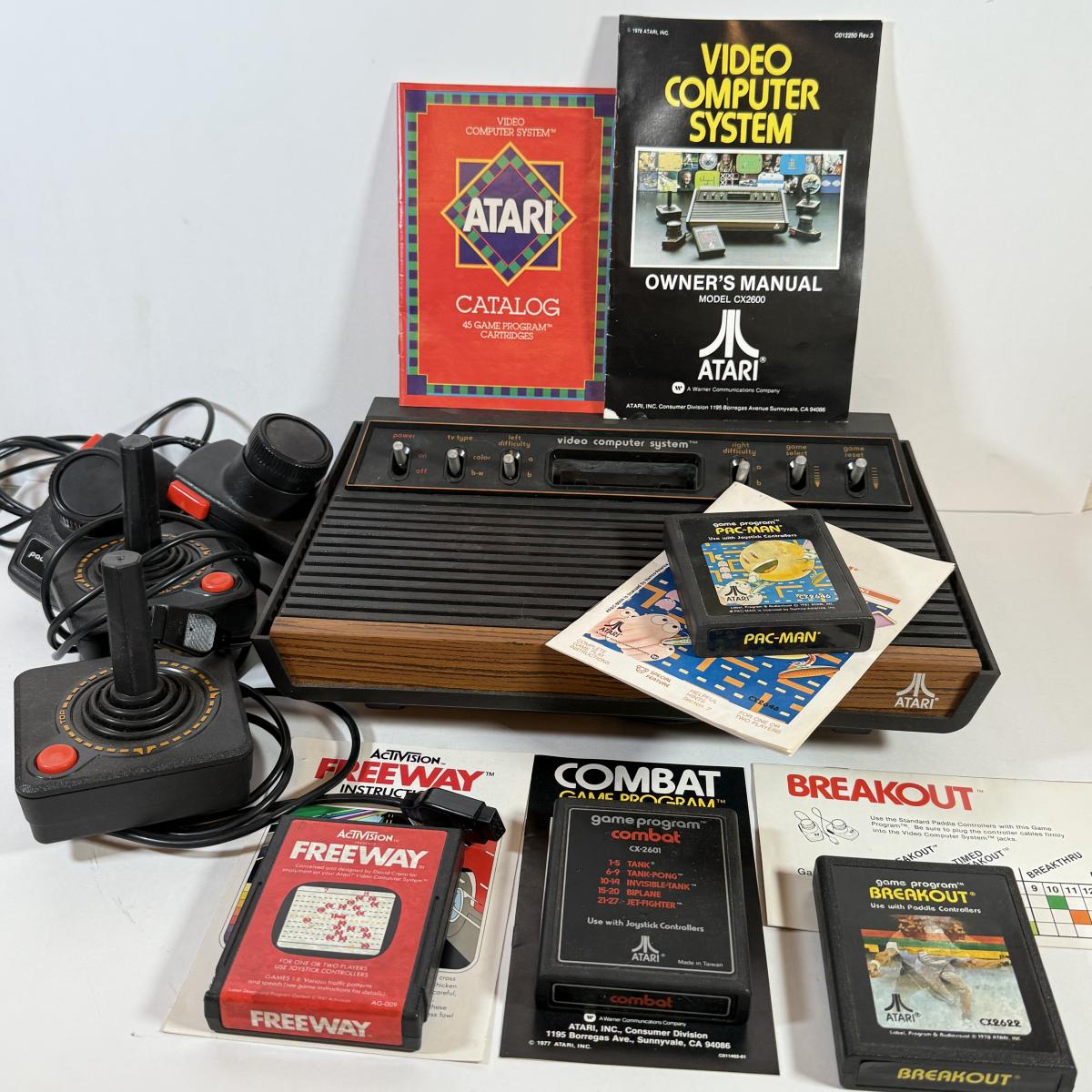 LOT 137L: Vintage 1980s Atari Video Computer System Model CX-2600 w/ Manual, 2 Joysticks, 2 Paddles, Power Cord & 4 Games w/ Booklets: Pacman, Breakout, Combat & Freeway