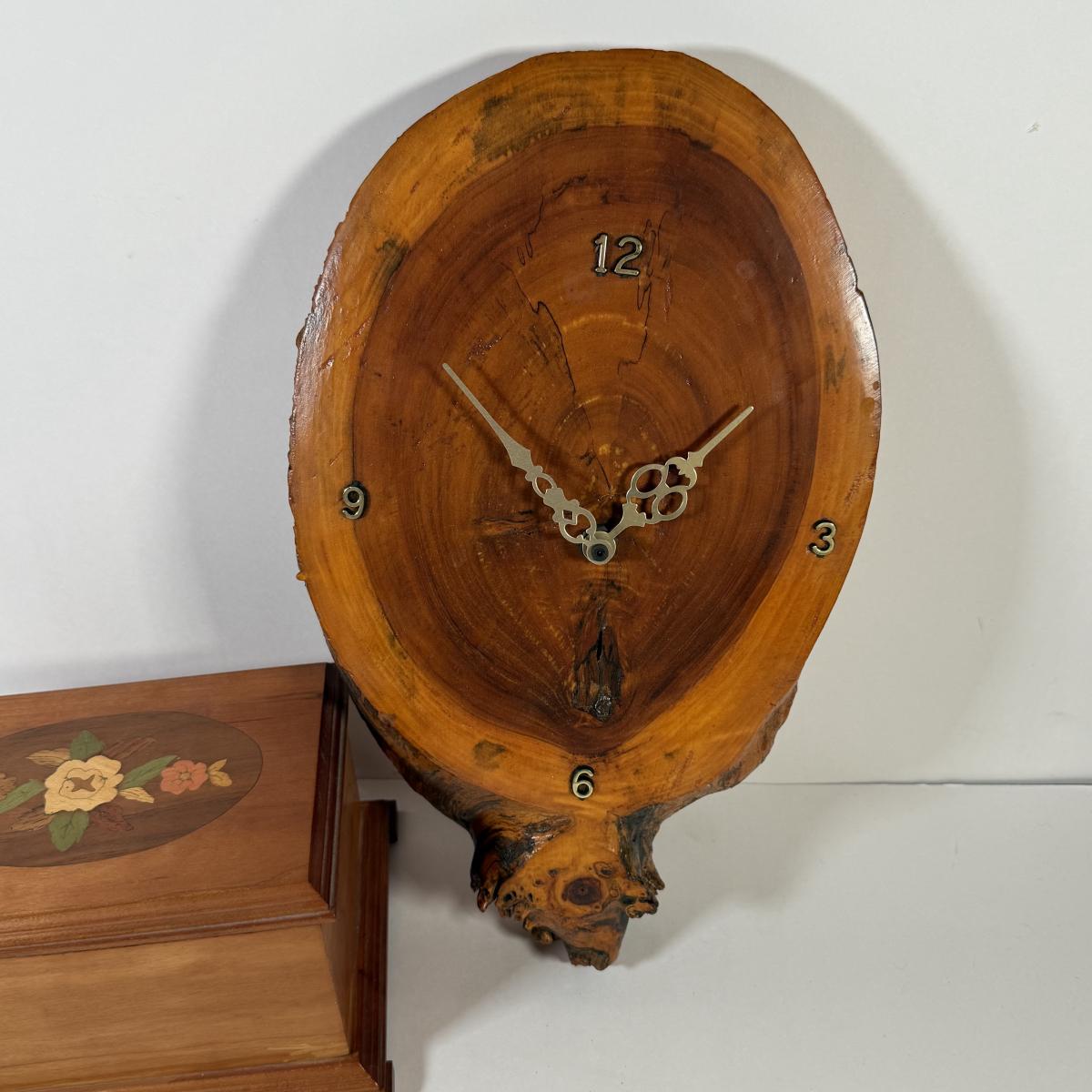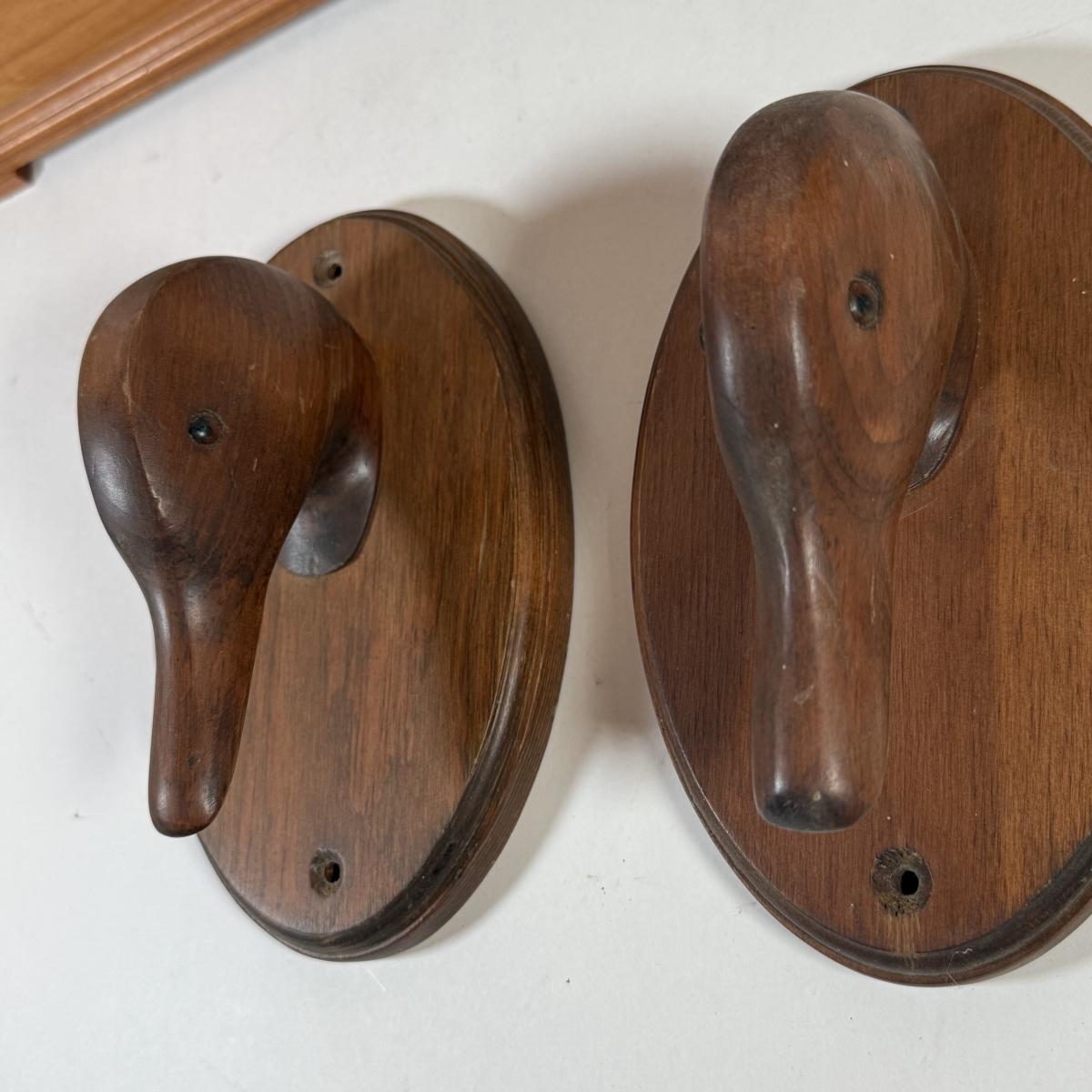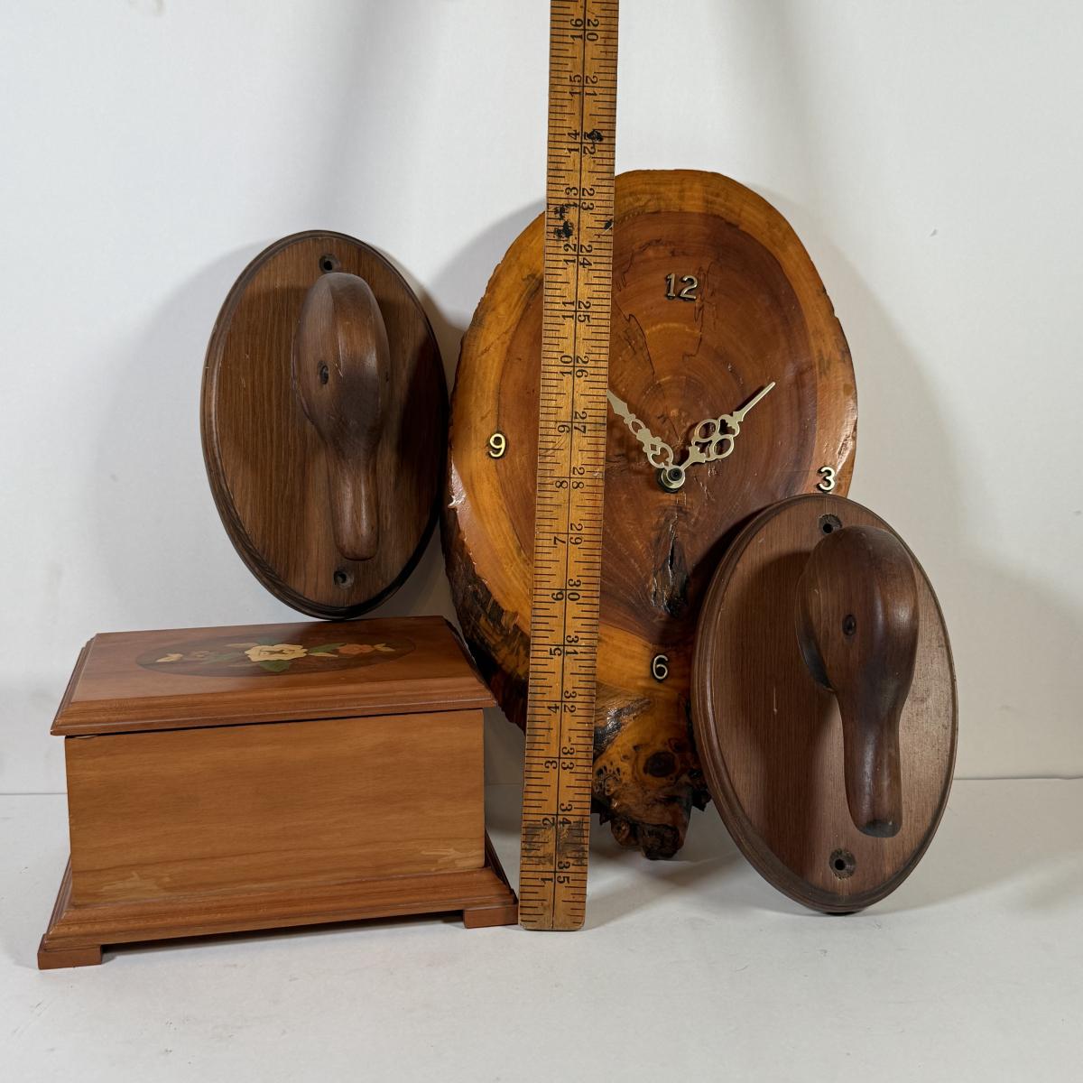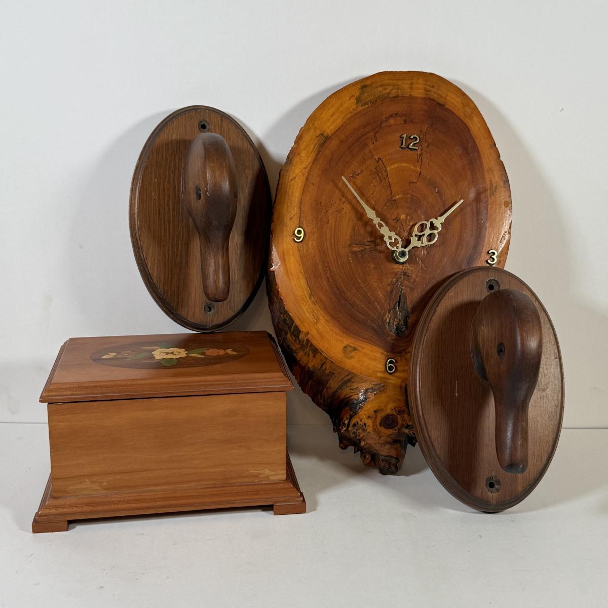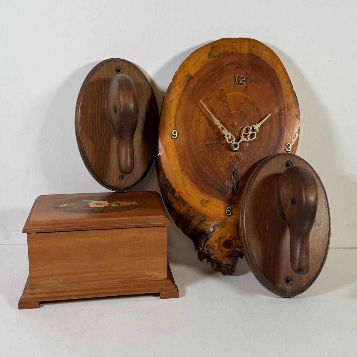 LOT 139L: Cornwall Wood Products Duck Head Wall Decor, Hand Made Wood Music Box & Raw Wood Clock