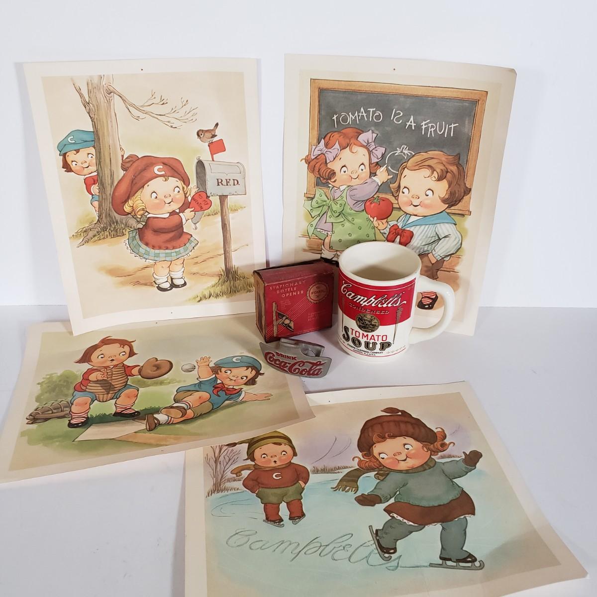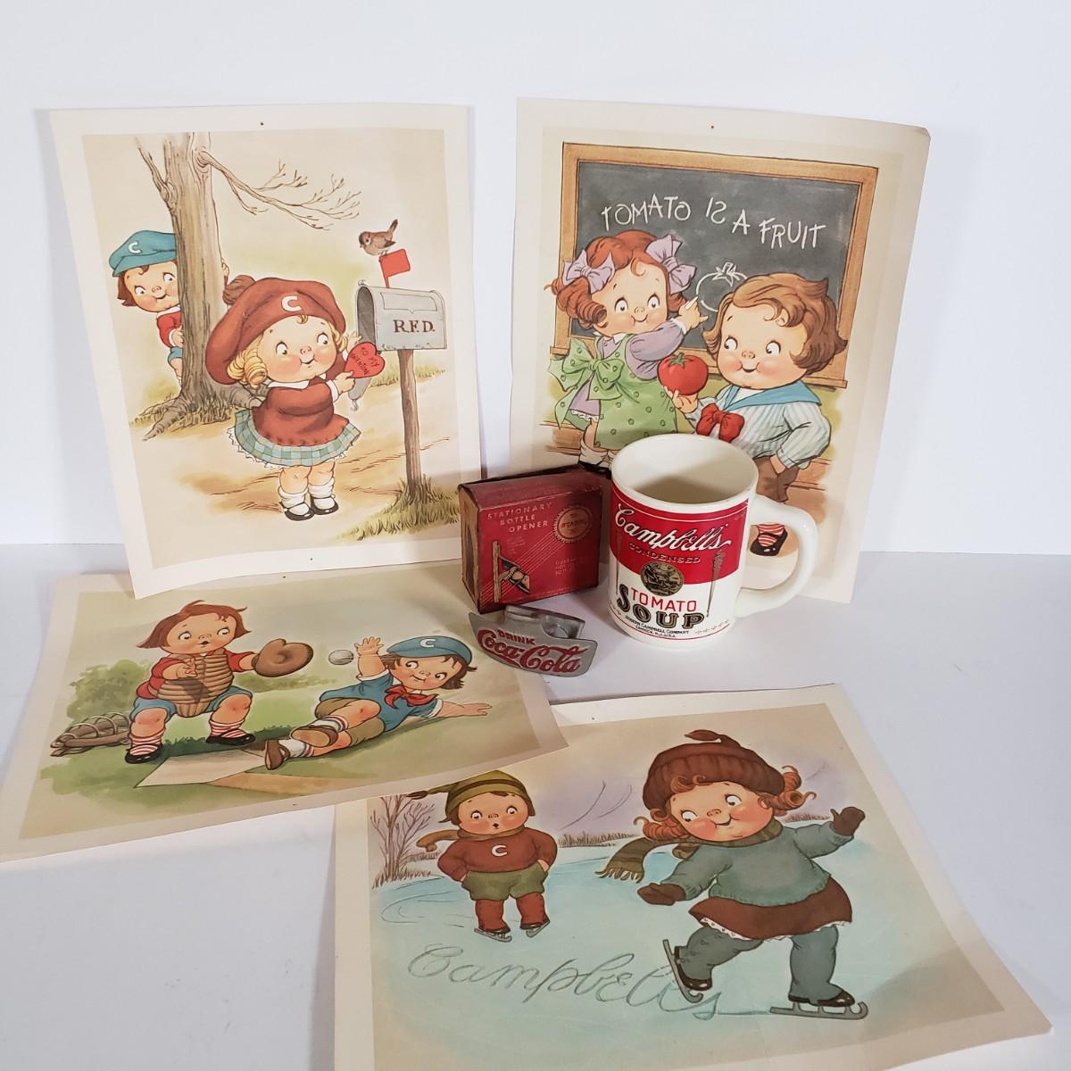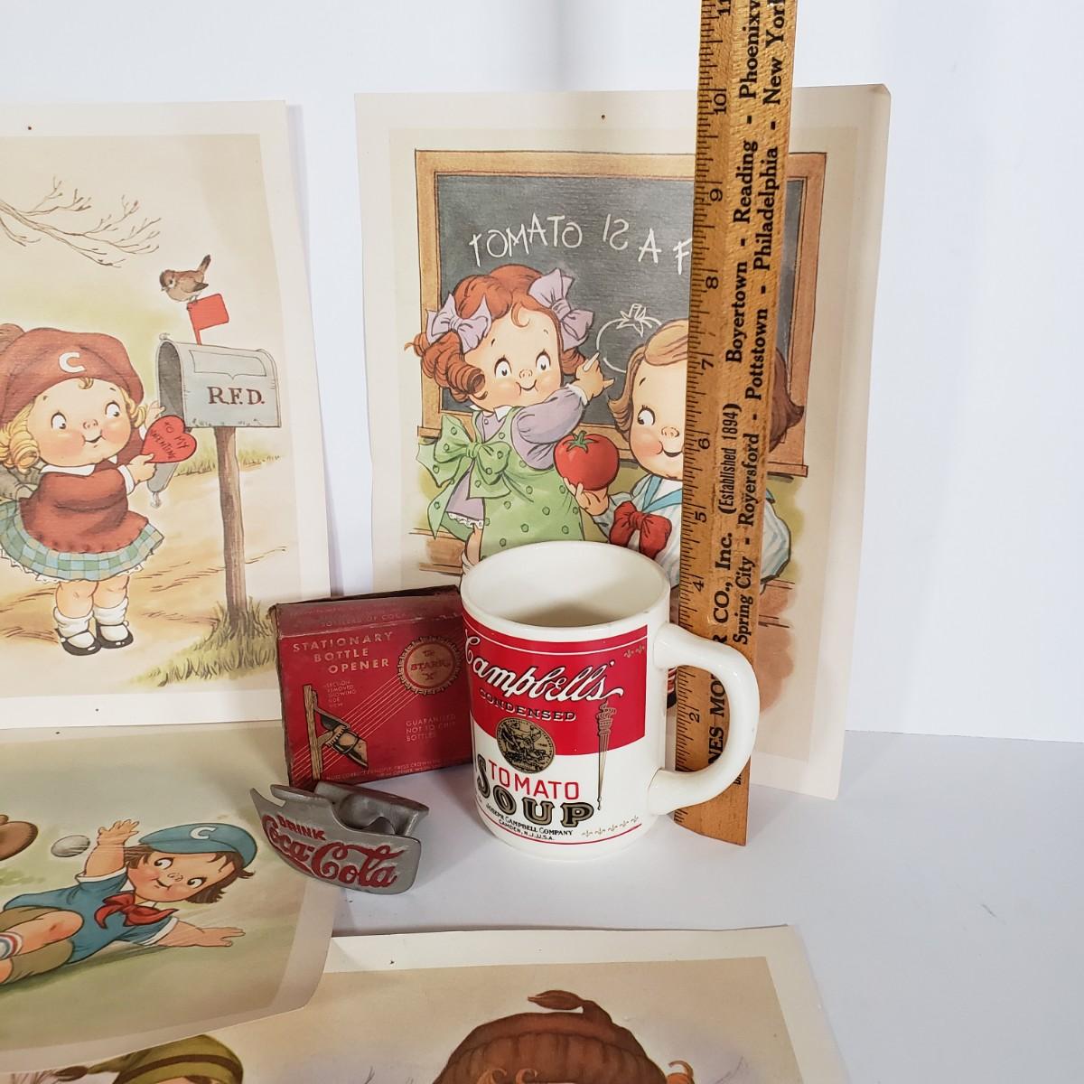 LOT 146L: Vintage Campbell's Soup Prints & Mug with Coca Cola Bottle Opener