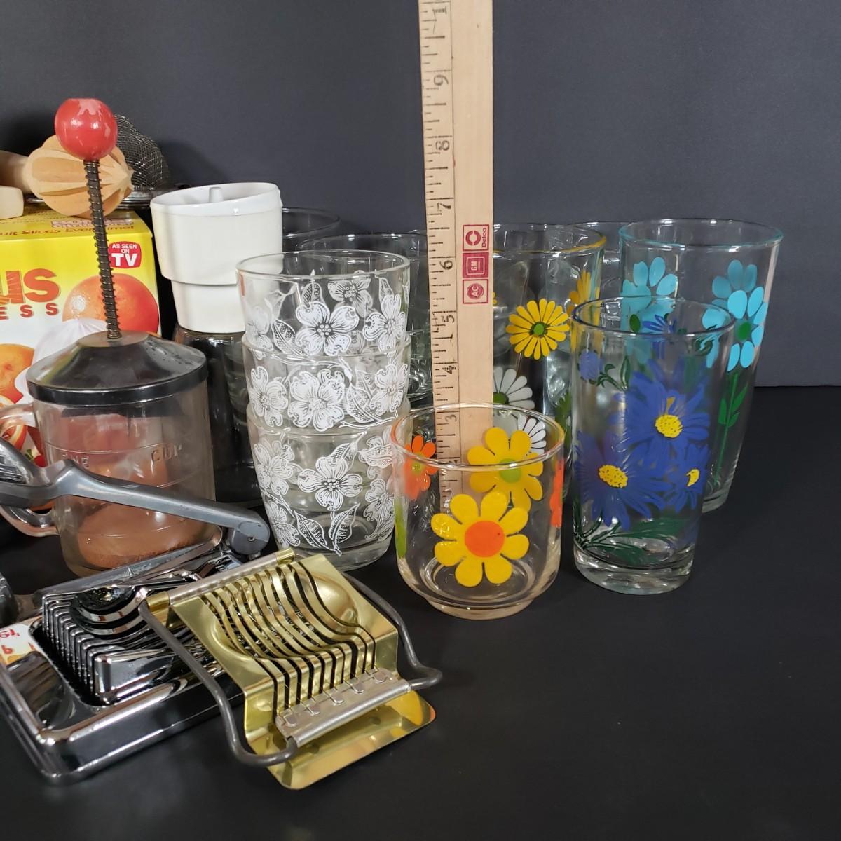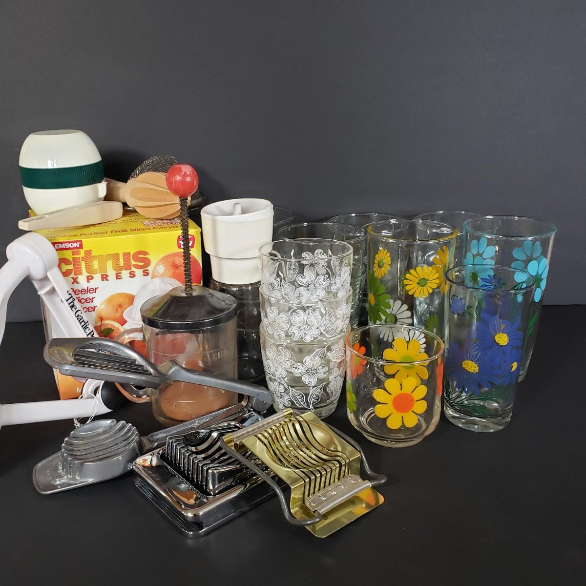 LOT 149P: Vintage Floral Glasses, Juicers, Choppers & More