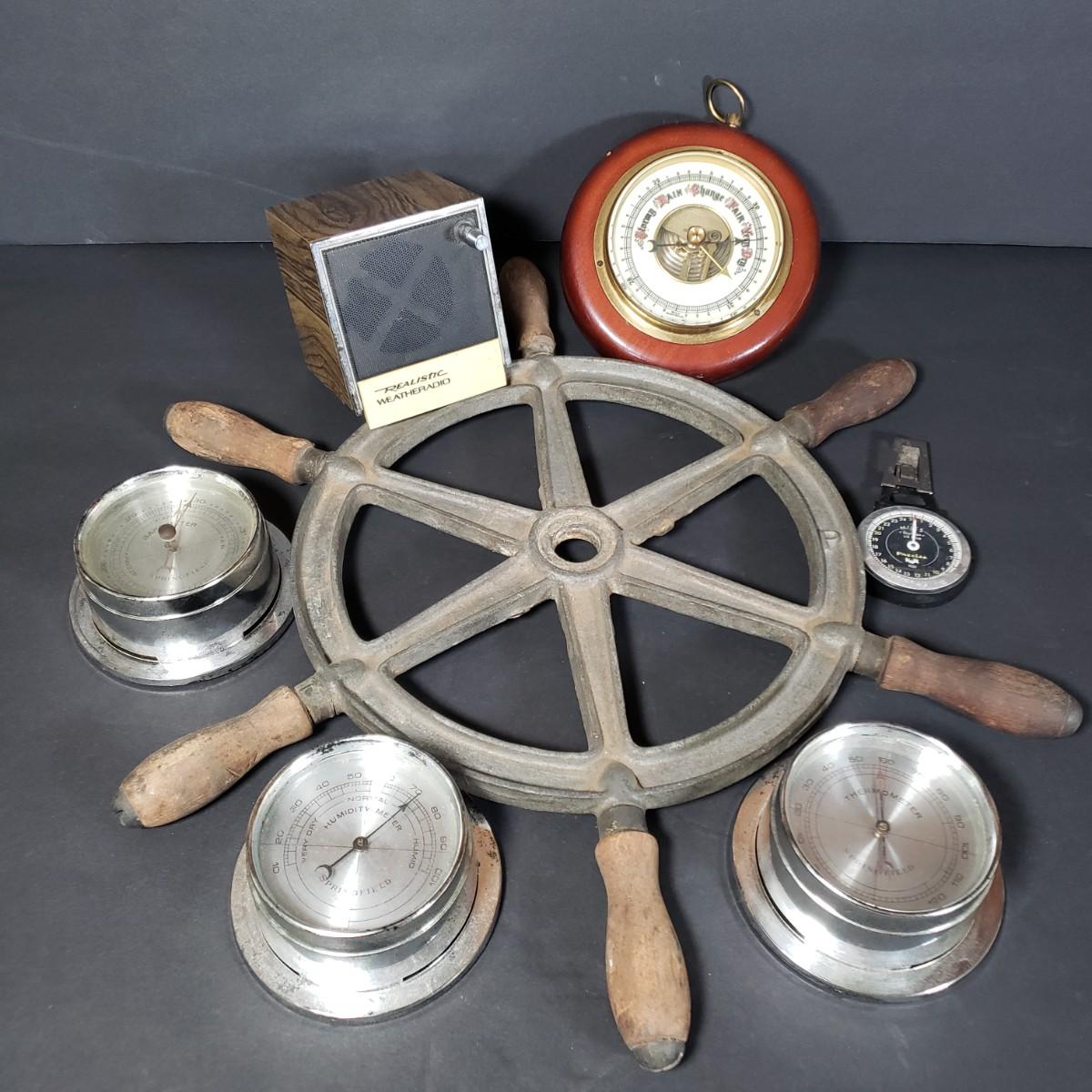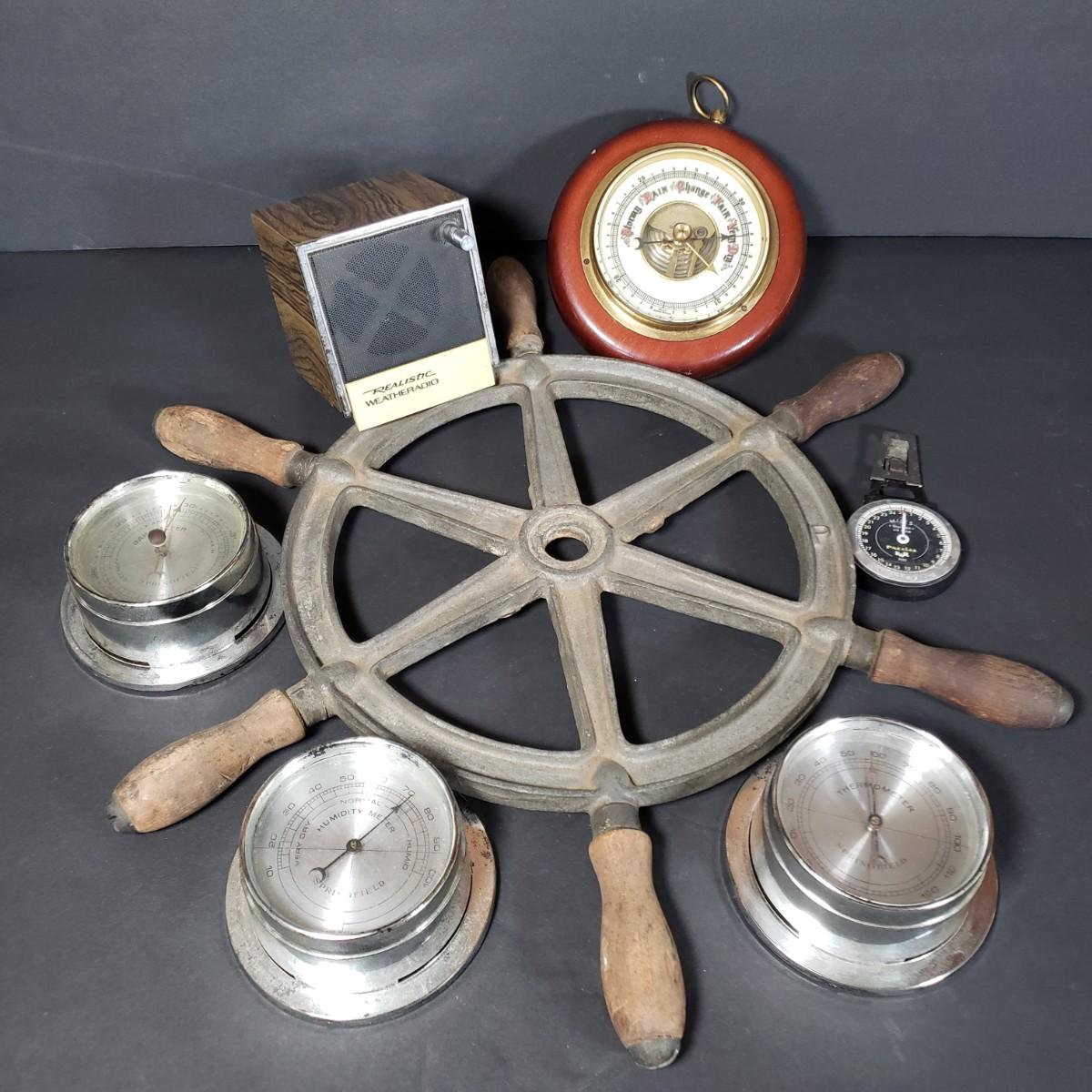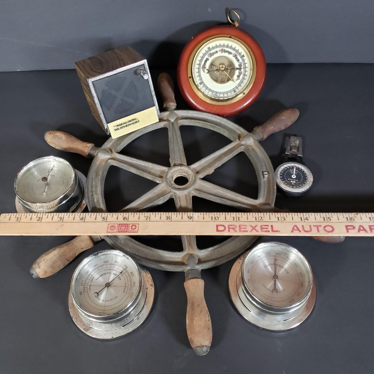 LOT 152P: Antique Metal Ships Wheel with Barometers and Weather Radio