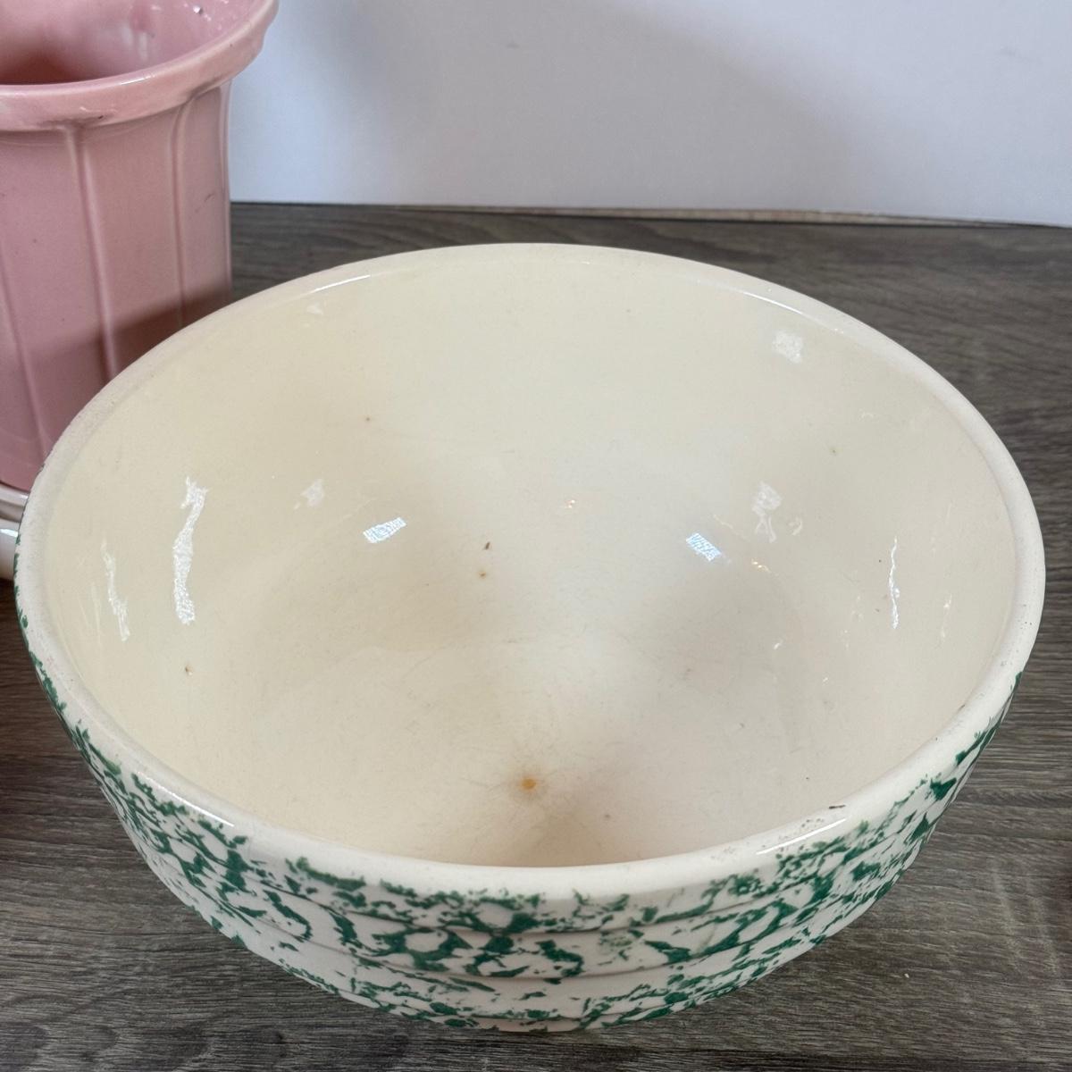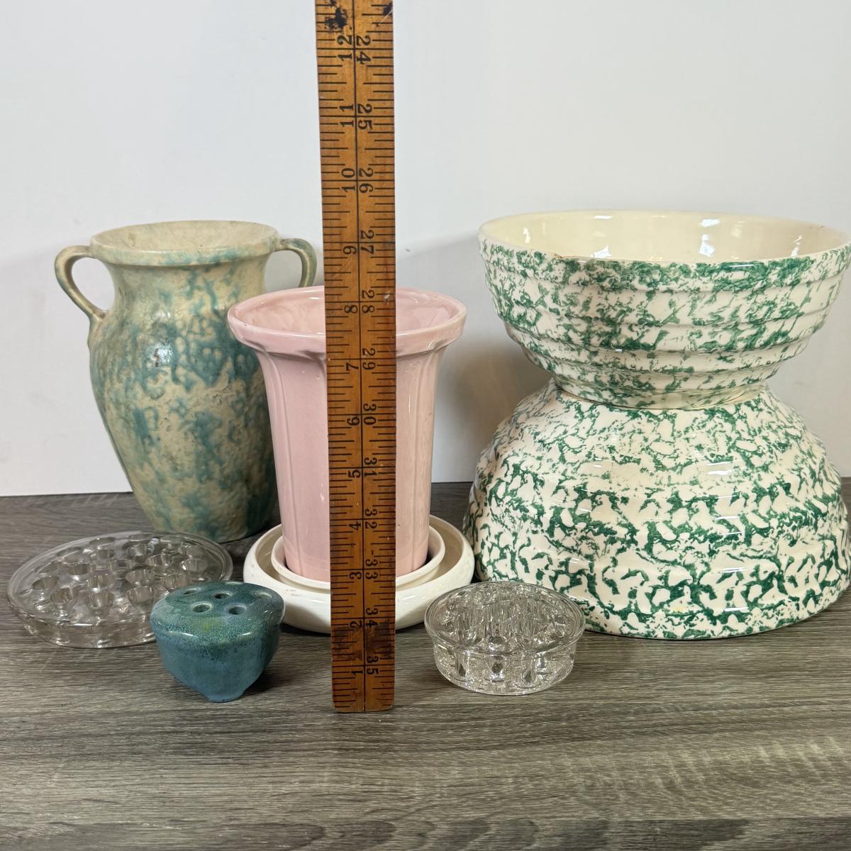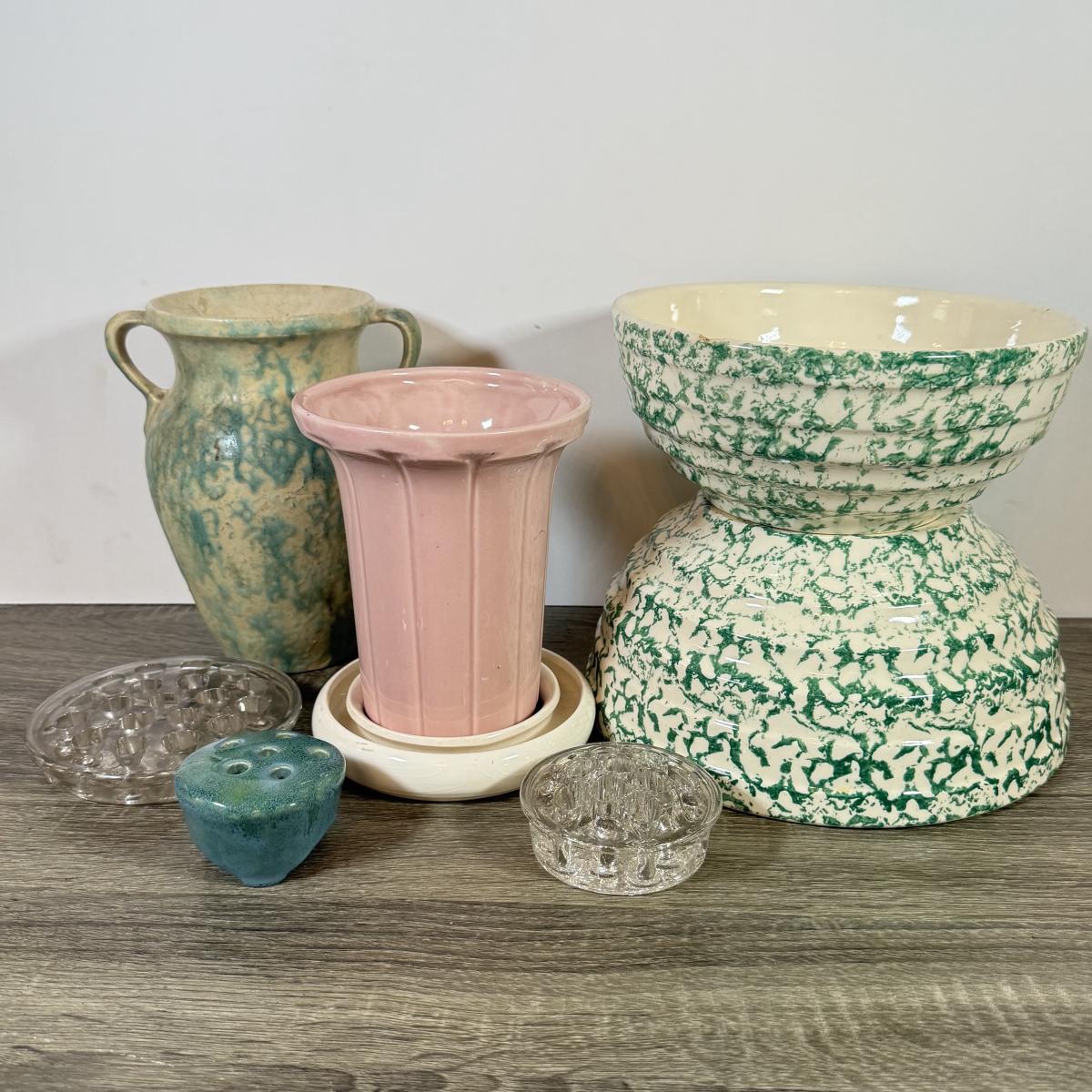 LOT 165L: Pottery Collection: Pink Vase, Double Handle Vase, Stoneware Bowls & Flower Frogs