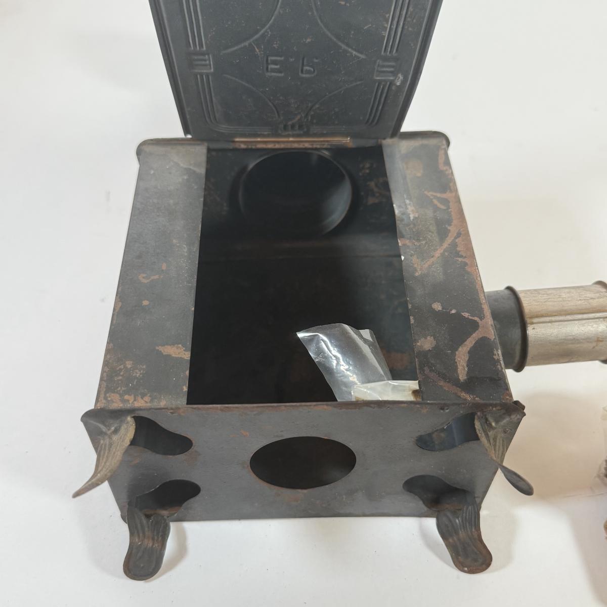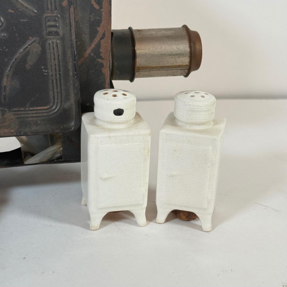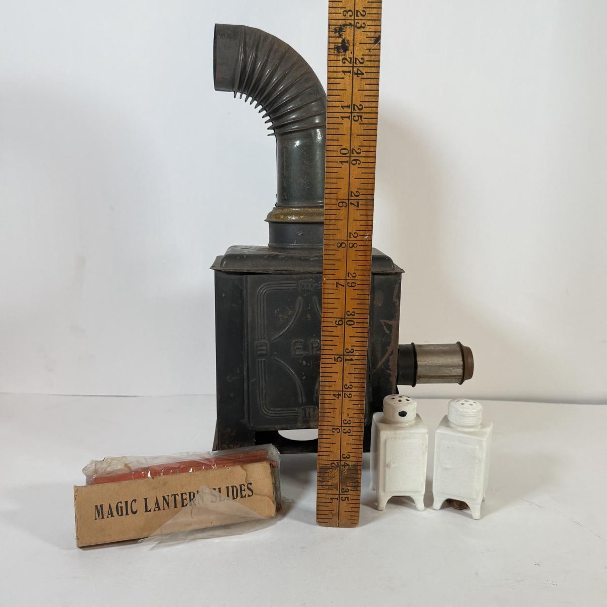 LOT 166K: Miniature Metal Coal Stove w/ Salt & Pepper Shakers and Magic Lantern Slides