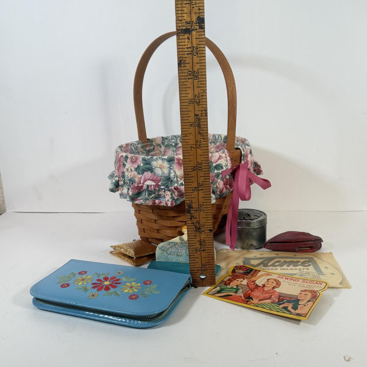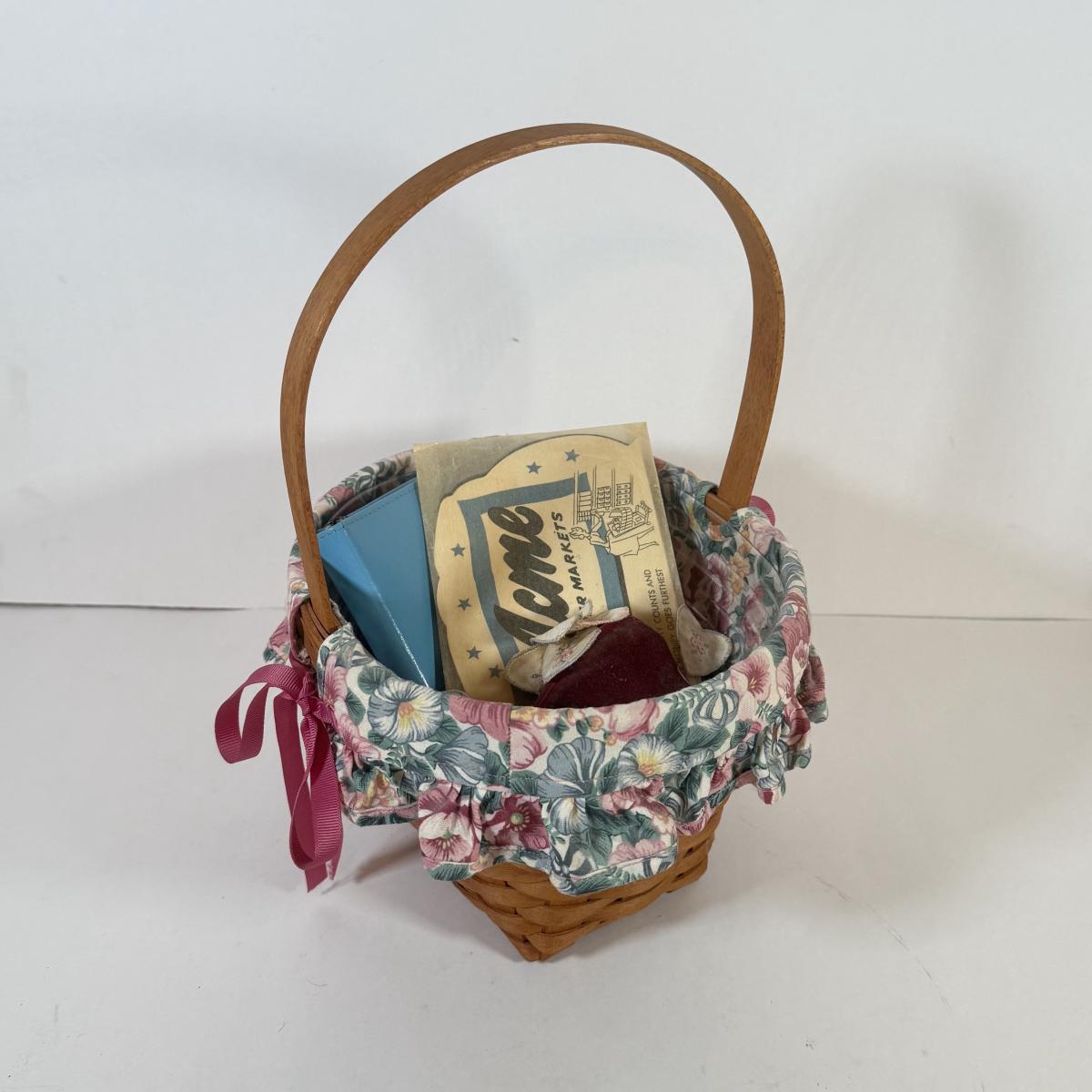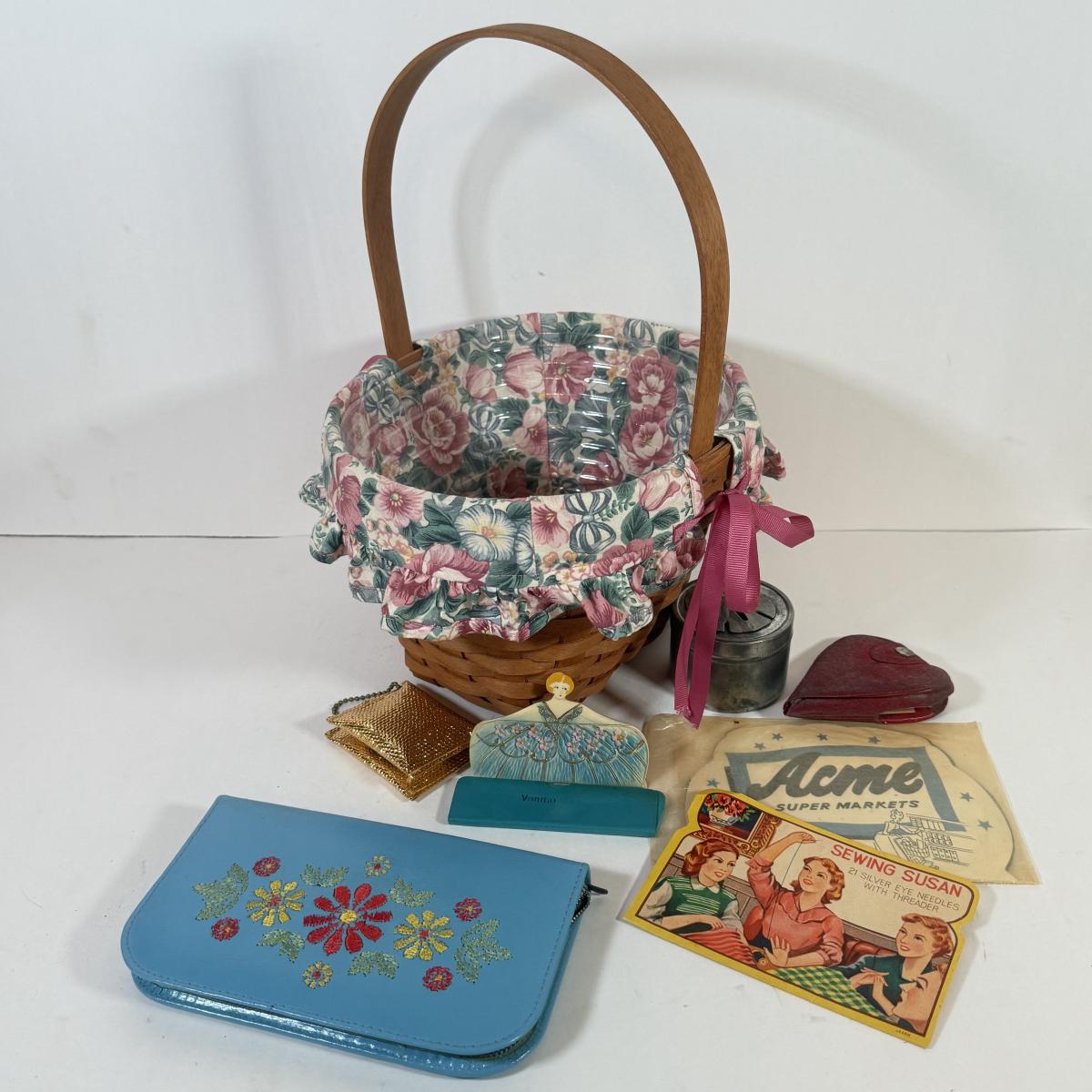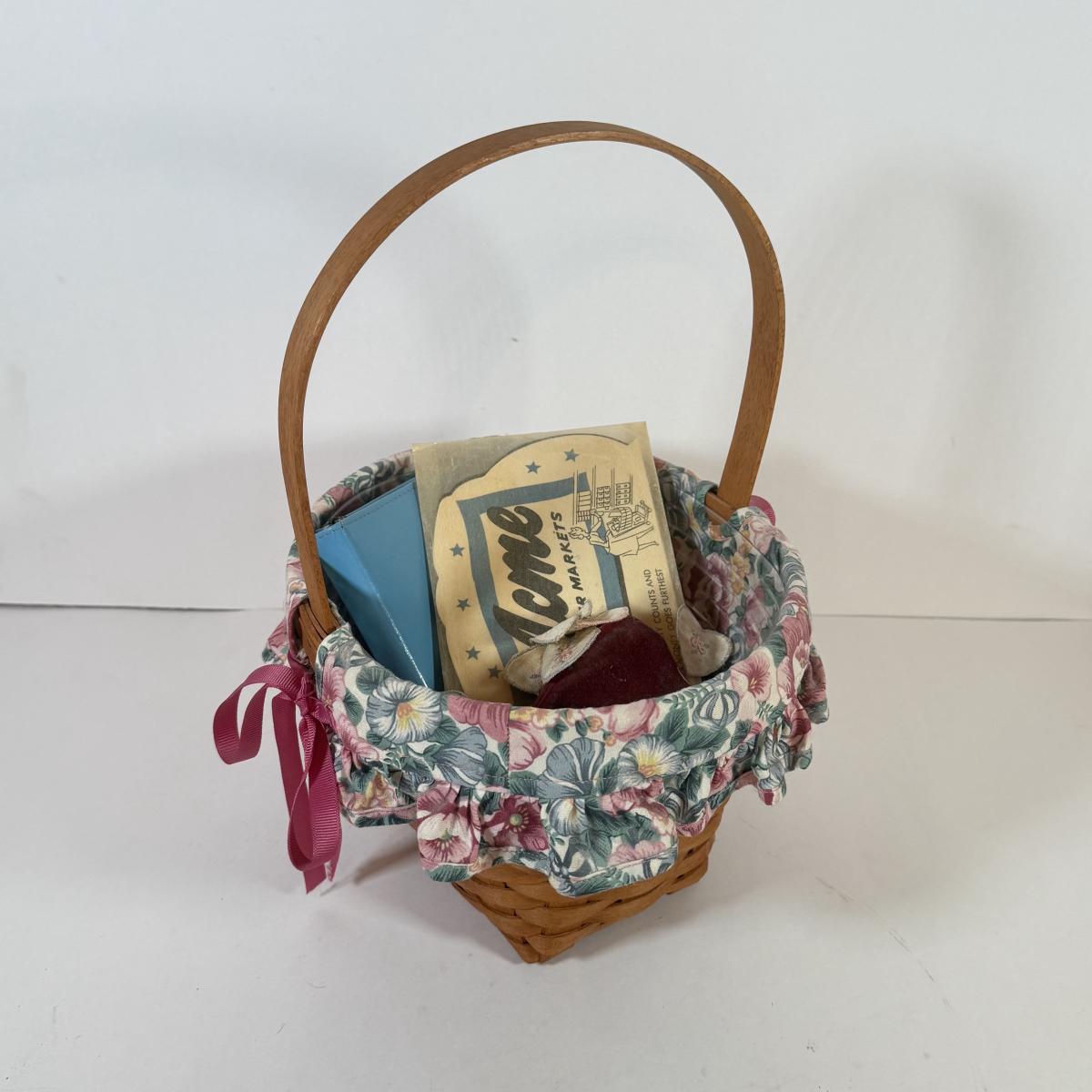 LOT 168L: Floral Lined Pink Ribbon Longaberger Basket Filled w/ Sewing Kits & Vintage Combs