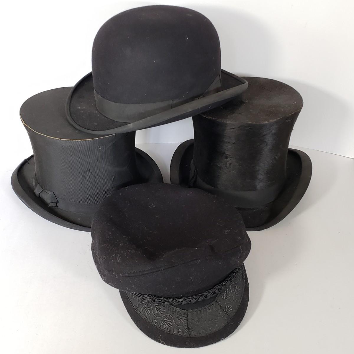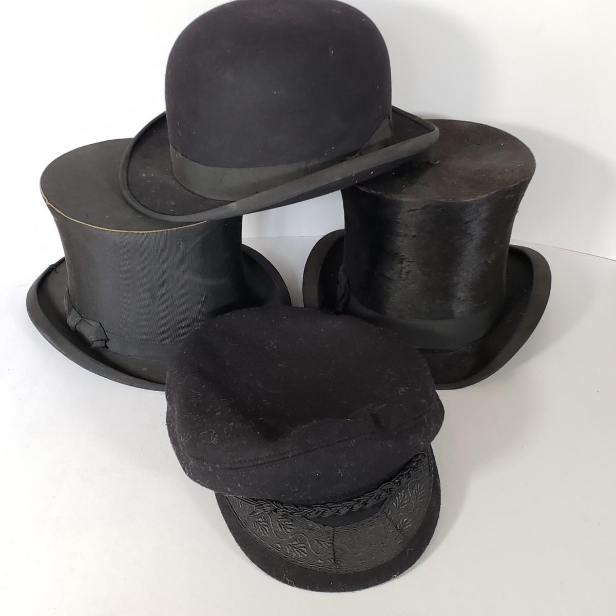 LOT 214L: Antique Collapsible Young Bros Top Hat, Dunlap & Co, Penn Craft Bowler Hat, Greek Fishermans Cap